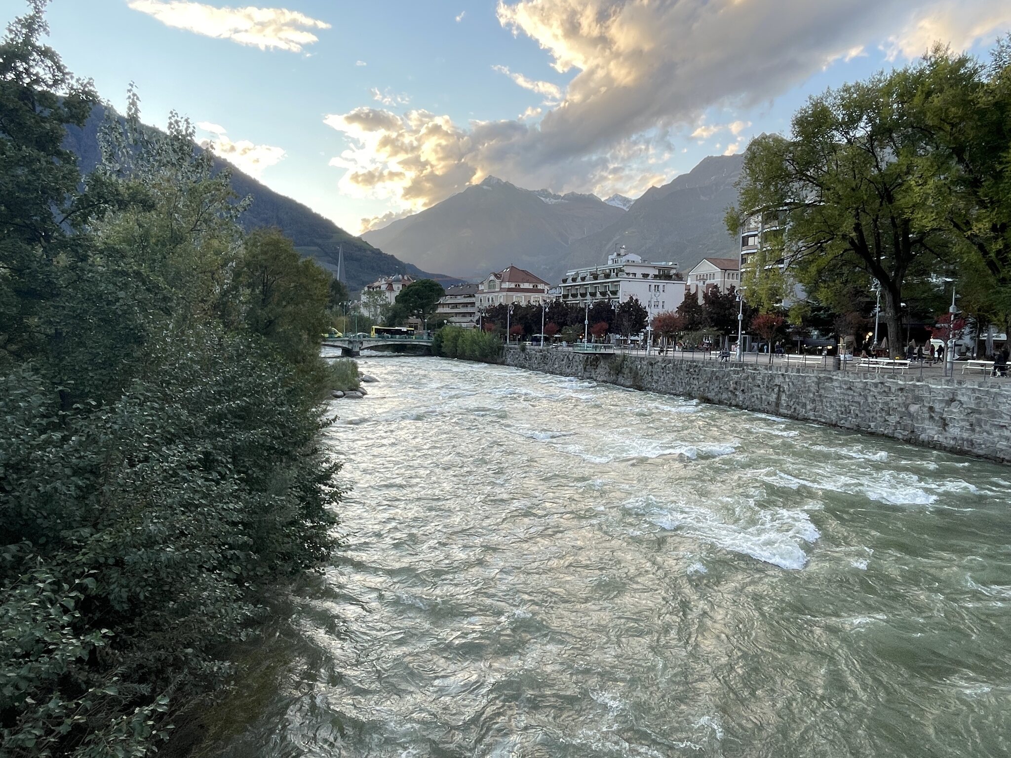 Umsteigeknoten Bahnhof Mals. Ab hier fahren Busse in viele verschiedene Richtungen sowie die Bahn Richtung Meran. Hier mussten wir das erste Mal ein Ticket kaufen: Mals - Meran. Kosten: 17 Euro für zwei Personen. Sehr human. Der Zug nach Mals. Wir hatten jedoch nur eine Komposition, nicht wie hier fotografiert zwei. Da viele Reisende unterwegs waren, wurde es im Zug durchaus kuschelig eng. Vorbei an unzähligen Obstplantagen verläuft die Strecke durch das Vinschgau: Meran kommt in Sichtweite: Vom Bahnhof in Meran bis zu unserem Hotel dauerte der Fussmarsch etwa zehn Minuten. Unsere Unterkunft liegt unmittelbar an der Passer, die zur Zeit ein tosender Fluss ist: Nach dem Einchecken - wir konnten bereits um 12:30 Uhr ins Zimmer - und einer kurzen Siesta machten wir einen ersten Spaziergang durch die Stadt. Folgend einige Eindrücke aus Meran: