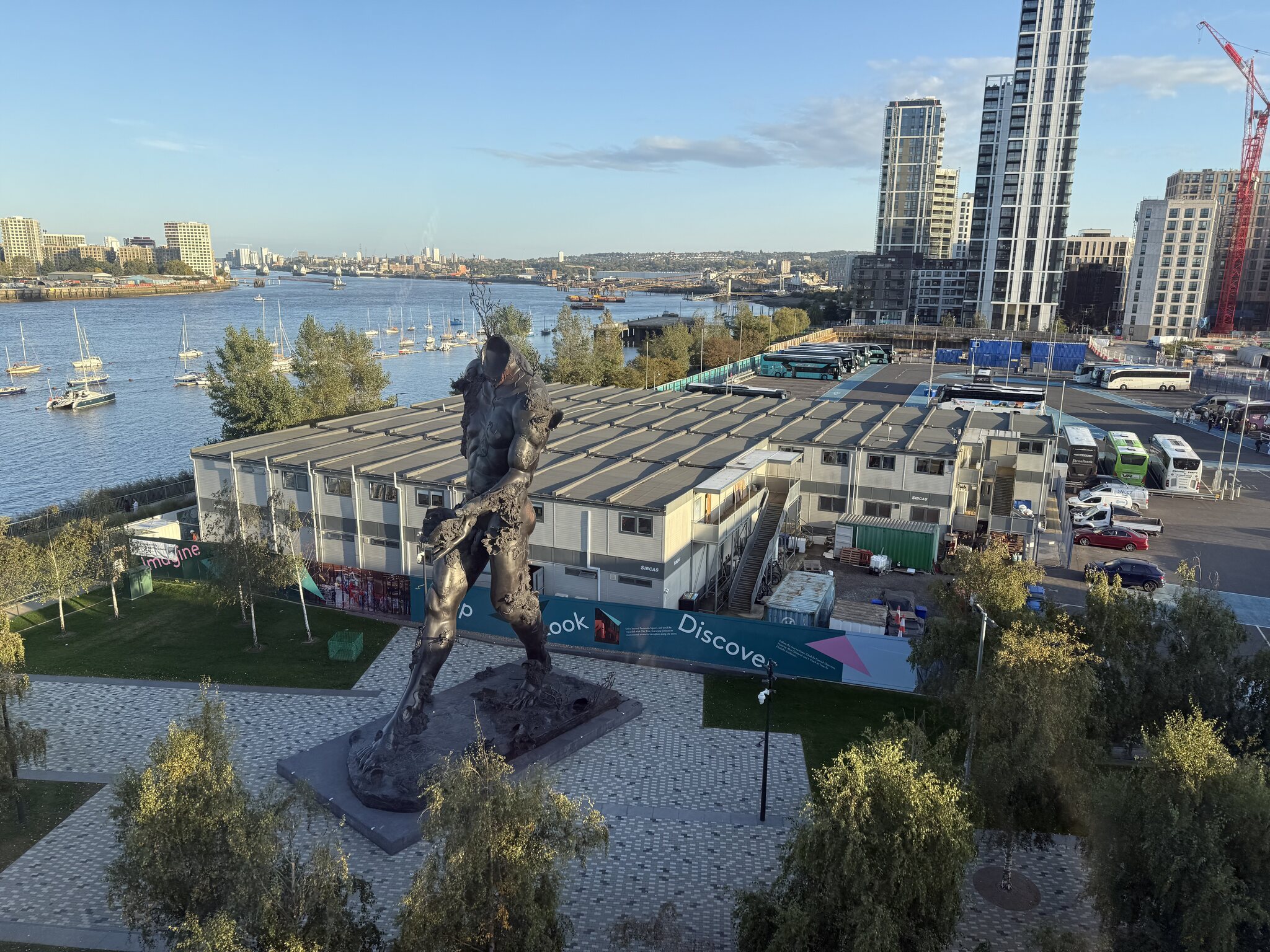 Direkt am Anfang geht es hoch auf 90 Meter, vorbei an einer kopflosen Statue, die Teil der Kunstinstallation "The Navigators" von Philip King ist und 1987 geschaffen wurde: