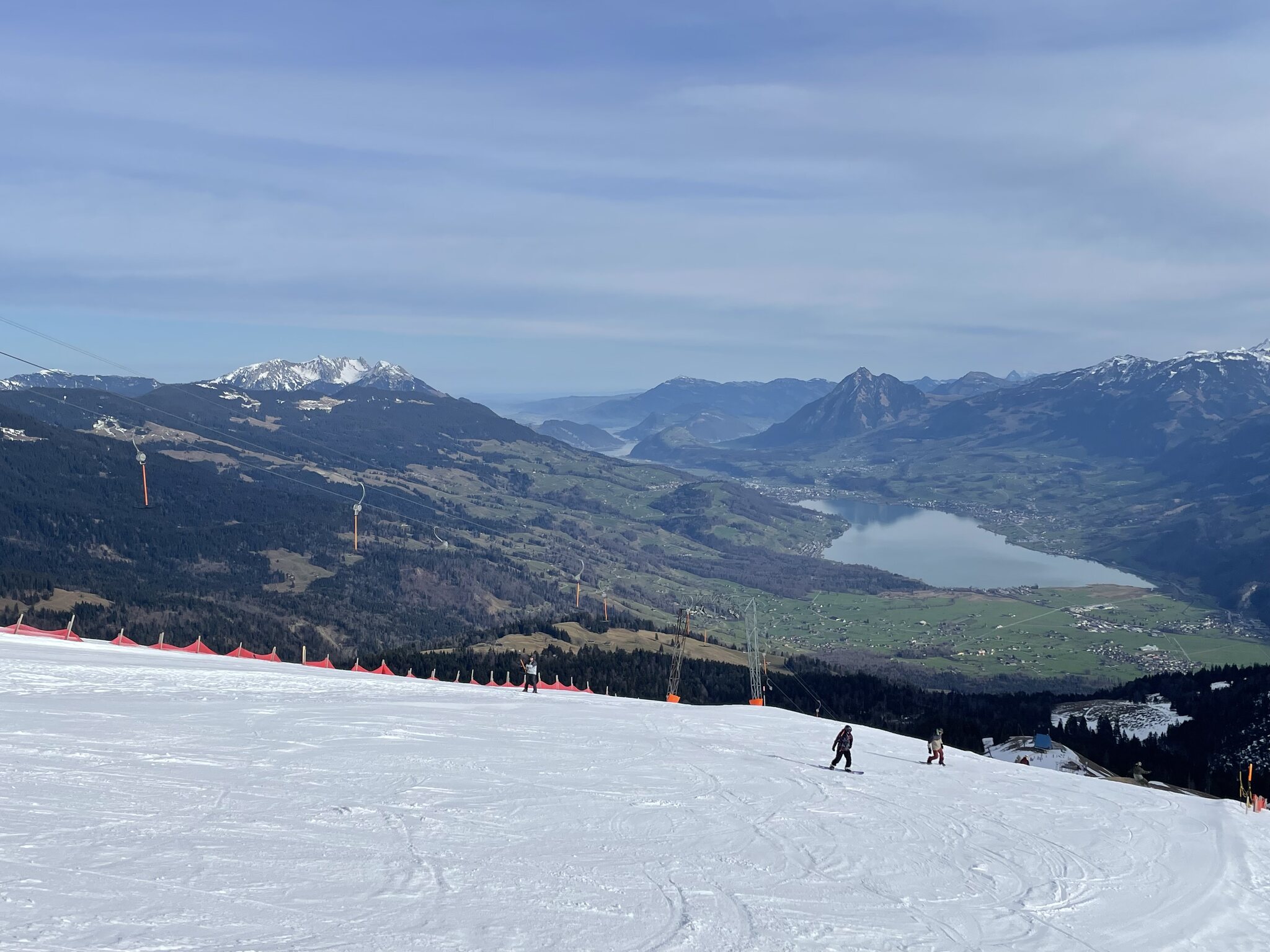 Das sind die einleitenden Worte der Bahnen und dies kann ich grossteils unterstreichen. Die Aussicht ist etwas ganz spezielles, man hat Blick auf die Obwaldner Ebene mit Sarner- und Alpnachersee, der Pilatus dominant im Bild und weiter hinaus aufs Flachland. Die Anordnung der Hauptanlagen der 3er-SB Wand sowie dem SL Alpoglerberg in einem beinahe Rechtenwinkel ermöglicht eine Vielzahl an Abfahrten. Besonders der Skilift auf den Gipfel des Alpoglerberg auf 1'837 müM hat sehr schöne Pisten zu bieten. Der SL Mörliegg gegenüber war leider bei meinem Besuch geschlossen wegen Schneemangel.