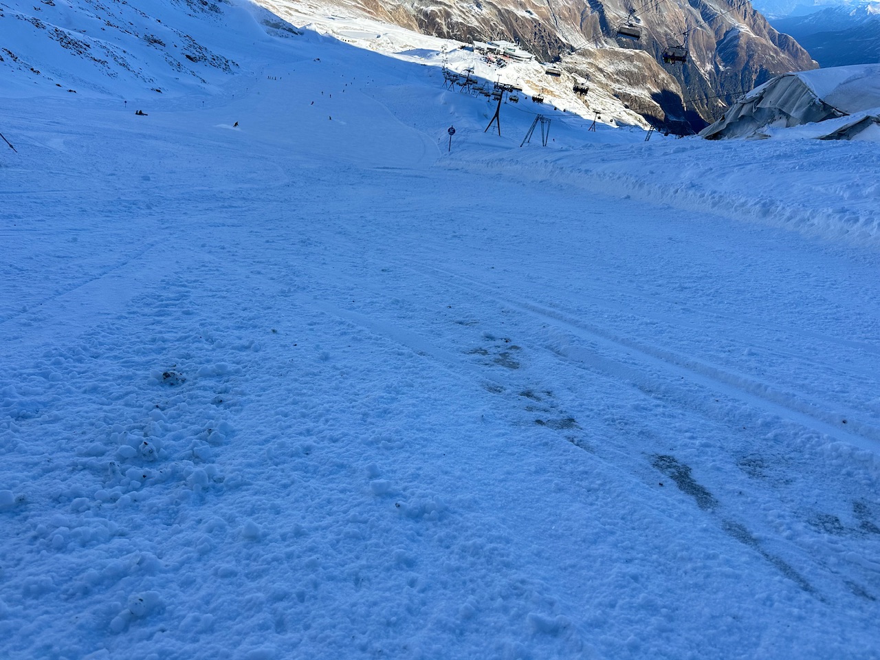 Zum einen war es wellig mit Absätzen, zum anderen war der Neuschnee recht schnell zu weichen Haufen zusammengefahren in Kombination mit Eis, welches darunter vorkam.
