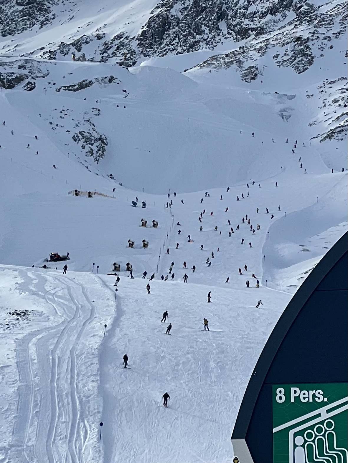 Uf das sind ja krass vieleLeute auf der einen Piste.