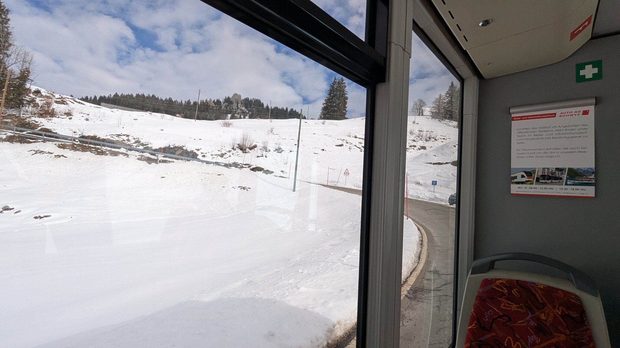 Ein Blick auf die bushaltestellen und den Fahrplan zeigt, dass ich Glück habe und genau den Bus erwischen könnte, der aktuell nur etwa alle drei Stunden fährt. Da meine Firma sogar als benefit alle nahverkehrstickets weltweit kostenlos für mich übernimmt, sind mir auch die sieben Franken kein Dorn mehr im Auge. So entscheide ich mich also nun doch die Piste Richtung Handgruobi herunterzufahren, und mit dem Bus wieder zurück zur Passhöhe Ibergeregg zu fahren.