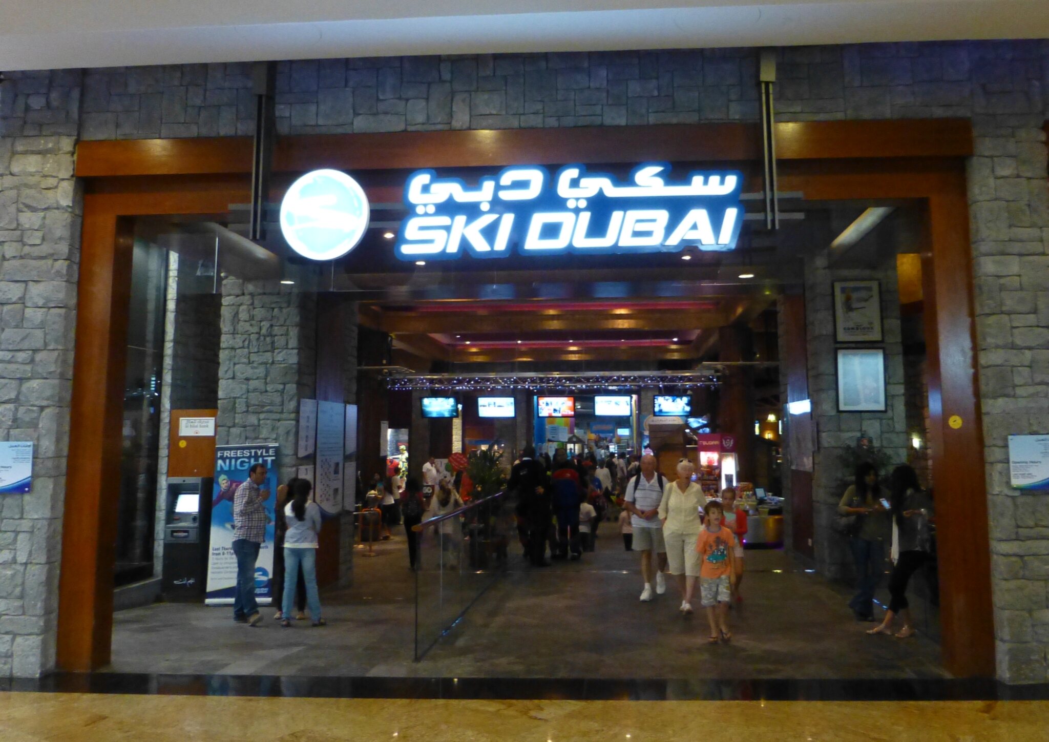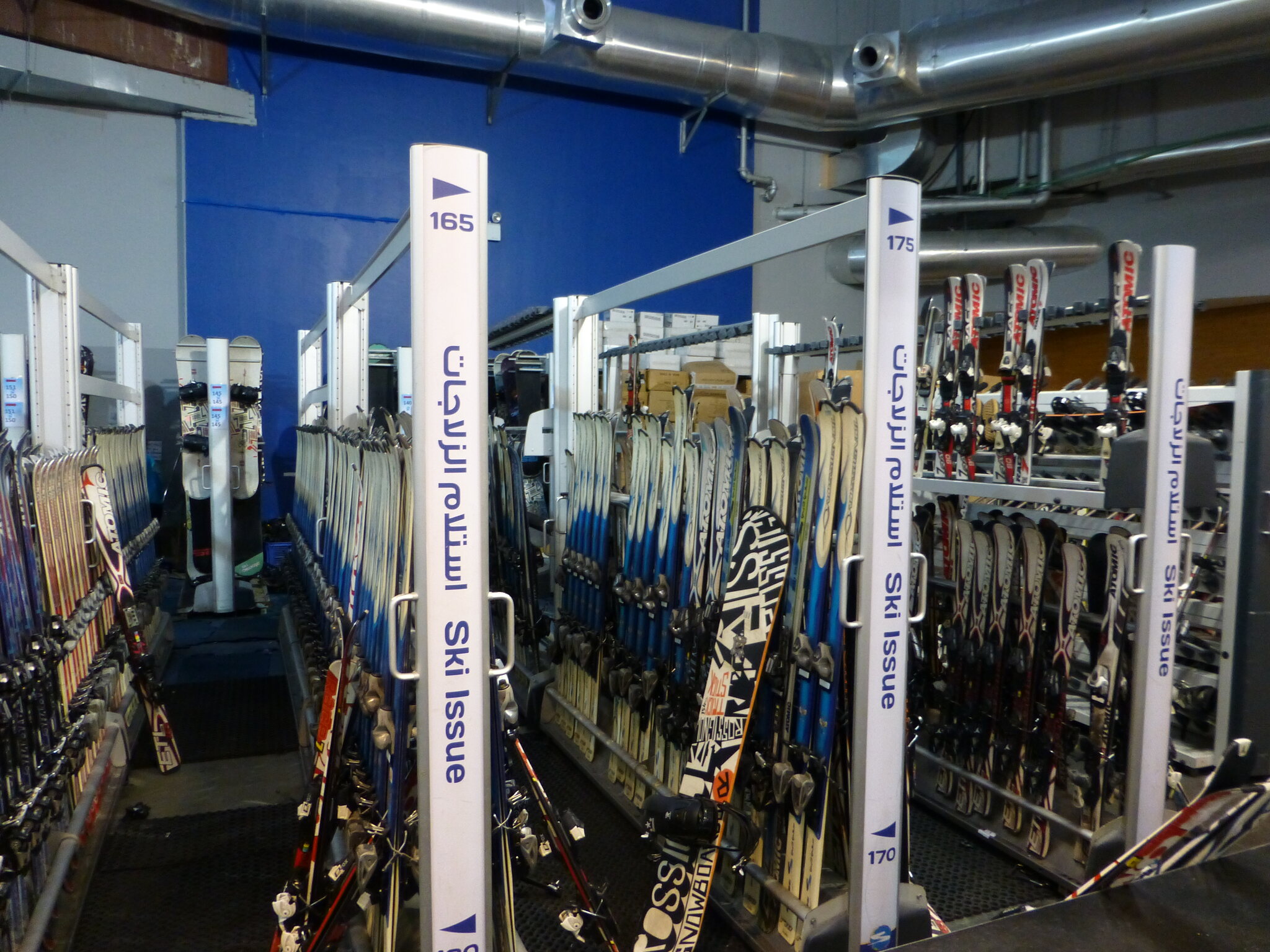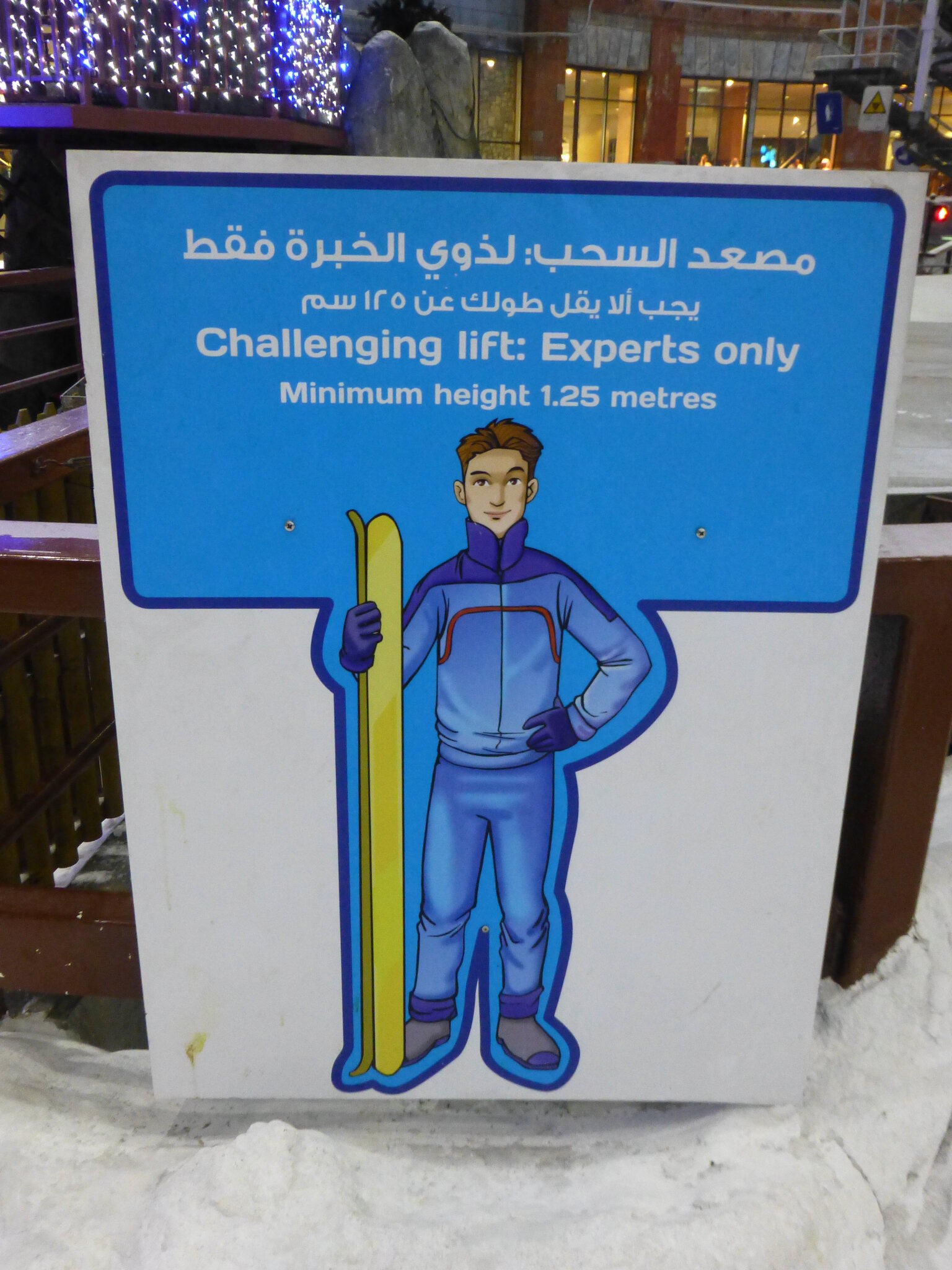 Ich habe ein Ticket für 2 h gelöst, die 220 AED entsprachen glaubs damals ca. stolzen 60-70.- CHF, aber beinhalteten wenn ich mich recht entsinne auch die Miete von Skiern und Schuhen sowie Überziehhosen-/jacke. Socken, Mütze und Handschuhe müsste man kaufen, daher hatte ich die dabei. Bzgl. Helmen bin ich nicht mehr sicher Miete, Skischuh-Anprobieren und Einstellung der Skibindungen ging ruck-zuck, dazu noch ein kurzer Schwatz mit dem netten Angestellten dort. Er sagte mir, er sei aus Kaschmir… und ich erzählte aus der Schweiz... worauf seit Fazit war, dass er mir dann nicht weiter erklären muss, wie man Ski fährt und die Anlagen benutzt.