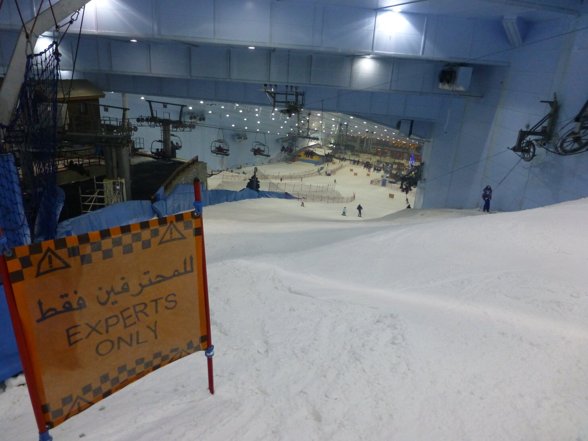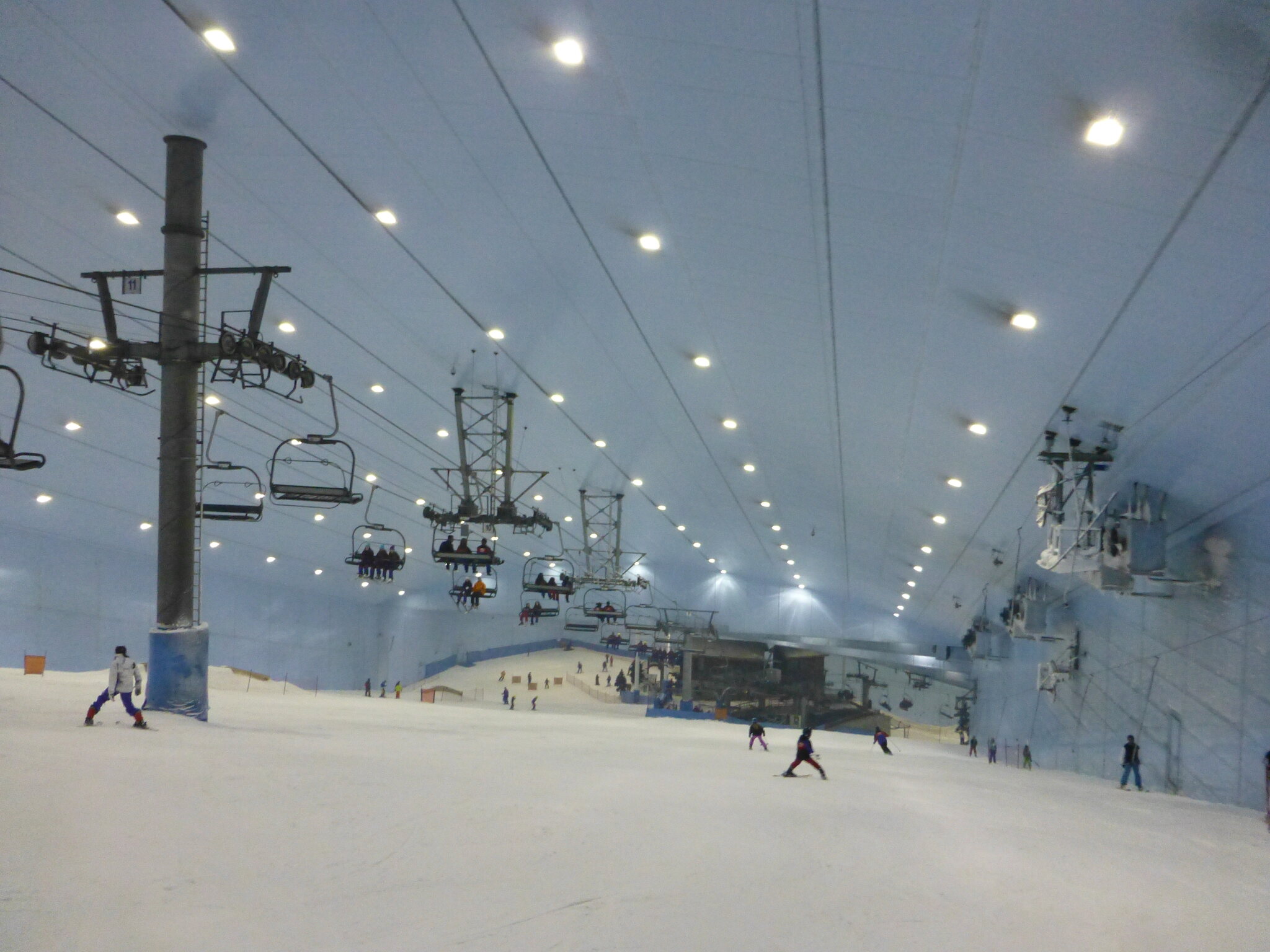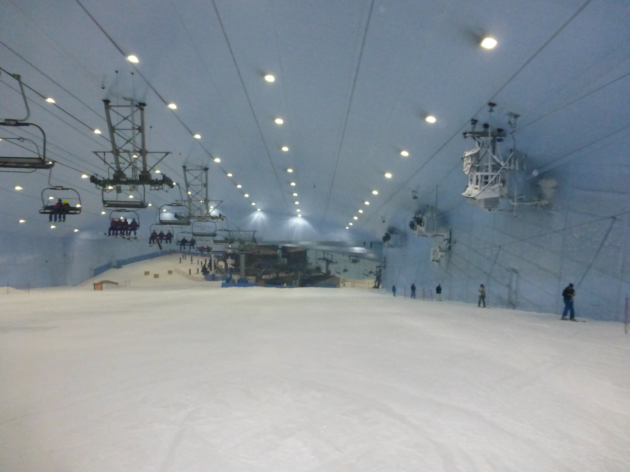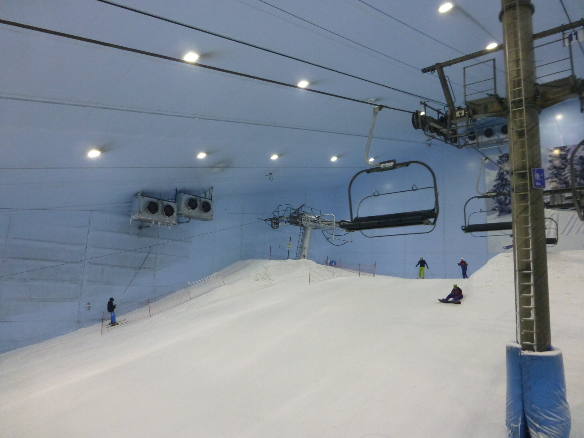 Anyway, was ich nie vergessen werde, ist meine damalige Überraschung über die hervorragend Schneequalität und Pistenpräparation in der Skihalle von Dubai. Konstante -1°C oder so waren wohl ideale Bedingungen für den Kunstschnee dort. Und die Halle scheint wohl gut gegen die Hitze draussen isoliert zu sein, da Ganzjahresbetrieb auch bei bis ca. 40°C im Sommer… und im Winter immer noch um die 25°C. Etwas negativ überrascht war ich aber von den doch ziemlich alt und abgenutzt wirkenden Anlagen (ein fixer Poma-Sessel mit Mittelstation und links an der Wand ein alter Poma-Schlepper)… v.a. wenn man denkt, wie Dubai sonst den Luxus geradezu zelebriert. Naja, bei „Pistenlängen“ von rund 250 m spielt das aber am Ende auch nicht wirklich eine Rolle. Es scheint gemäss Internet, dass die beiden Anlagen übrigens auch heute noch fast unverändert dort stehen, aber es gibt jetzt noch einen zweiten Poma-Schlepper an der rechten Wand, siehe hier: https://www.skiresort.de/skigebiet/ski- ... iftebahnen
