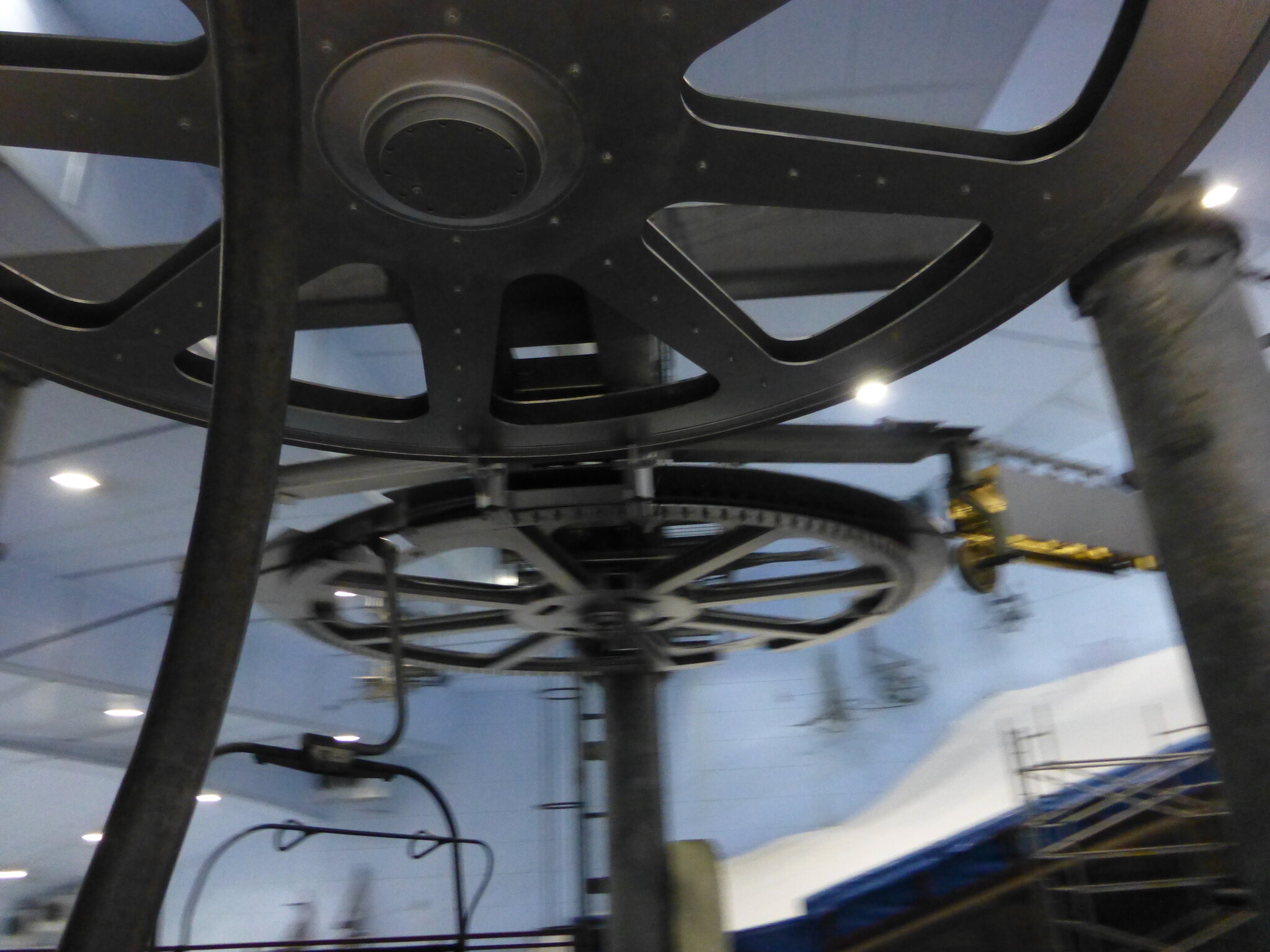 Ganz cool fand ich als Liebhaber spezieller Seilbahnen natürlich, dass die meisten Masten des Sessellifts an der Decke aufgehängt waren (gute Idee für mehr Pistenfläche darunter) und die ca. 30°-Mittelstation eine Art Baco-Kurve hat (wie z.B. früher der alte SL Mittaghorn in Saas-Fee), wo die talwärts fahrenden Sessel innen via so ein Noppenrad um die Kurve geführt werden… hab ich so noch nie gesehen bei einem Sessellift. Vielleicht fuhr er ja deshalb selbst für einen fixen Sessel extrem langsam.