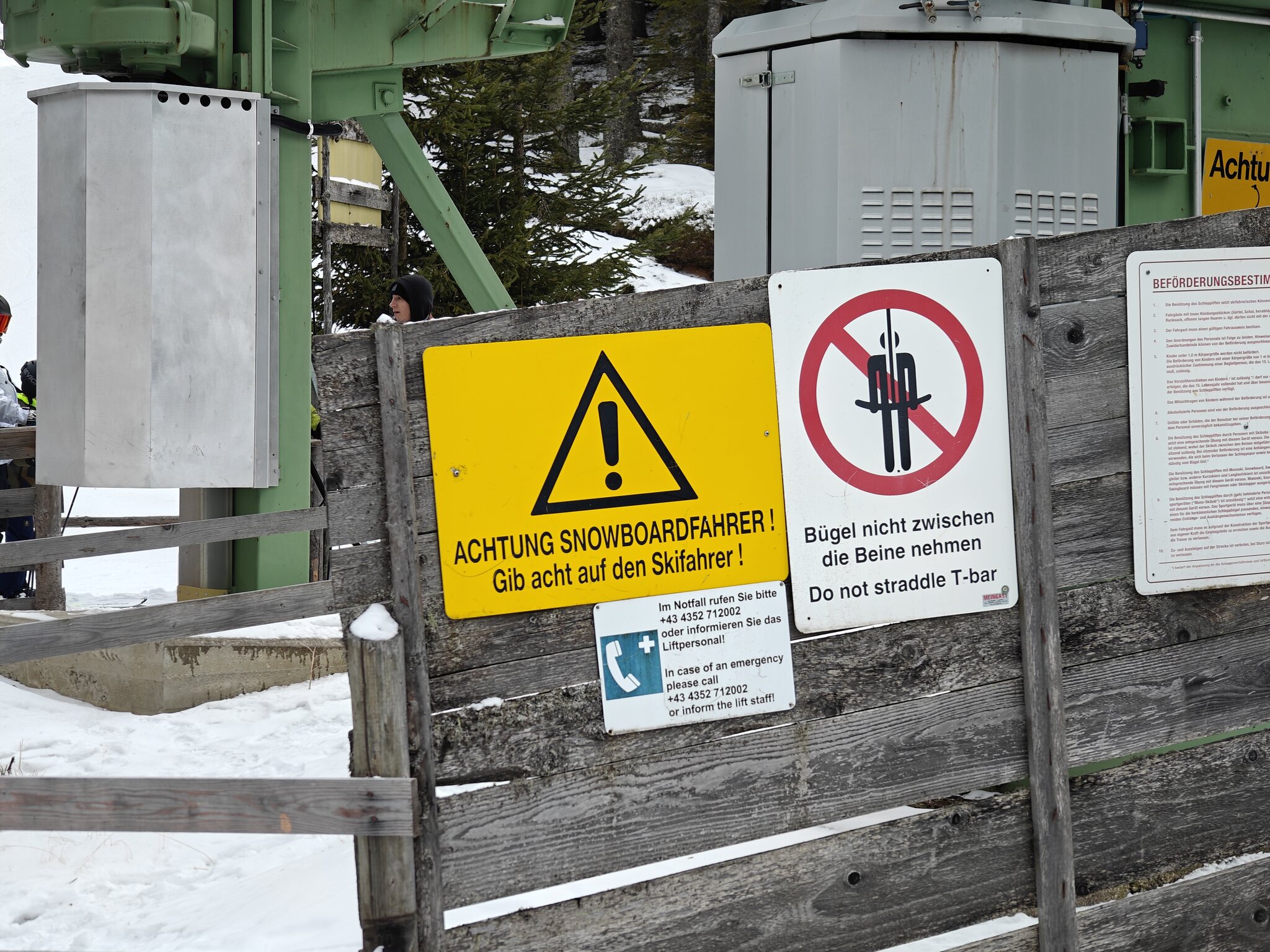 "Achtung Snowboardfahrer! Gib Acht auf den Skifahrer!"