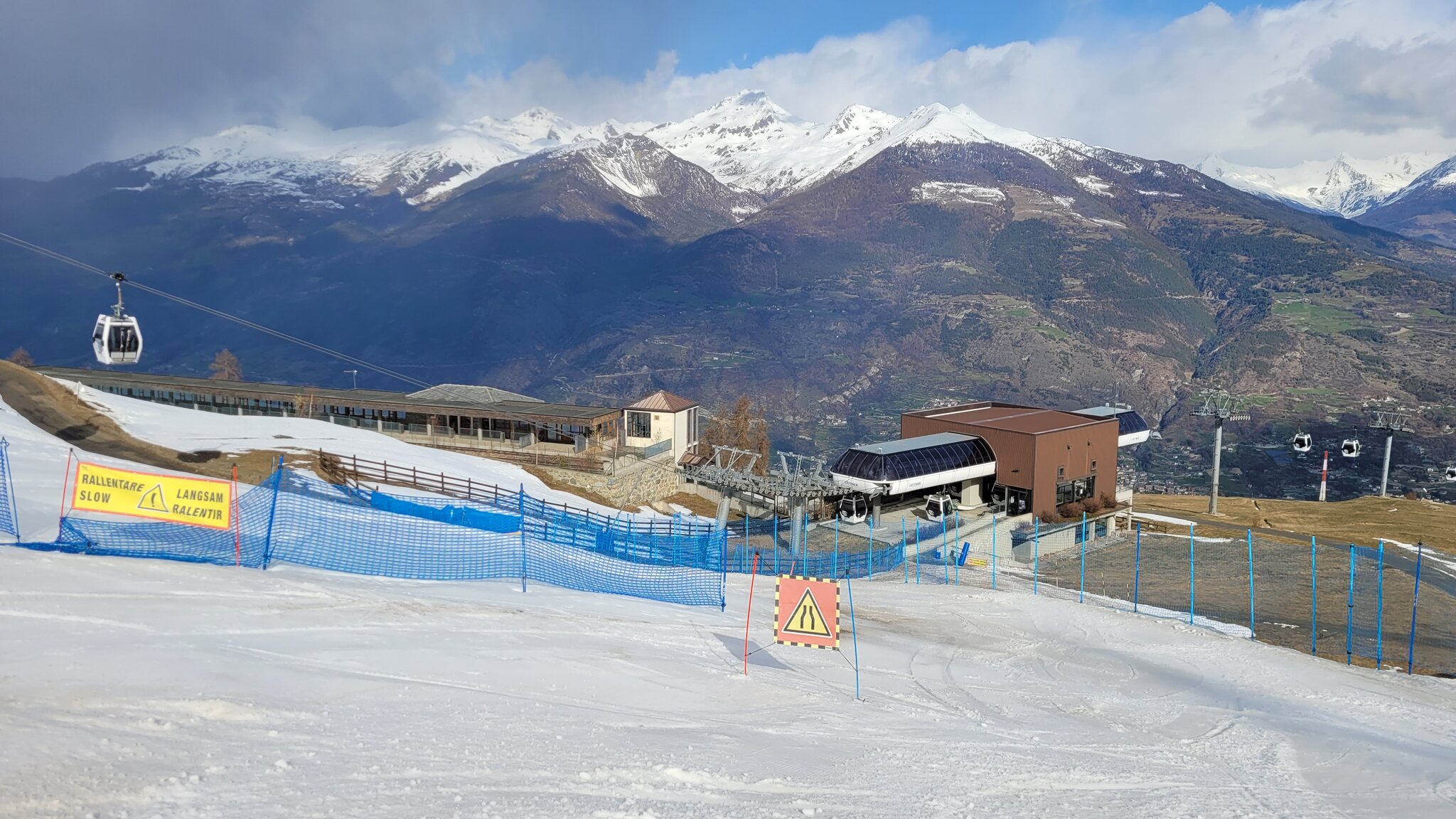 Aufgrund der Bauarbeiten am Gipfel war leider die schwarze Piste 27 nicht offen, das Zubringer-Laufband wurde schon abgebaut. Am Nachmittag zeigte sich das Matterhorn, allerdings frischte der Wind auch auf, so das nach 15h die Pisten oben etwas abgeblasen waren. Aber immer noch griffig genug. Weiter unten war es am Nachmittag überall sulzig, die flacheren Pisten hatten sich besser gehalten. Die viel befahrenen steileren Hänge waren verbuckelt, z.B. die 5 an Nuova. Hier hab es am Ende noch eine weitere blaue Variante, die merkwürdigerweise kaum befahren wurde. 16h bin ich dann wieder runter. Alles in allem fand ich den Tag ziemlich gut, am Morgen war der untere Teil noch gut und am Nachmittag hat der obere Teil auch noch Spass gemacht. Die milden Temperaturen waren nicht ganz optimal, aber in Cervinia wäre es heute nicht besser gewesen. Wettertechnisch war Pila sicher heute der beste Spot im Aostatal. Ich mag auch die Kombination aus Waldpisten und das Panorama vom Mont Blanc zum Matterhorn.