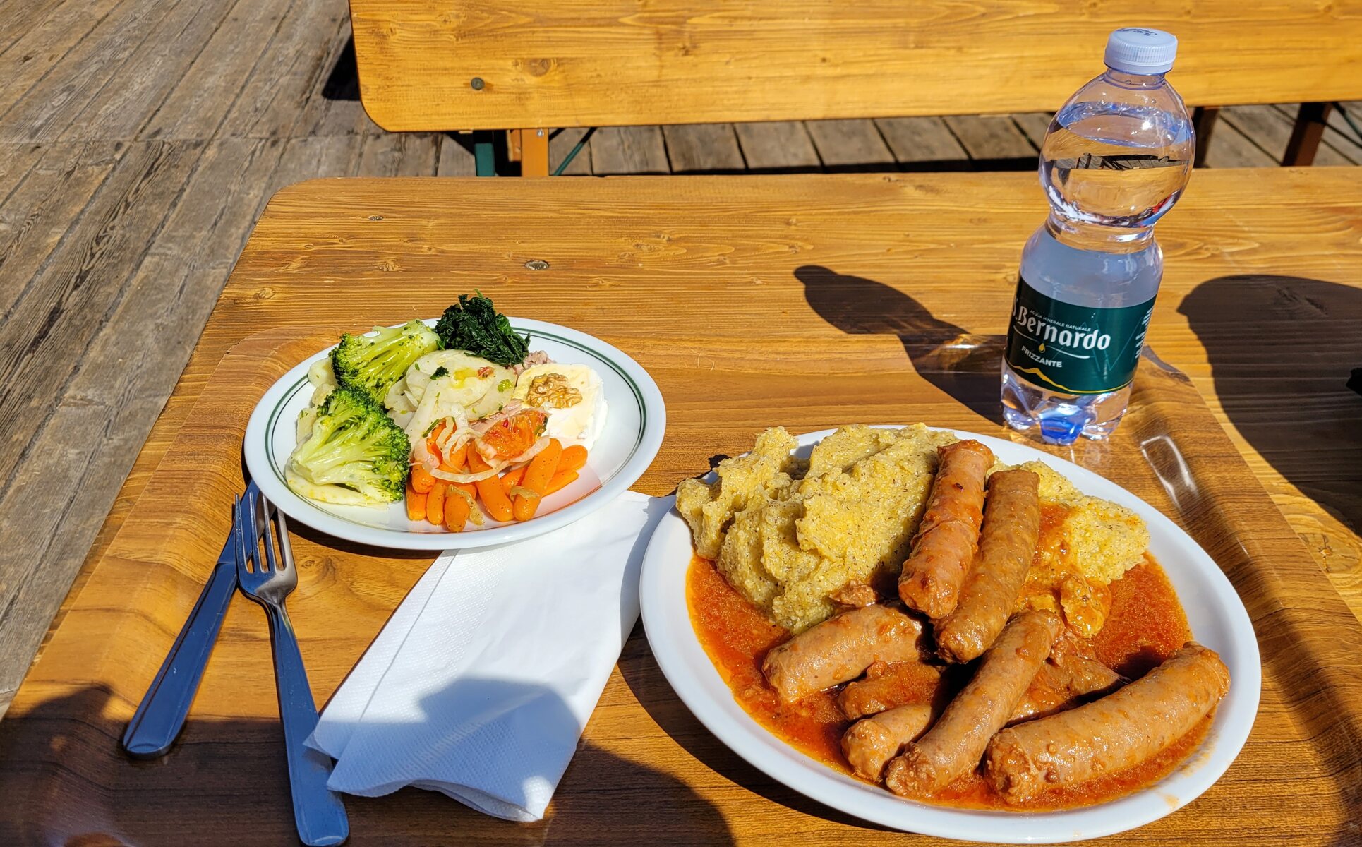 Piste 17 und 18 haben mir gut gefallen. War zwar teilweise auch schon weich, aber in dem Sektor war auch wenig los. Am Couis 2 war 11-12h eine grössere Schlange, ich hab den daher erst nach dem Mittag angefahren. Im Hermitage gab es eine Riesenportion Polenta con Salsiccia für schlanke 15€: