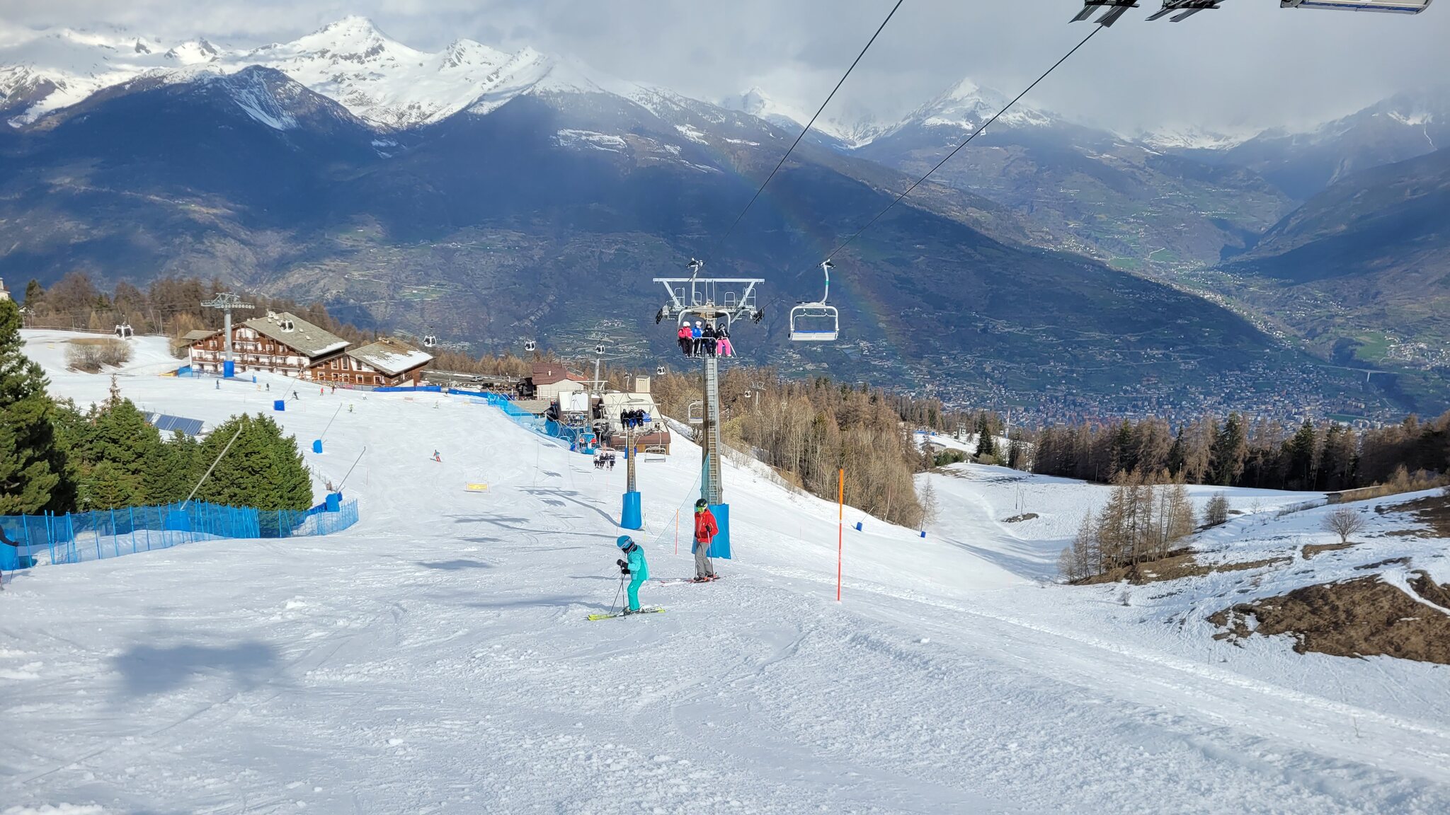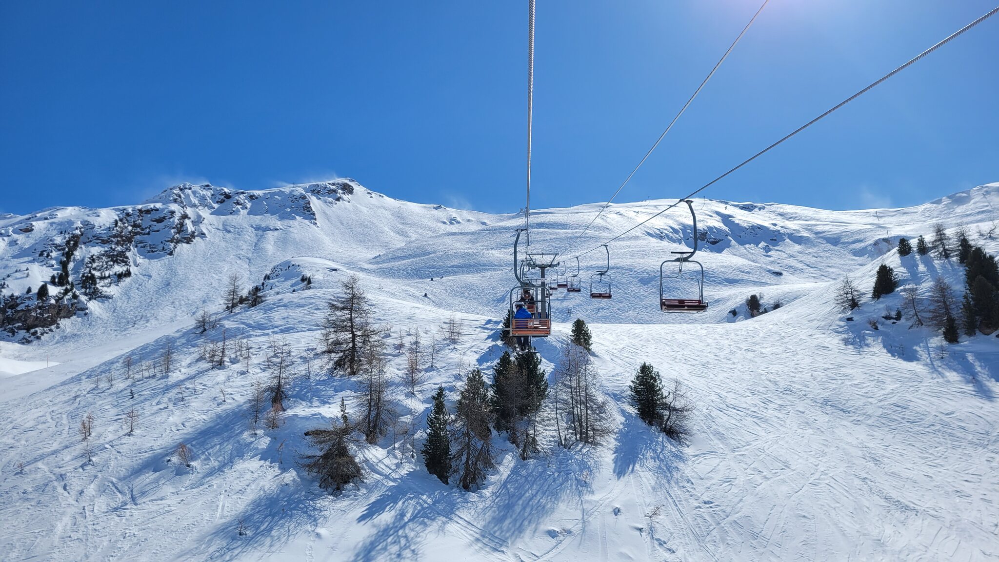 1/3/4 waren gut, die 2 war oben etwas bröckelig und unten mit Sulzbuckeln, da hier viele Leute gefahren sind. Komischerweise gibt es aber einige wenig befahrene Pisten, die sich besser gehalten haben. An der Bergstation der Zubringerbahn war der Schnee schon etwas knapp. Am Leissé-Sessel hielt sich der Andrang in Grenzen, ich bin dann Richtung Grimondet, der auch eher selten geöffnet ist.