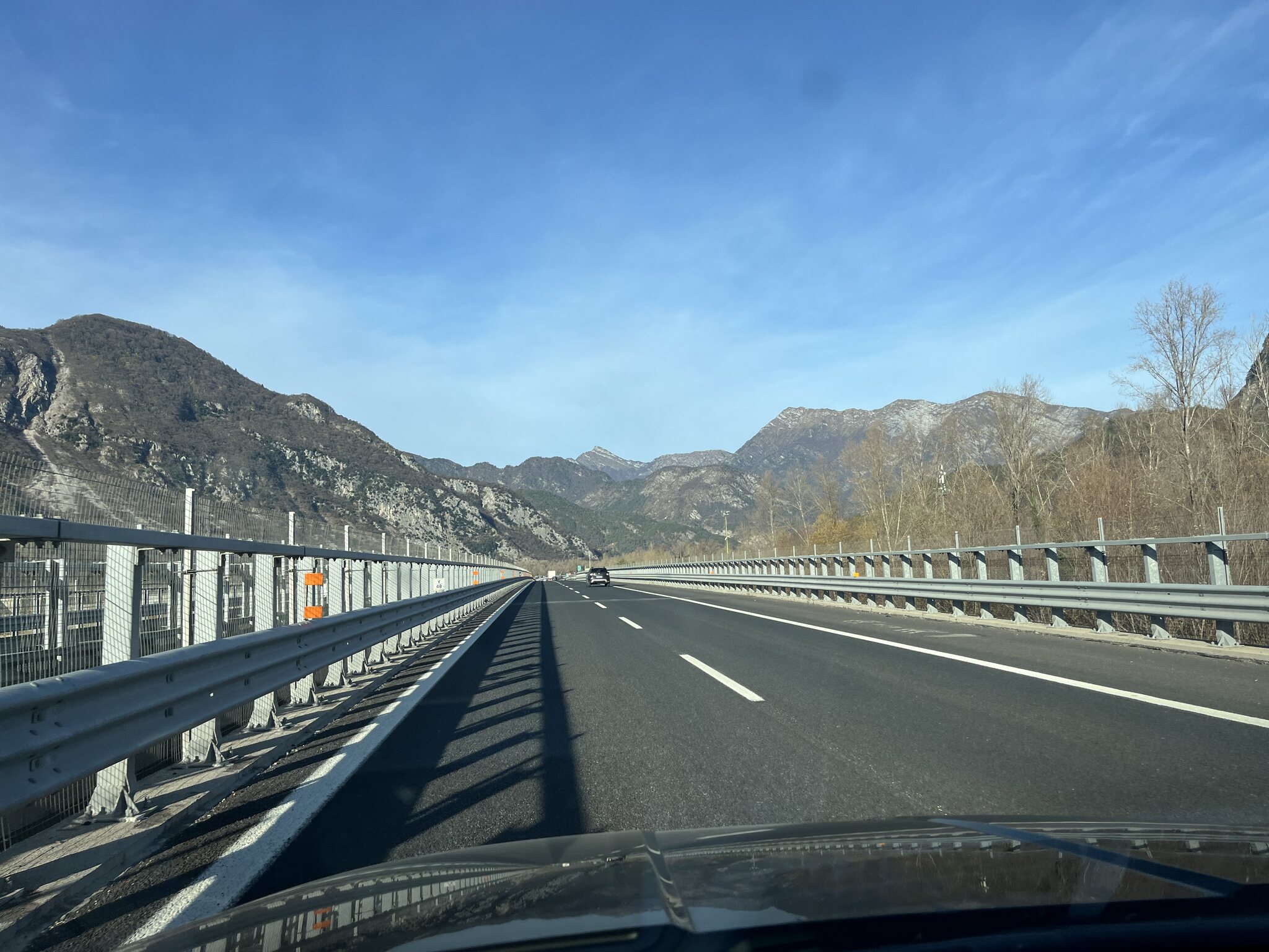 Da ich den Koffer nicht abgegeben hatte und mein Parkplatz in 12min zu Fuss erreichbar ist, bin ich schnell im Auto und komme gut voran. Bald sind die Alpen zu sehen.