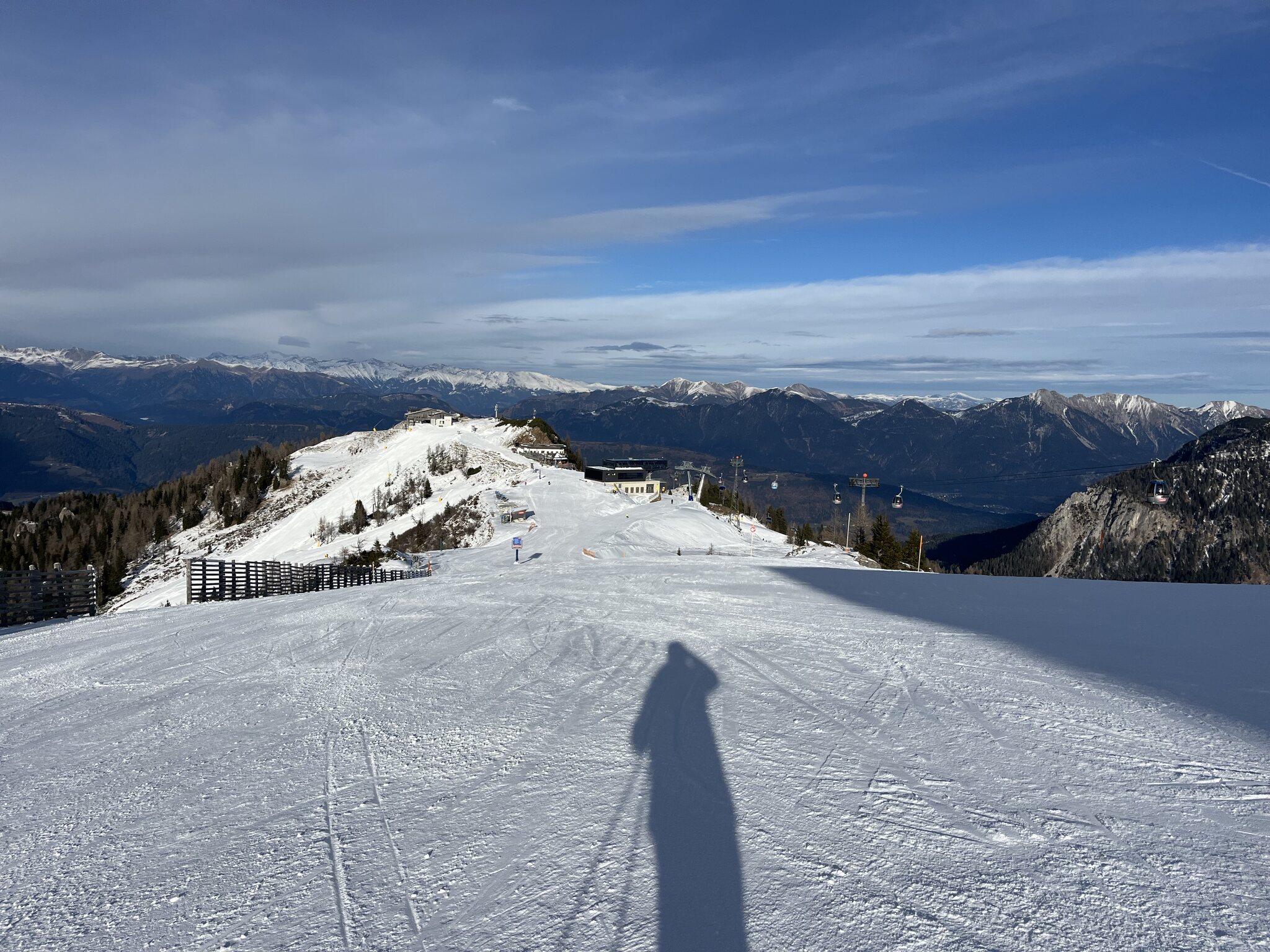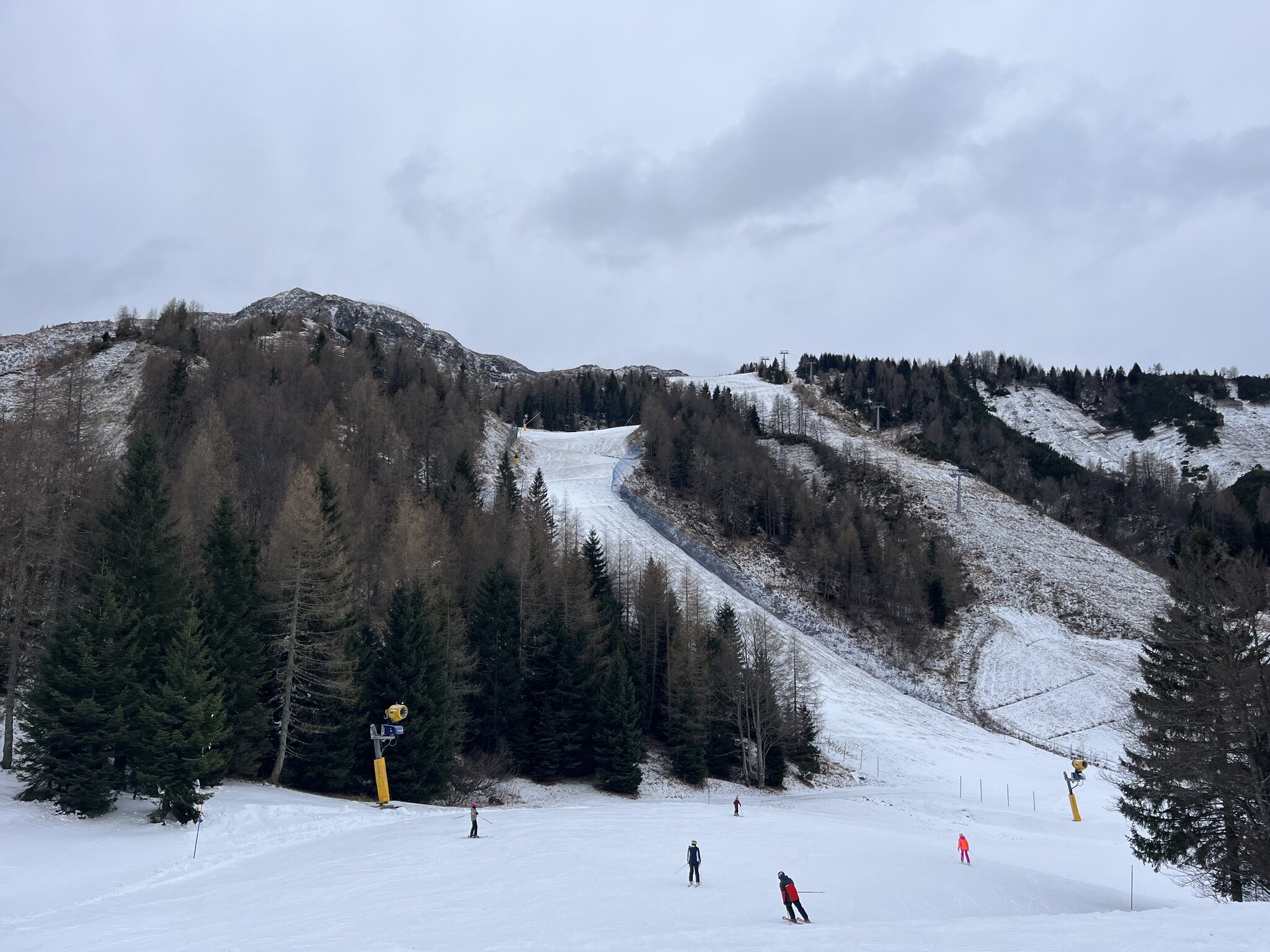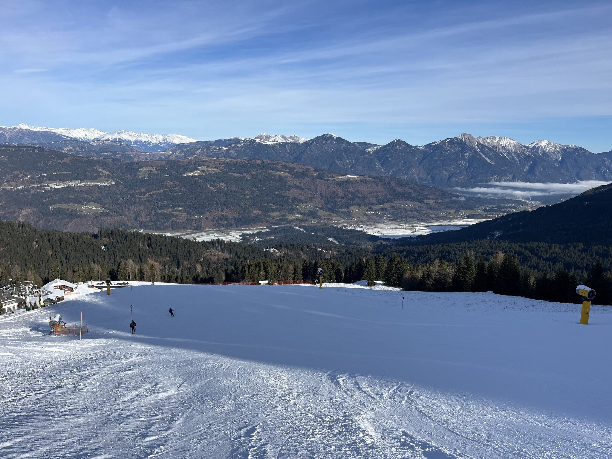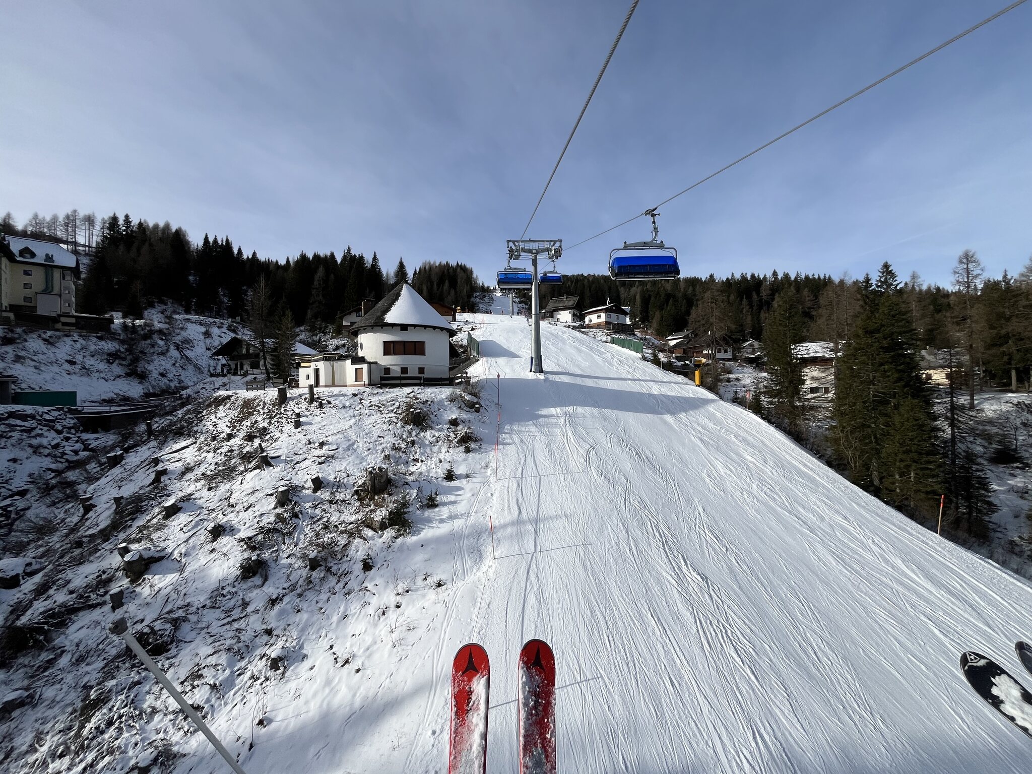 Anhand der Homepage von Montagna365 (https://www.turismofvg.it) dachte ich, dass die Karte möglicherweise auch in Sappada gilt. Und falls nicht, würde ich ohne zu zögern nochmals 15.50 bezahlen. Also fahre ich mit einem Skischuh die 30min zügig zur DSB Pian dei Nidi. Und siehe da, piepst einwandfrei. Oha, das ist aber eine flache Geschichte. Trotzdem macht sie viel mehr Spass als am Zoncolan. Ich fahre 2x. Danach ruft noch ein weiterer Lift.