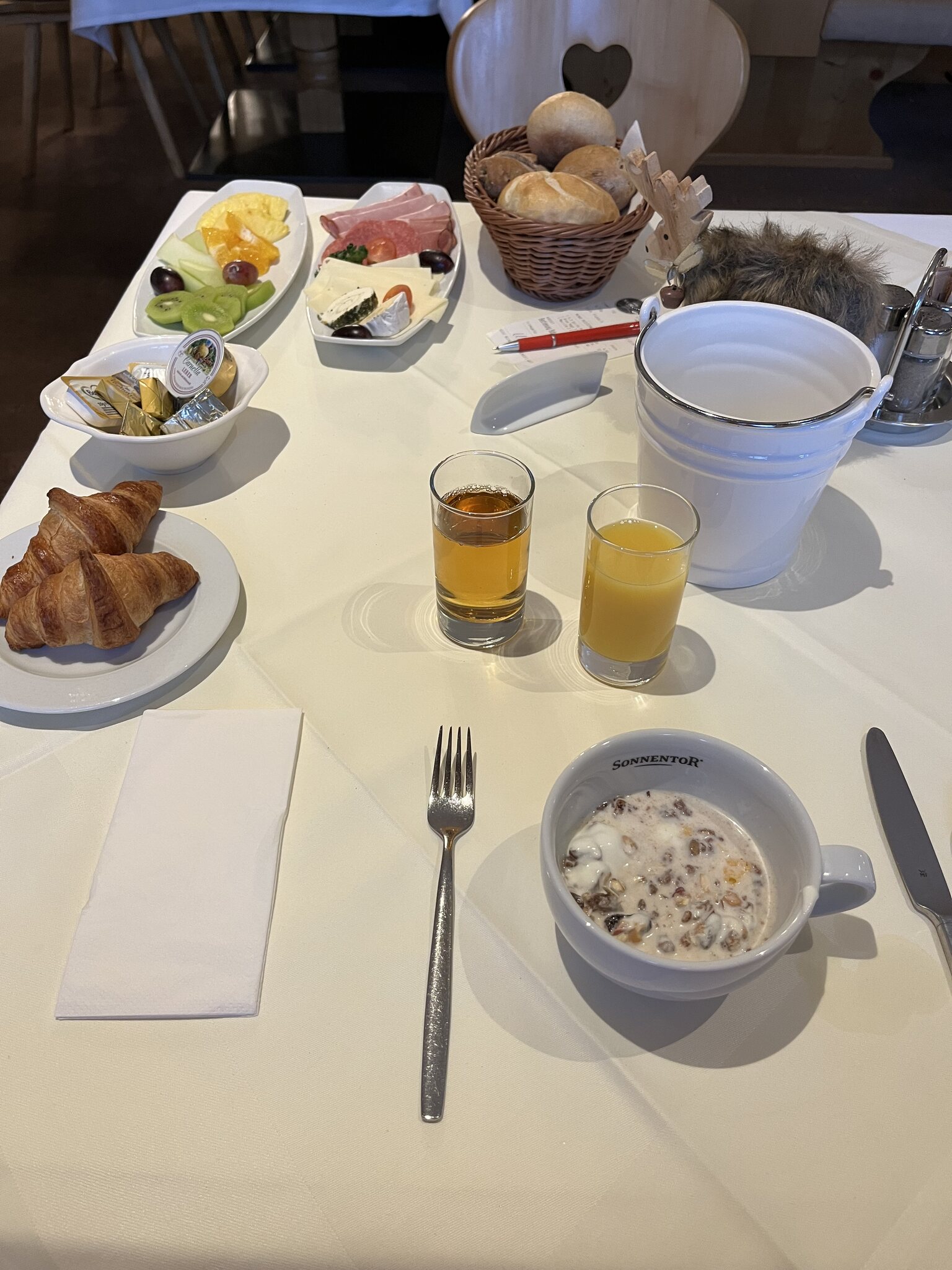Als ich den Vorhang öffne, sieht das Wetter viel besser aus als erwartet: Nur fünf Gäste. Da wird das Frühstück an den Tisch gebracht: Ich kaufe mir eine 3-Stunden-Karte und kann schon um 8.50 Uhr hoch. Die Bodensicht ist grad so ausreichend. Gut präpariert, wenn auch recht hart. Edit 11.30 Uhr:
