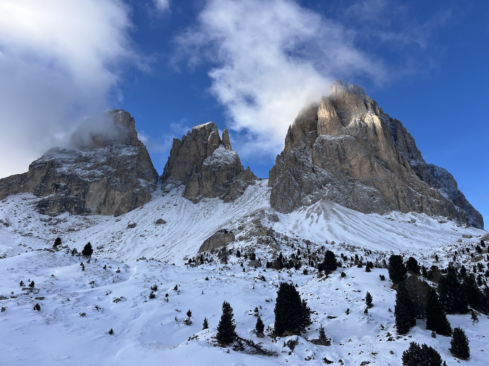 Start ist um 8.30 am Gardenaccia. Ein Träumchen! Ich freue mich schon auf die Februarferien mit meinen Liebsten in diesem Hotel: Da Sompunt mit technischen Problemen kämpft, fahren wir zuerst nach La Crusc. Das Wetter ist viel besser als erwartet: Piz la Ila. Die Pisten sind supergut. Griffig kompakt mit einer dünnen Neuschneeauflage. Durchs blaue Meer: Meine zwei Begleiter ausnahmsweise voraus