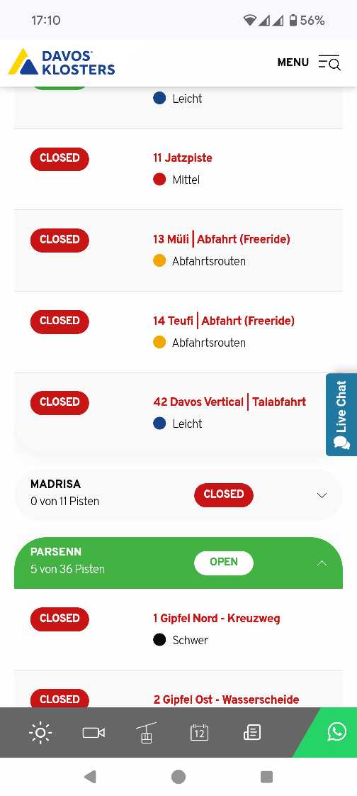 2025/26: 10x Jakobshorn, 9x Parsenn, 6x Madrisa, 4x Sellaronda, 3x Andermatt, Arosa Lenzerheide, Rinerhorn, 2x Frutt, Pany, 1x Zermatt, Stilfser Joch, Landgraaf, Saas-Fee, Hintertux, Pitztaler, Titlis, Sölden, Glacier 3000, Gemsstock, Ostschweiz, Ischgl, Seiser Alm, Hasliberg, Kt. Schwyz, Mörlialp, Axalp, Gadmnen, Sternenberg, Grüsch, Val d'Anniviers, Anzère, Ovronnaz, Marécottes, Ghöch, Marbach, Sörenberg, Jura, Disentis, Fideris, San Bernardino, Splügen, Feldis, St. Antönien, Fribourg, Bergün, Alvaneu, Tenna, Minschuns, Oberengadin, Corvatsch, Malbun, Klewenalp, Belalp, Bürchen, Grächen, Leukerbad, Obersaxen, Laax