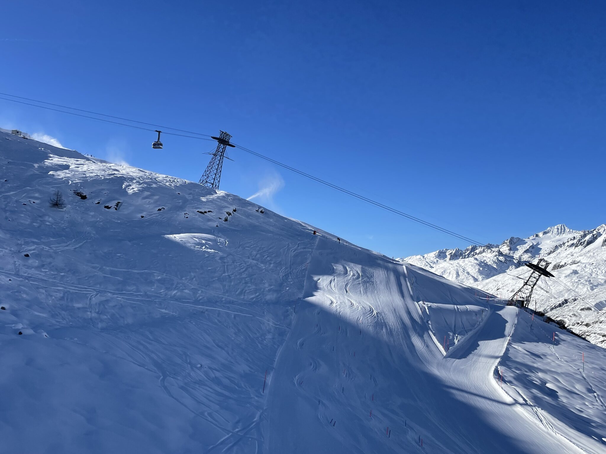 Die Gondel auf den Gemsstock ist nur zu 20% gefüllt, so schaffe ich es, als erster die Sonnenpiste diese Saison zu fahren. Piste hart und griffig, aber relativ uneben, im unteren Teil sind die Schneekanonen an.