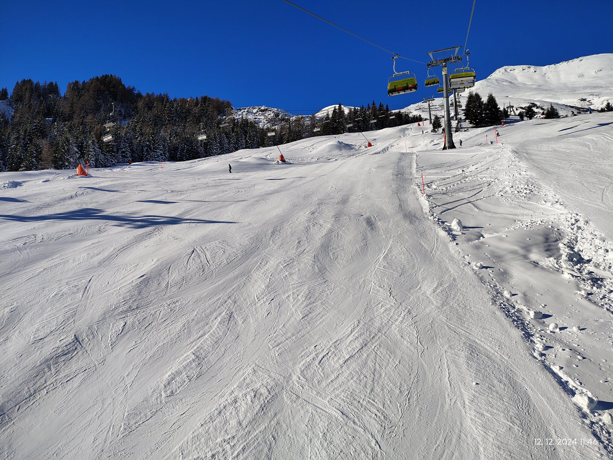 Los geht's. Wenig Leute bis jetzt. Schneekanone läuft. Präpariert kann besser sein. Jetzt Richtung Masner. Ich bin hier oft, aber am Masner mit Ski schon mindestens 3 Jahre nicht.