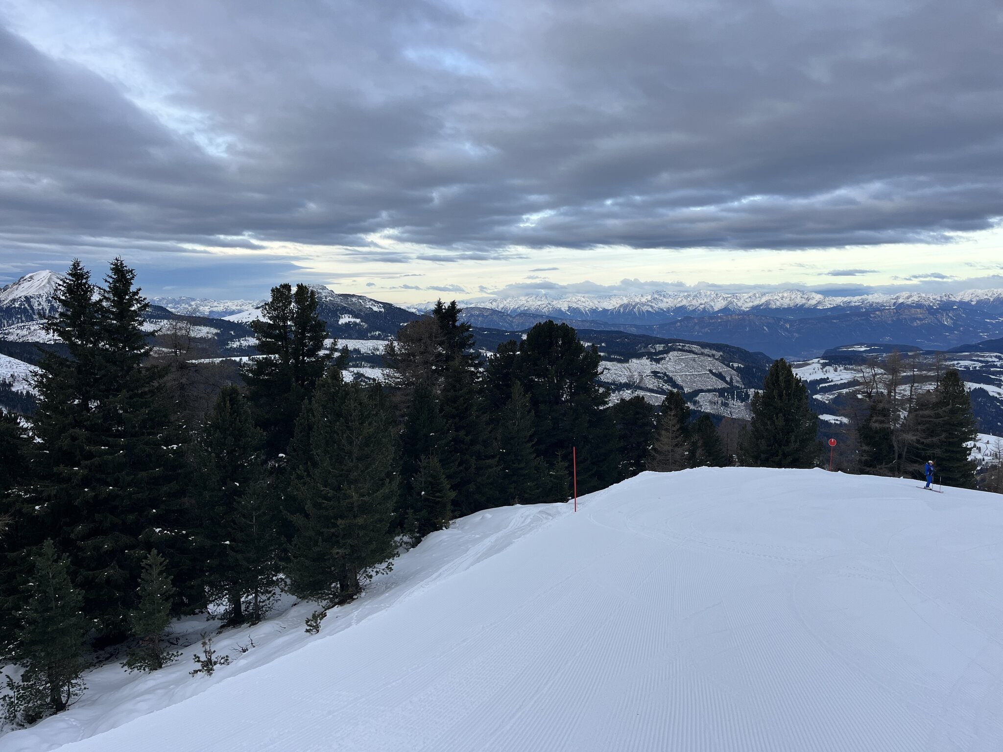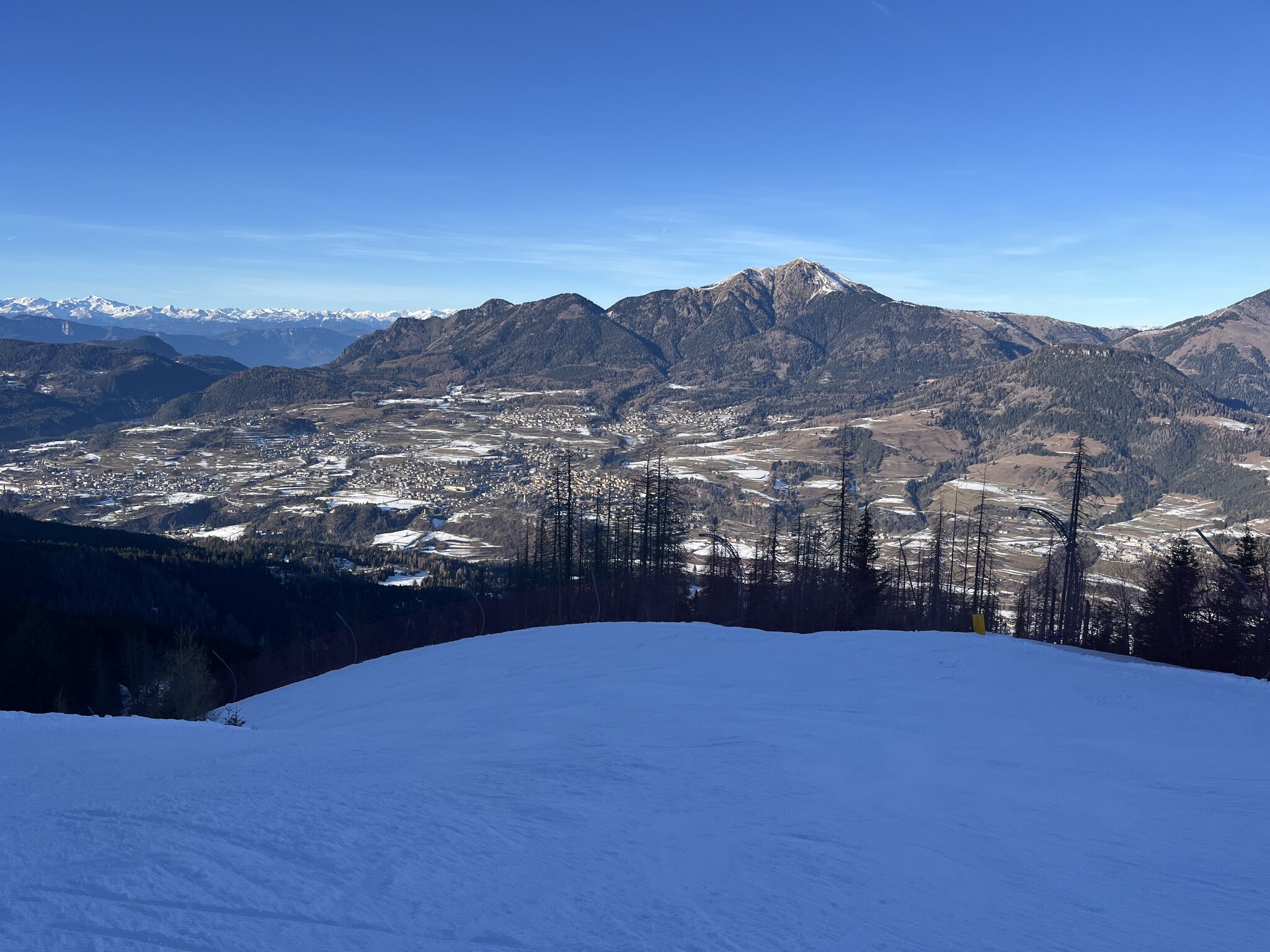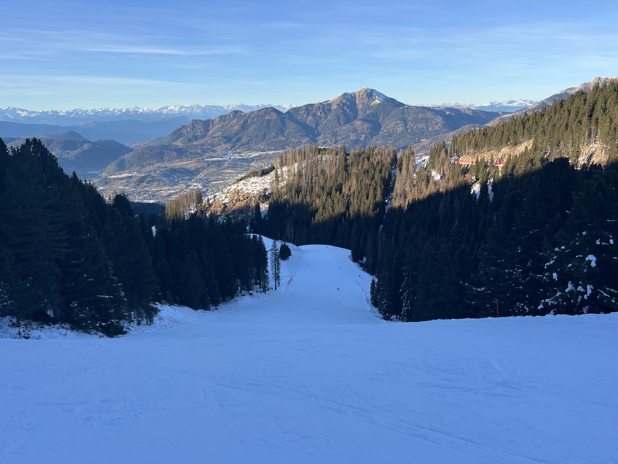 Das Hoch kommt näher: Eine für nicht vorhandene Rennkurse gesperrte Piste bei der Reiteralm sorgt für fünf Wiederholungen: PPP mit Blick zu Paganella und Monte Bondone: Edit 13 Uhr: