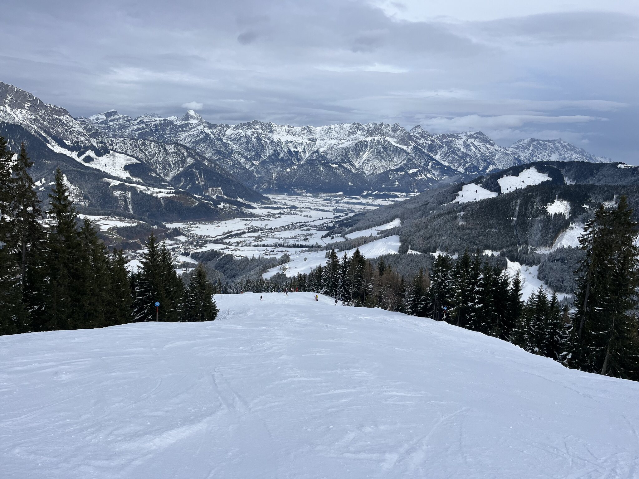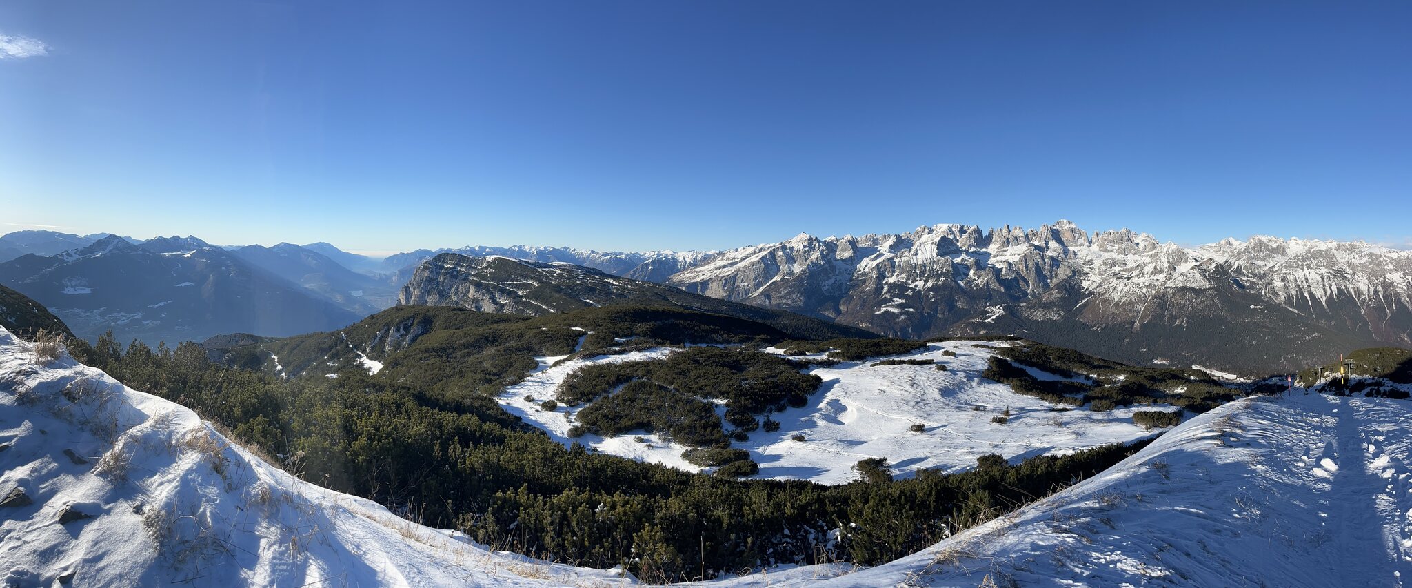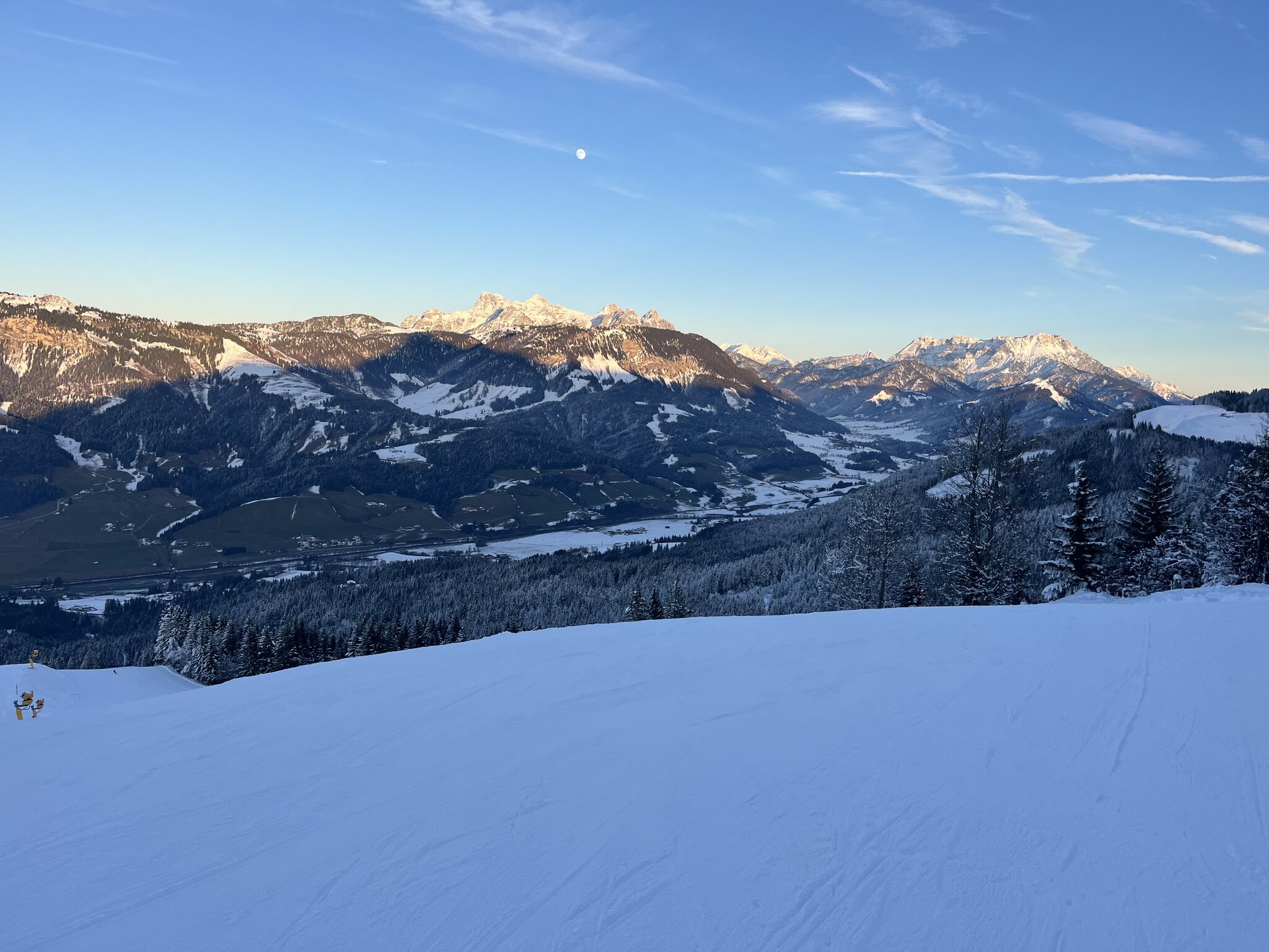 Das Hoch kommt näher: Eine für nicht vorhandene Rennkurse gesperrte Piste bei der Reiteralm sorgt für fünf Wiederholungen: PPP mit Blick zu Paganella und Monte Bondone: Edit 13 Uhr: