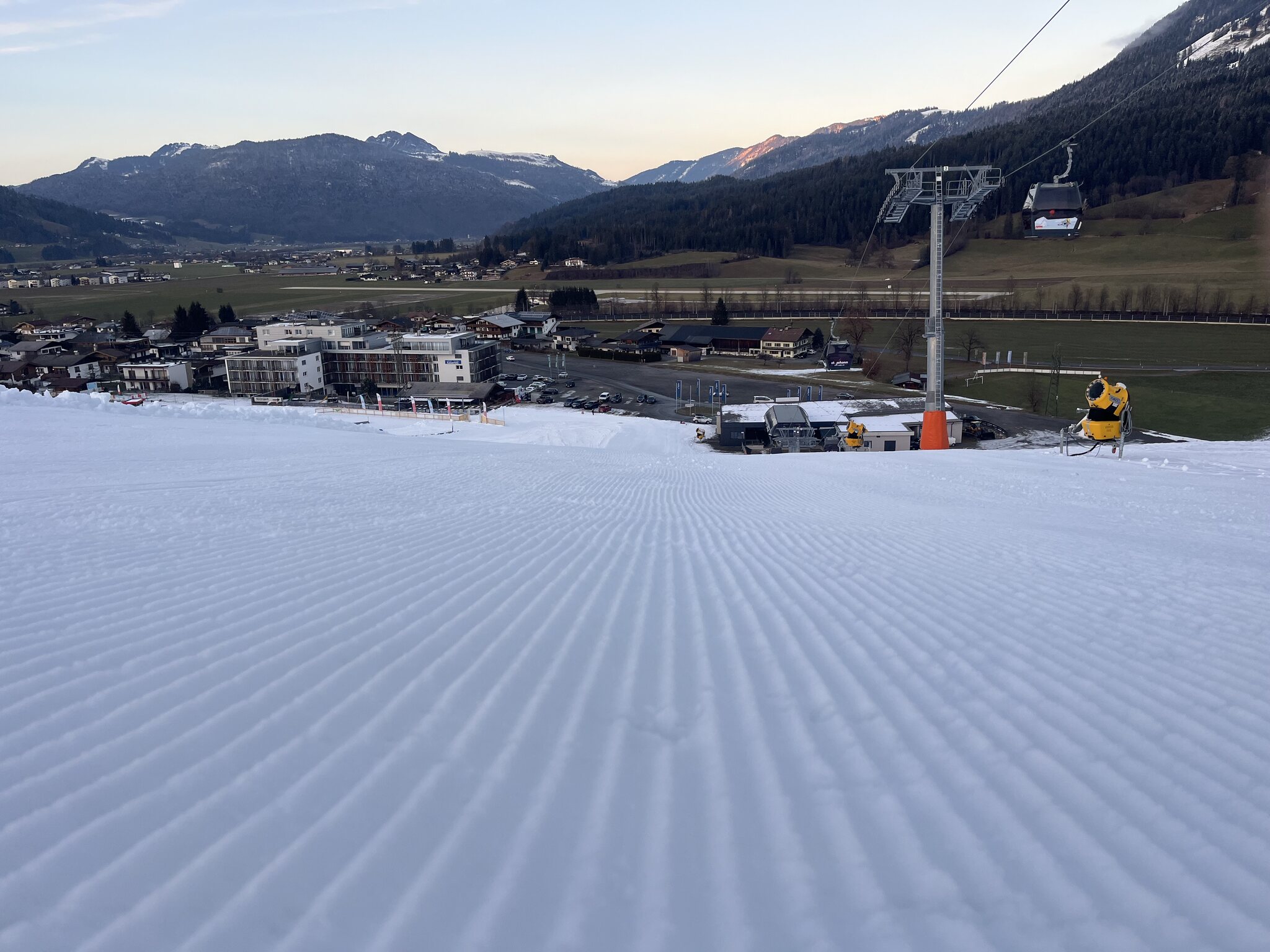 Dank Elektroladesäule kann ich extrem nahe parkieren. Sonst nämlich ist erstaunlich viel los und man müsste weit unten parkieren. Das Wetter hat noch Luft nach oben und nicht ganz wie erwartet. Es ist deutlich wärmer geworden, aber die Pisten sind top griffig. Schöne Morgenstimmung: Ich sag ja immer, italienischer Kunstschnee ist besser als Naturschnee. Einfach perfekt. Leider ist der Zanggen noch geschlossen. Die Piste des Tages ist die schwarze Torre di Pisa am Passo Feudo. Leer und perfekt. Da kann man es krachen lassen! Leider nimmt nach vier Fahrten der Wind zu und wir sind unsicher, ob der Lift weiterlaufen kann. Edit 12.15 Uhr: