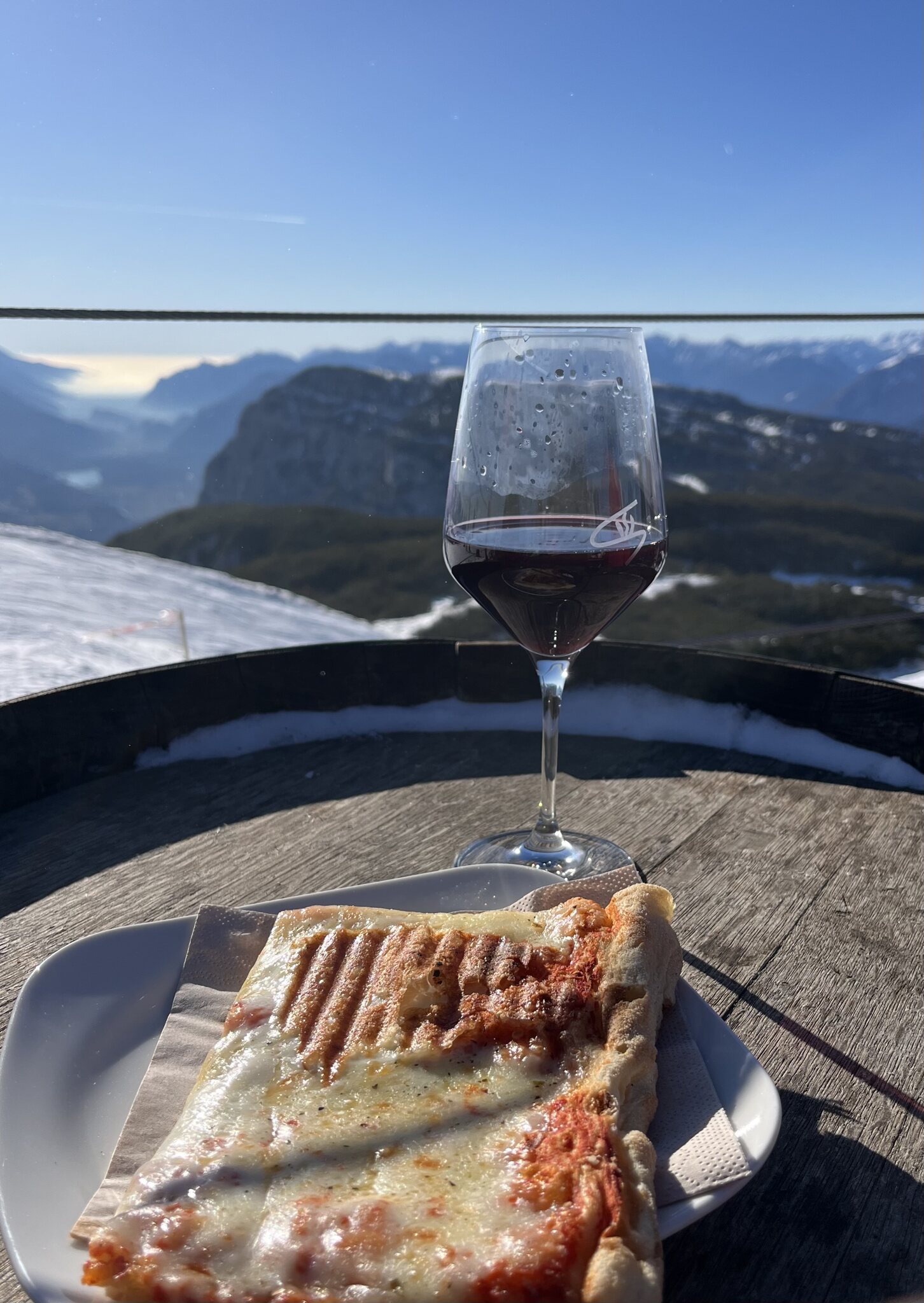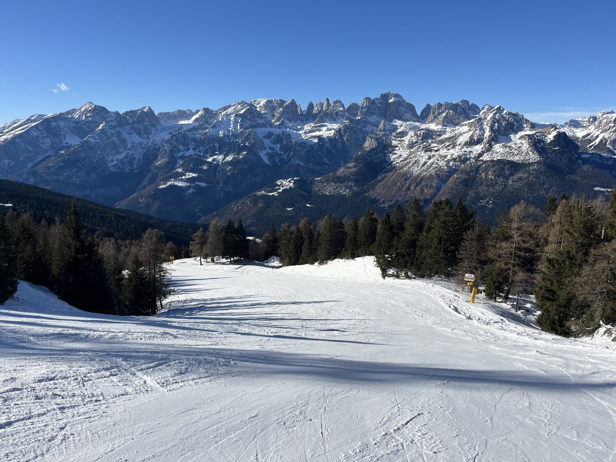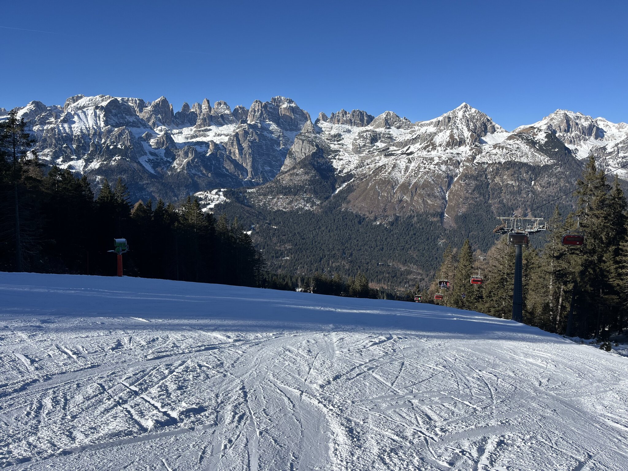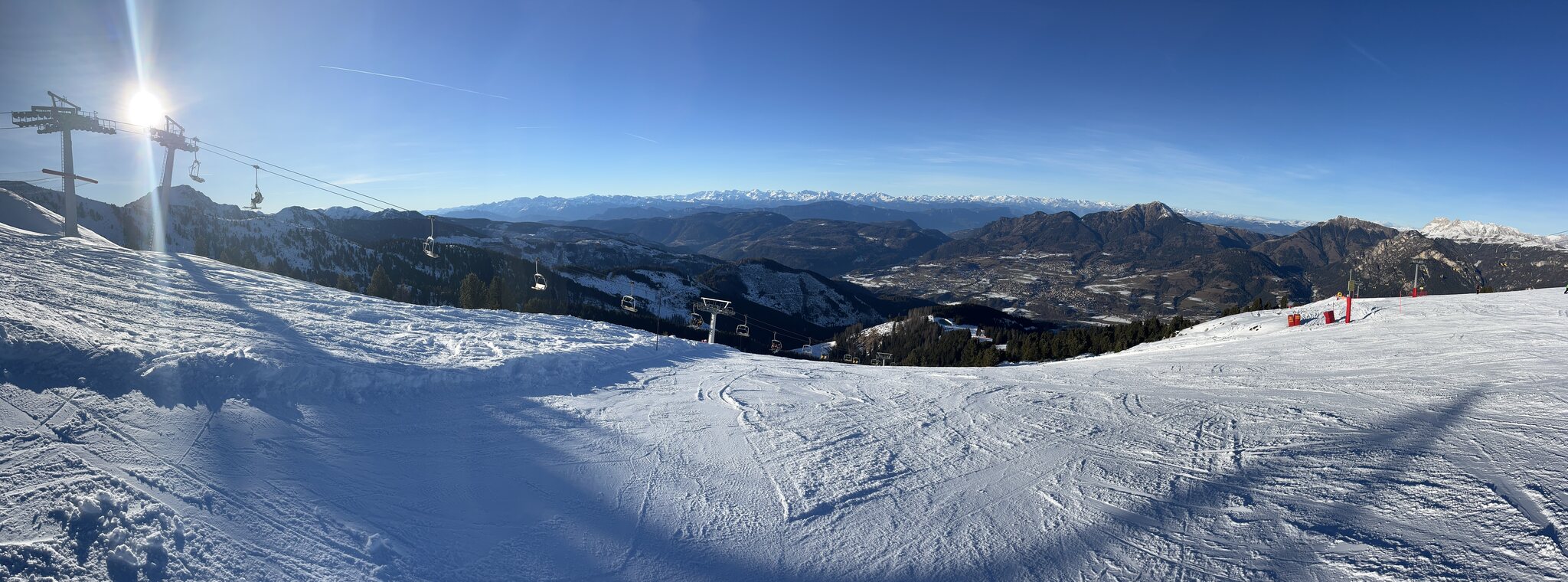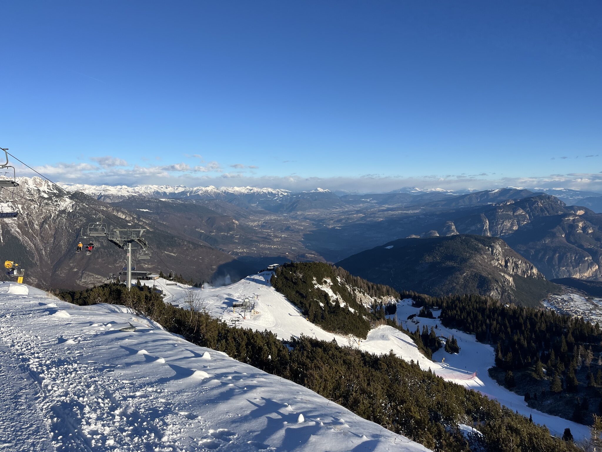 Zwischen 10 und 12 Uhr sind die blauen Pisten unangenehm voll. Es hat sehr viele Anfänger hier. Die roten bleiben aber tip top. Andalo. Der Vollständigkeit halber fahre ich auch diese olle DSB. Kurze Mittagspause mit Sicht auf den Gardasee: Langsam kommt auch die Sonne in die vielen nordseitigen Pisten. Die Panoramapiste heisst nicht umsonst so. Edit 16 Uhr: