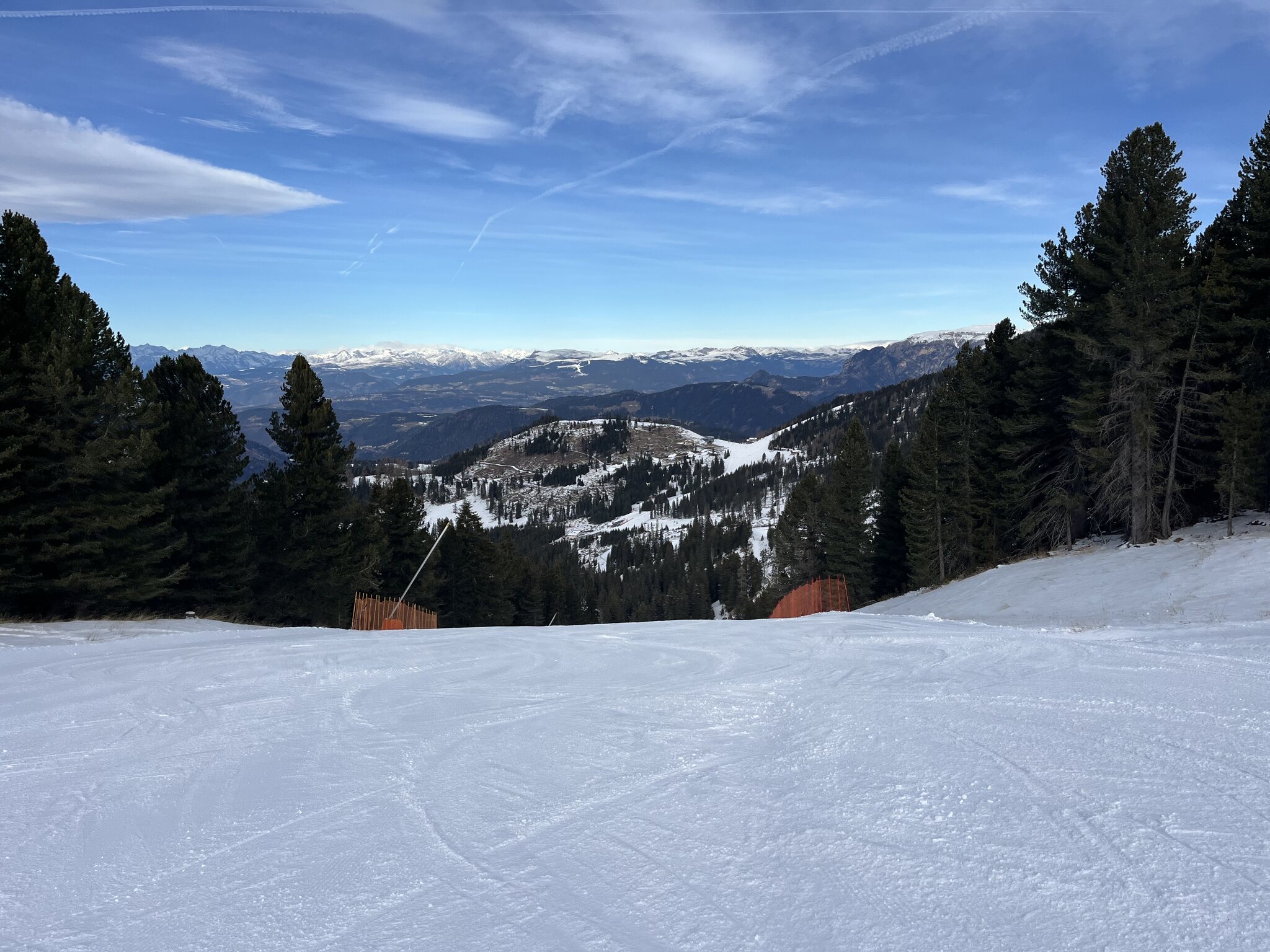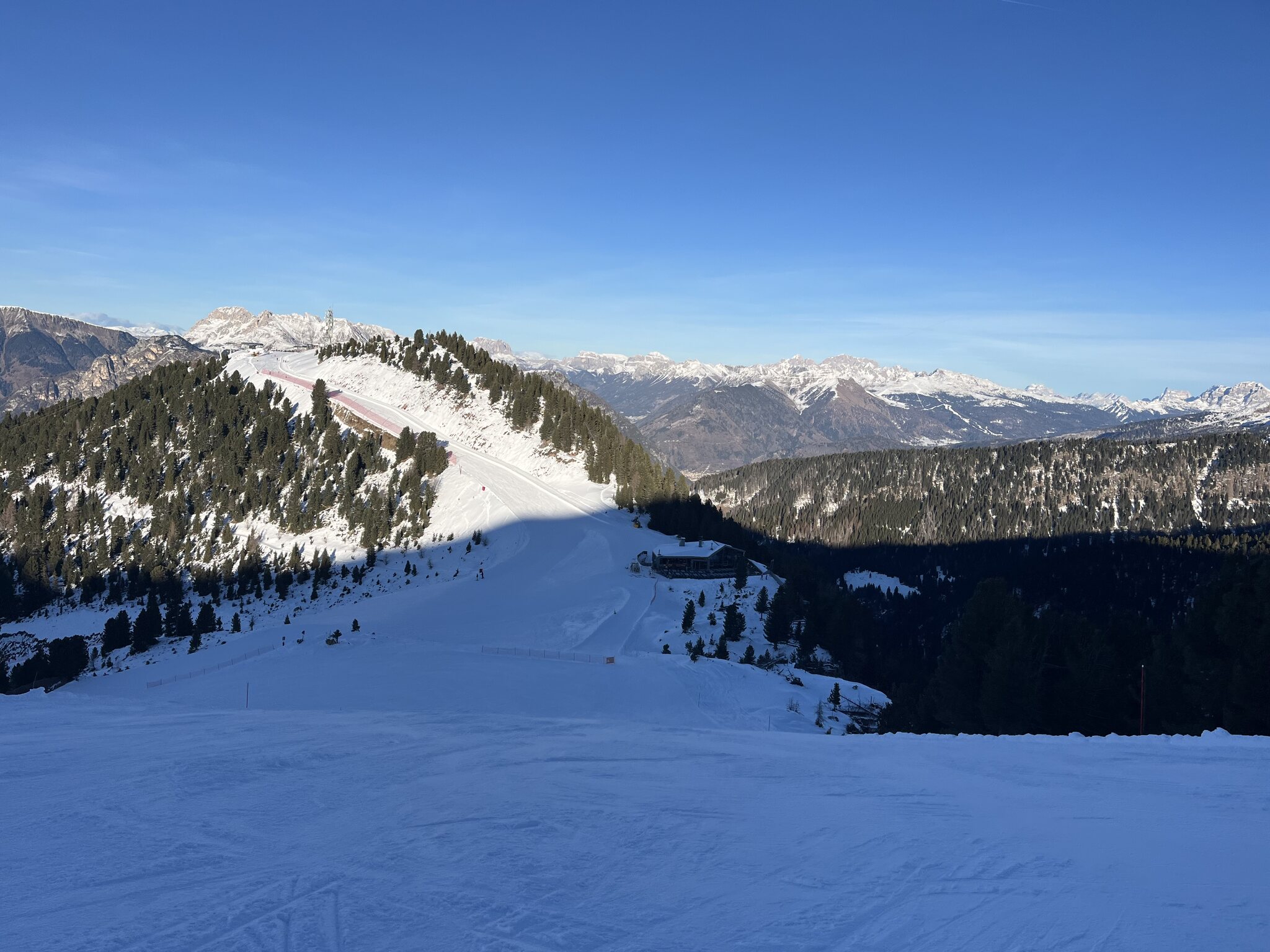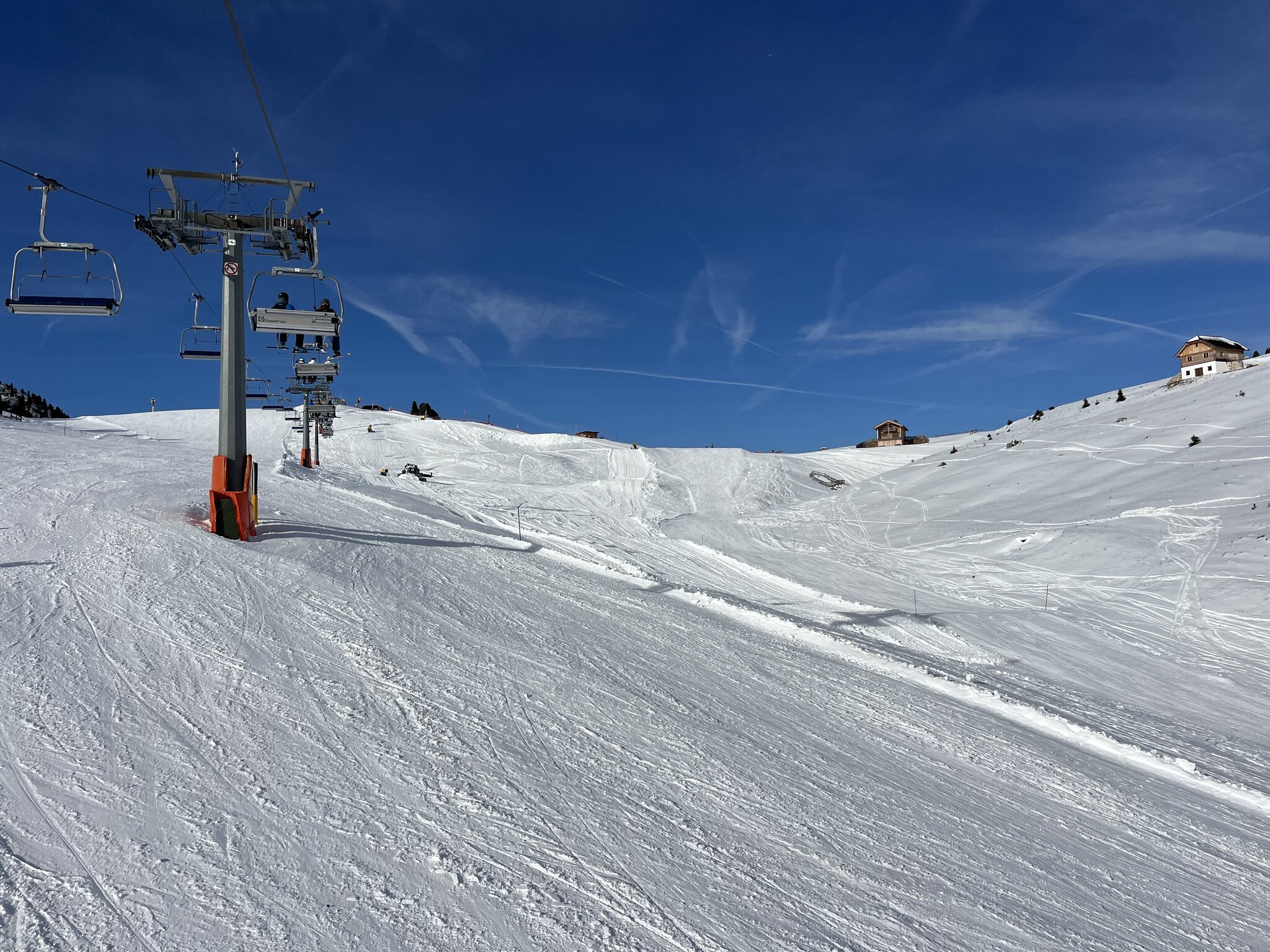 Schon ein krasser Unterschied nach den zwei Tagen auf planierten, perfekt präparierten Pisten Italiens nun hier auf hügelige, geländegeformte und nur gut präparierte Pisten zu stossen. Irgendwann muss ich mir doch mal eine Dolomiti-Saisonkarte besorgen