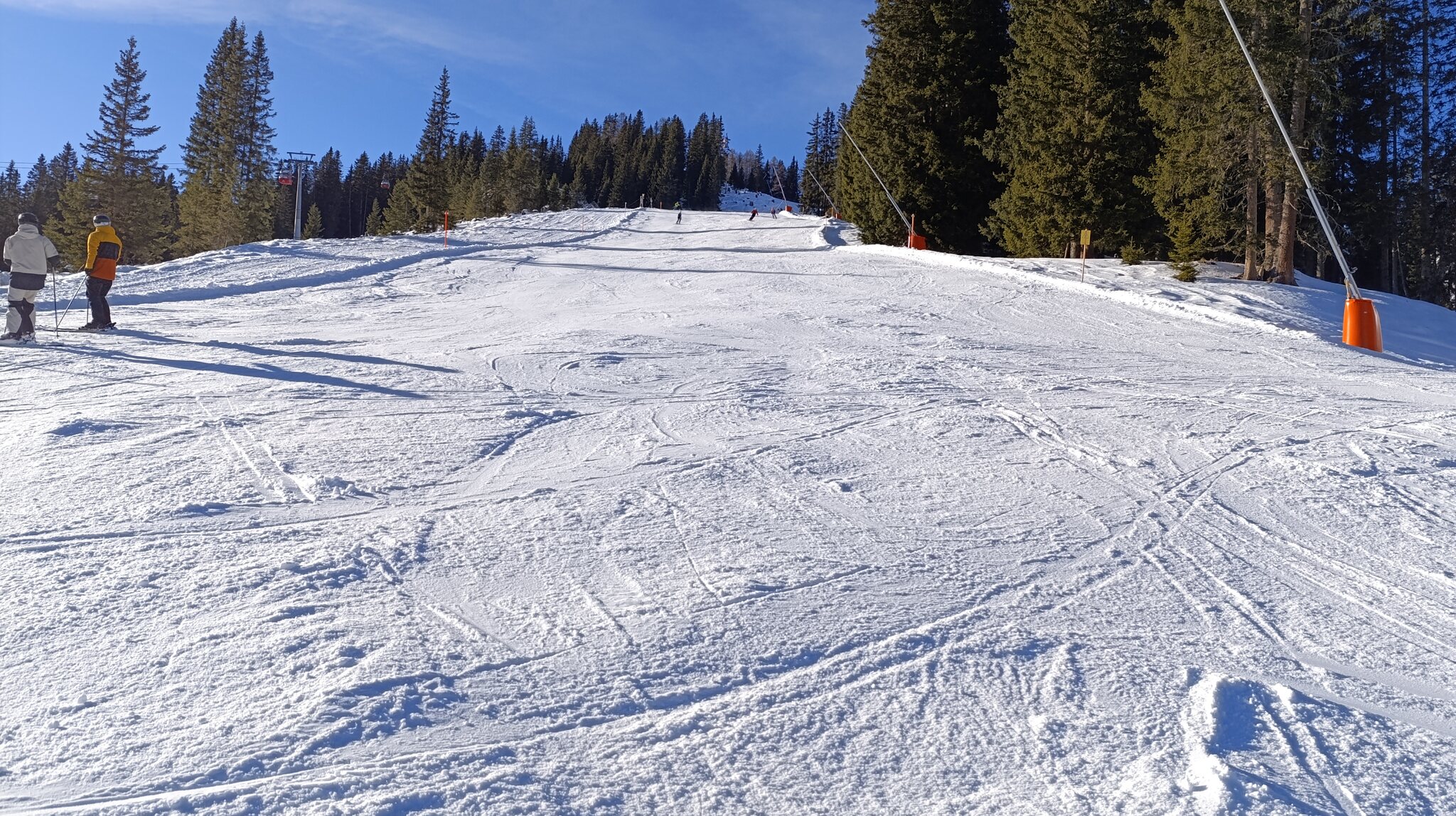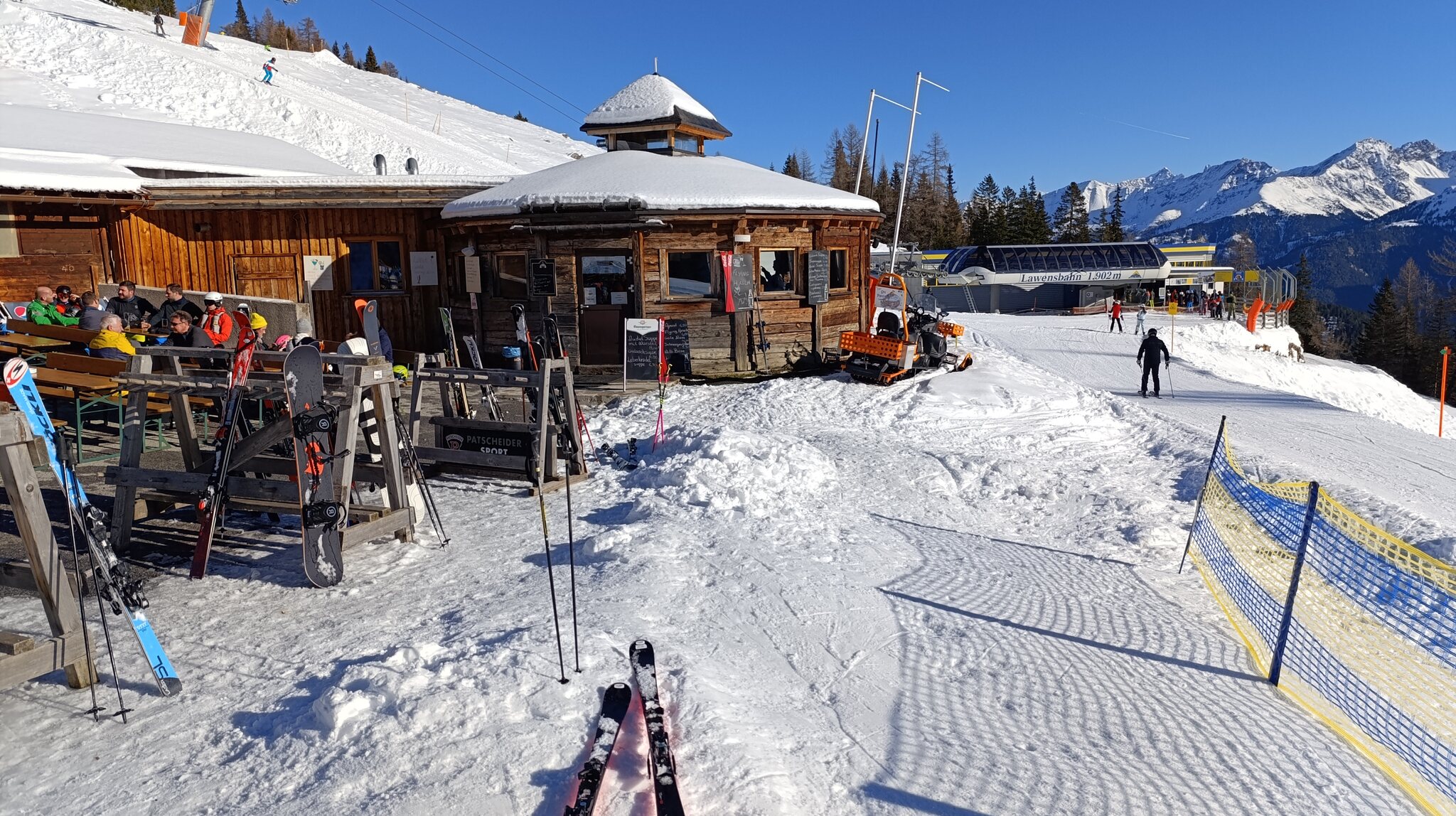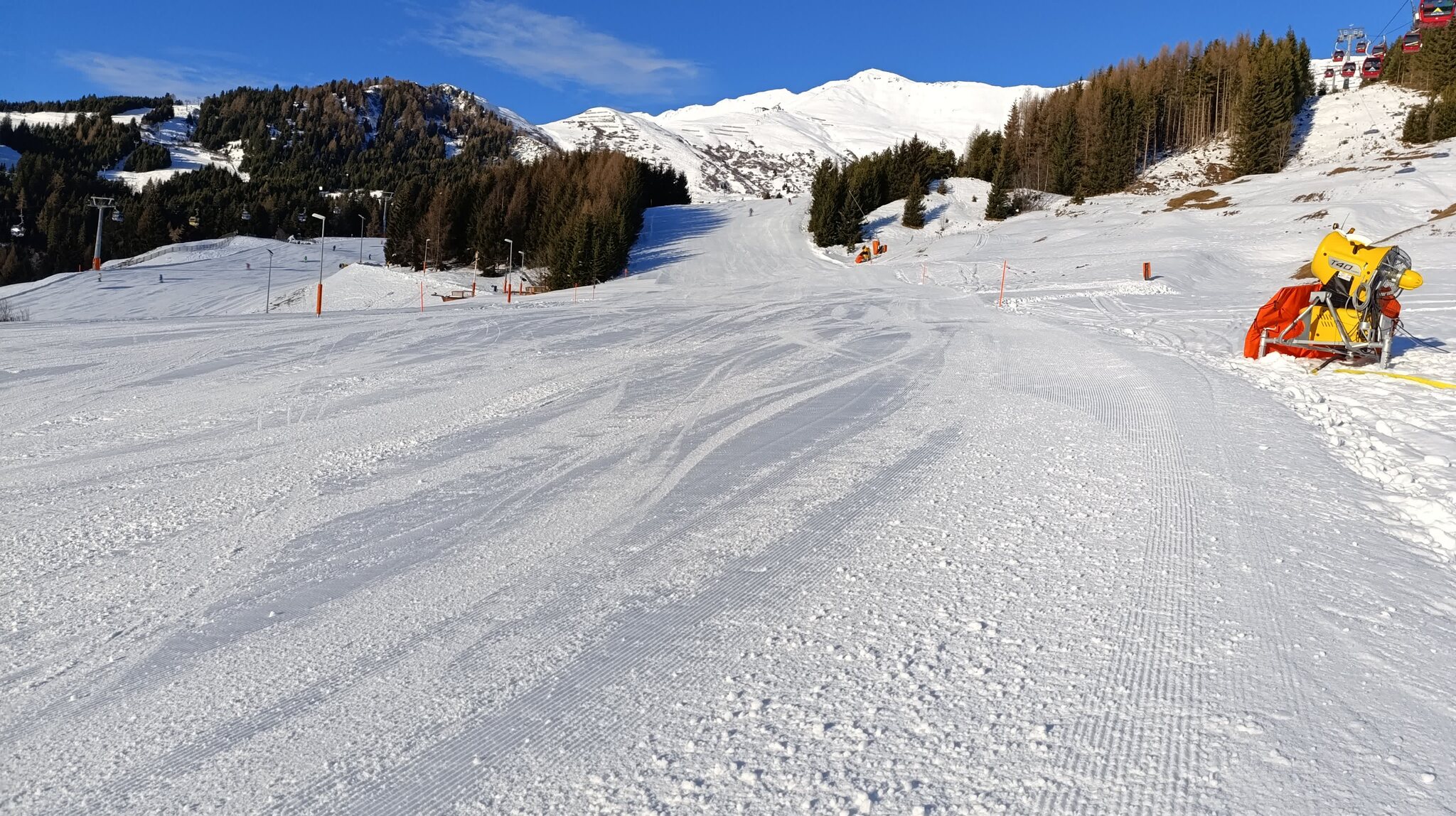 Heute perfekter Sonnenschein. Pistenbhart, Präbarierung: quick and dirty. Wahrscheinlich aufgrund Personalmangel..