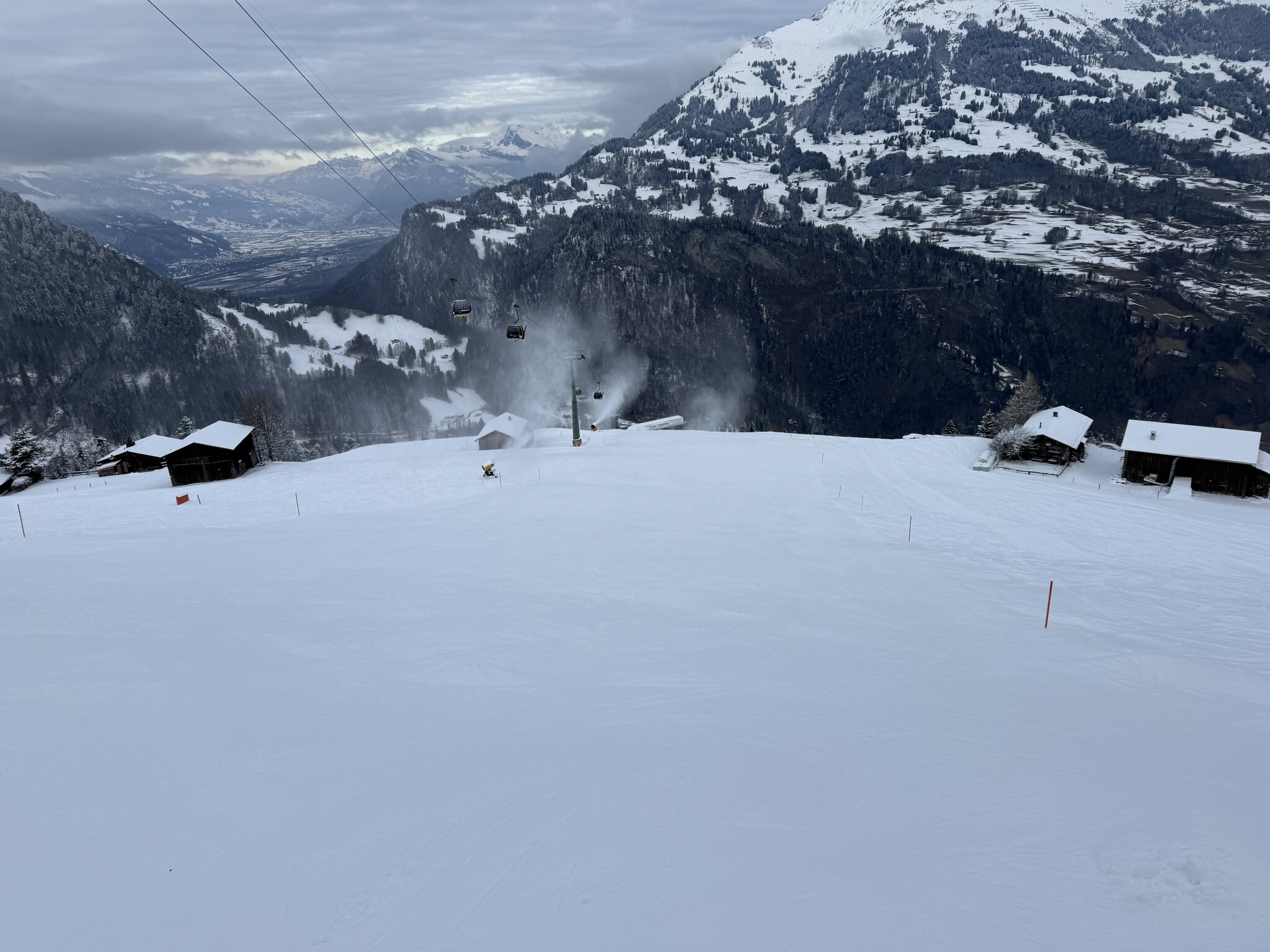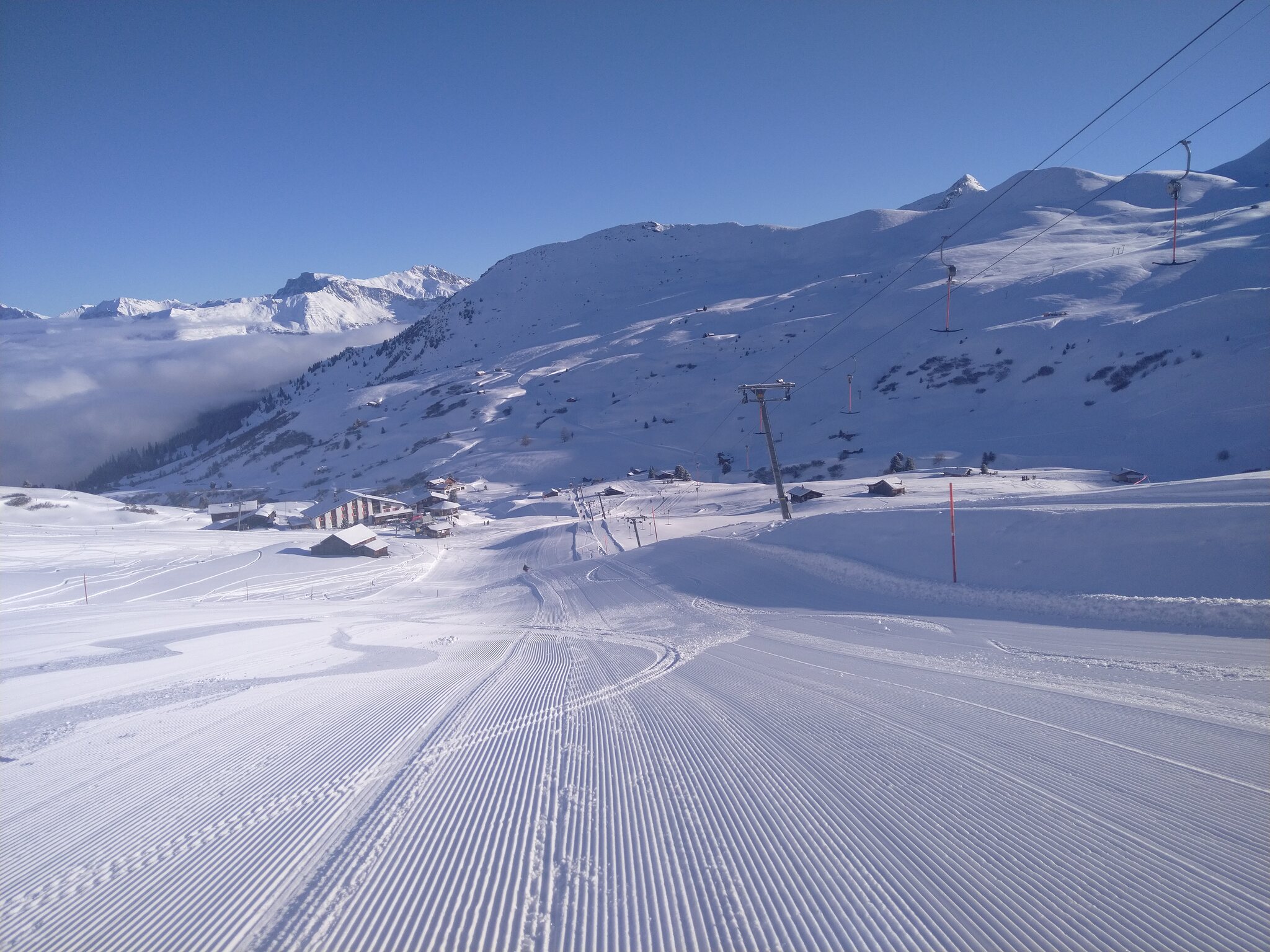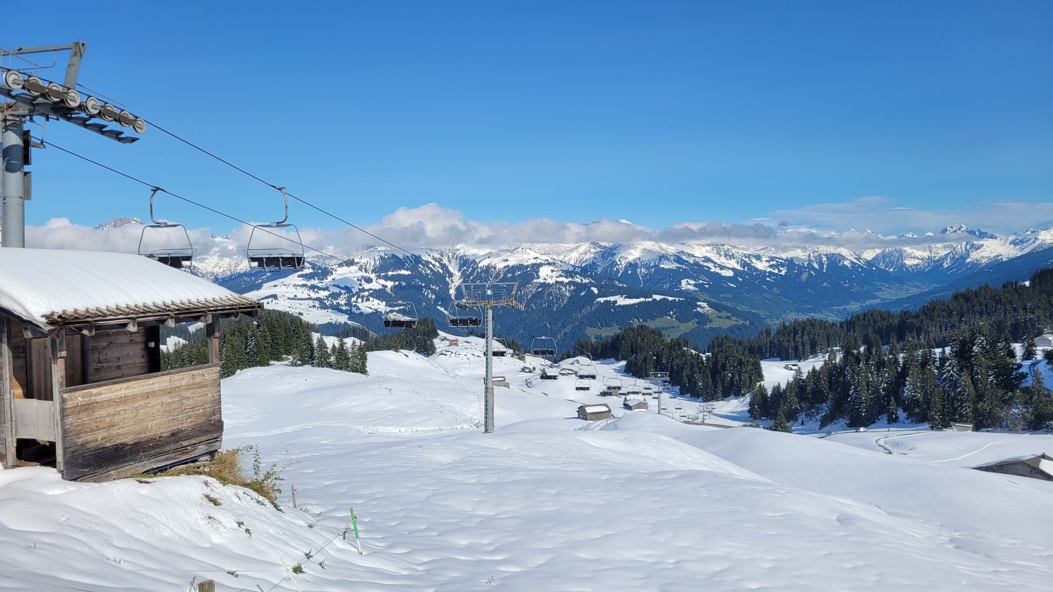 Schnee liegt ausserhalb der Pisten nur knapp, der Ausblick ins obere Prättigau Richtung Klosters ist genial: Der Andrang auf den einzigen Skilift geht bisher noch, die Rennteams stehen ja meistens rum: Die Skilift-Trassee hat trotz der geringen Schneemenge eine sehr dicke Schicht und ist frisch präpariert. Die sorgen wohl für den Worst Case vor und haben auch viele Schneehaufen angelegt.