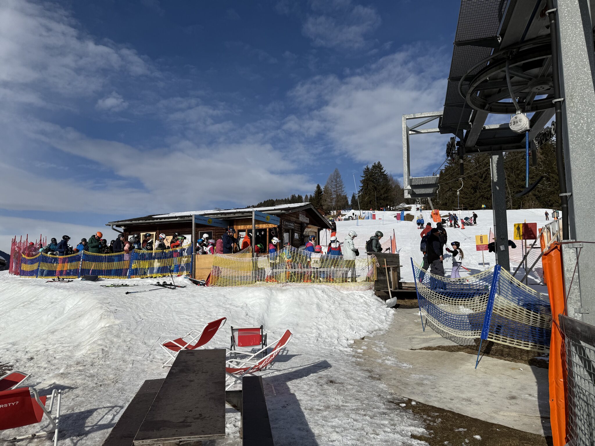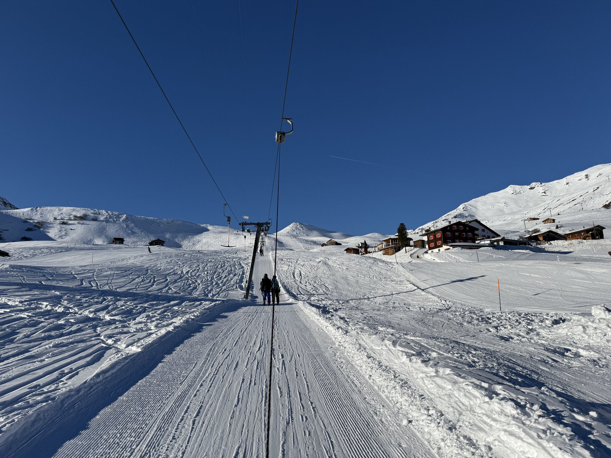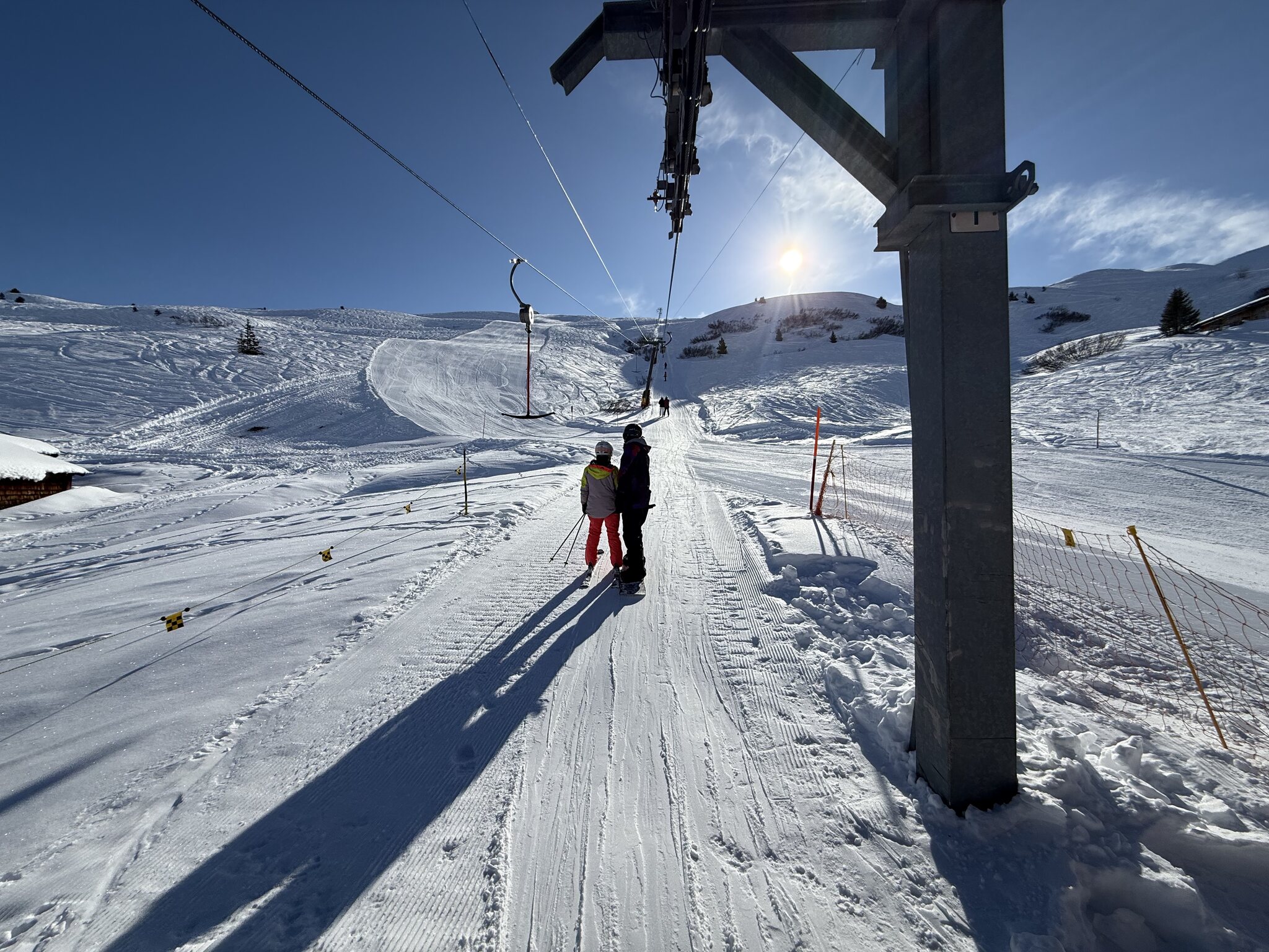 Schnee liegt ausserhalb der Pisten nur knapp, der Ausblick ins obere Prättigau Richtung Klosters ist genial: Der Andrang auf den einzigen Skilift geht bisher noch, die Rennteams stehen ja meistens rum: Die Skilift-Trassee hat trotz der geringen Schneemenge eine sehr dicke Schicht und ist frisch präpariert. Die sorgen wohl für den Worst Case vor und haben auch viele Schneehaufen angelegt.