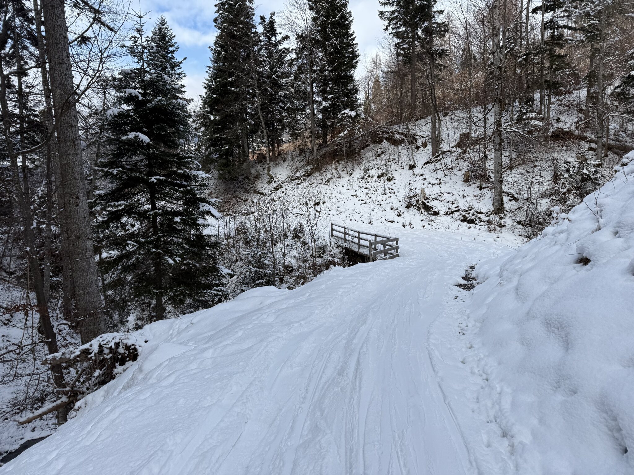 Die Talabfahrt/Schluttelbahn war unten ein wenig eisig, hatte aber meist eine Schneeauflage drauf und war ganz gut zu fahren. Keine Steine. Querfeldein ging es zum Teil durch tiefen Pulverschnee, top!