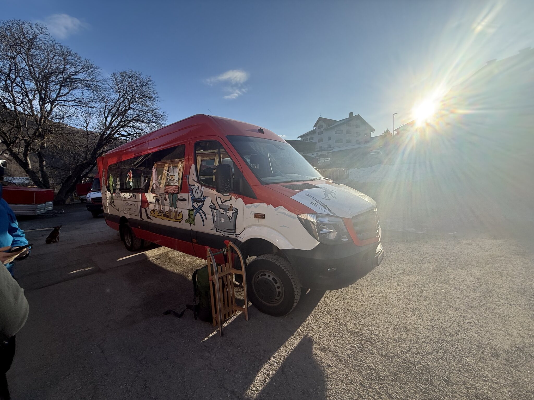 Draussen wartet schon der Bus, der bereits 9 Minuten vorher abfährt (Fahrplan wäre 09:00)