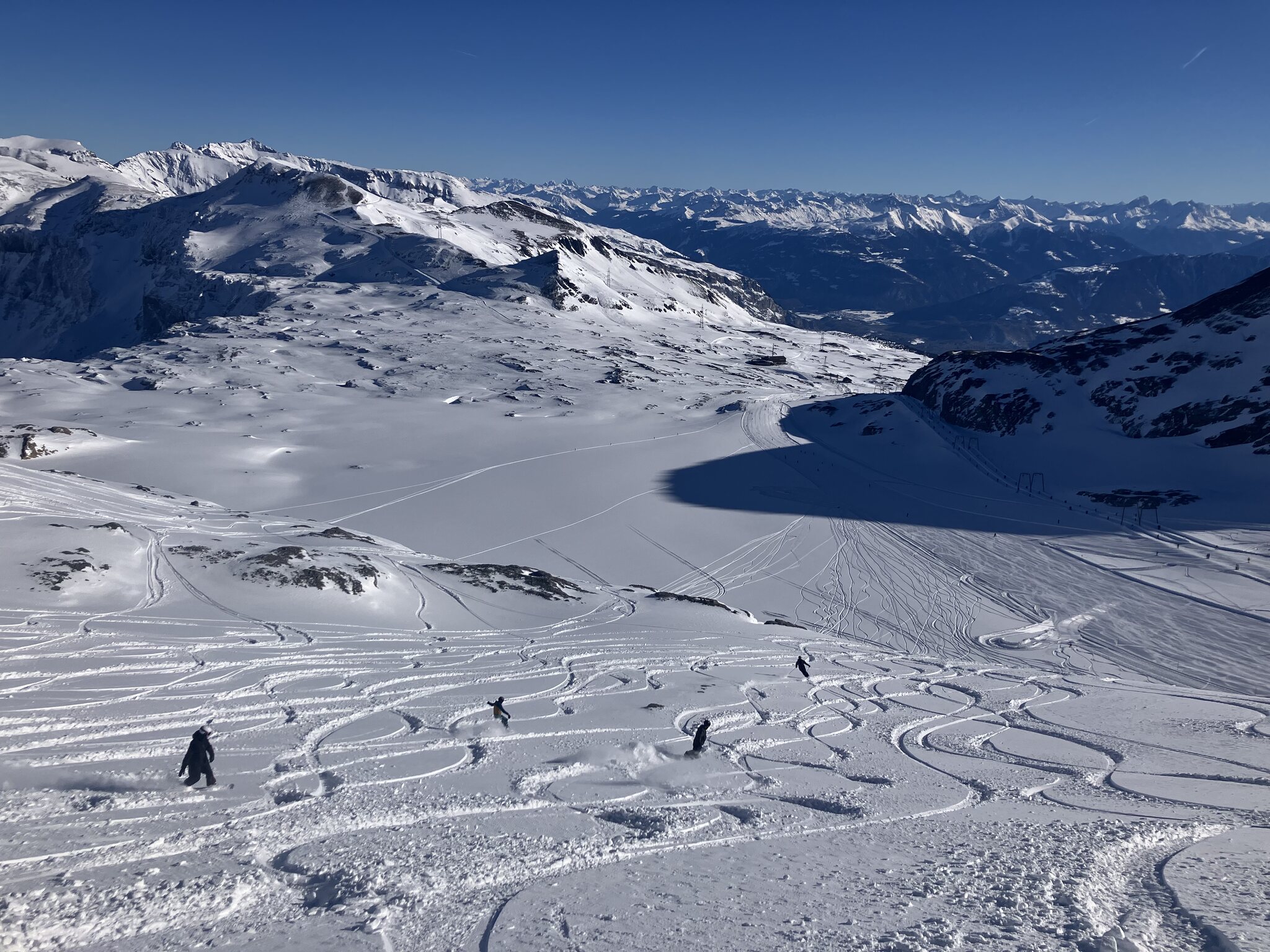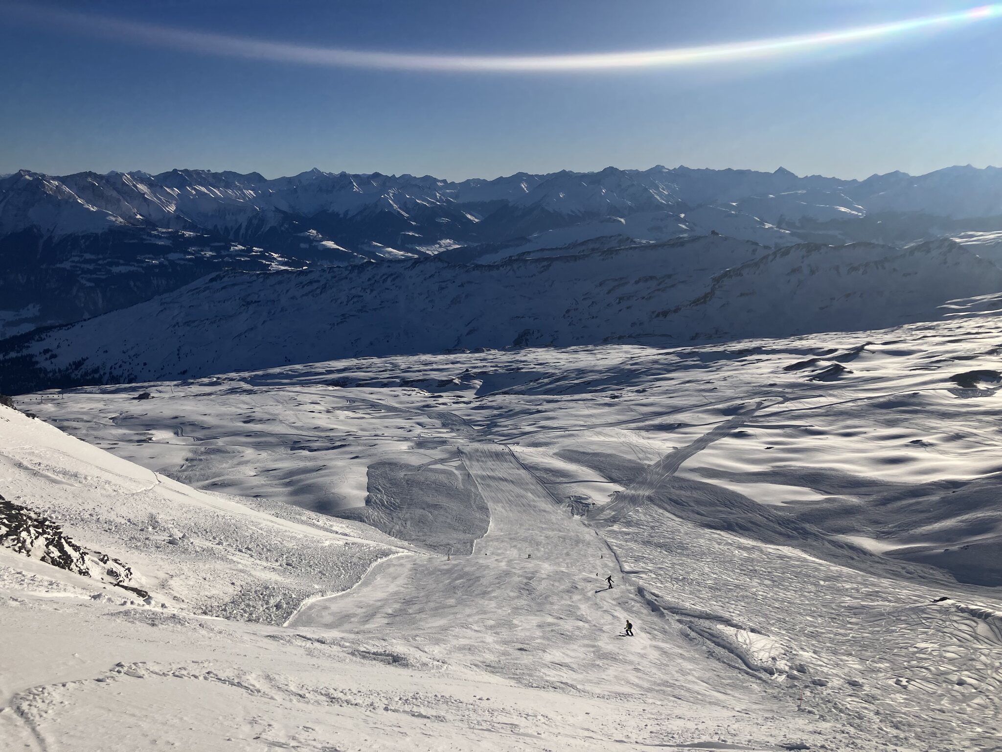 Wir sind, auch durch das Skirennen unseres jüngsten Sohnes, heute antizyklisch in den unteren Lagen gefahren: TalAbfahrt Laax über die leere und buckelige Fatschas und Talabfahrt Stetg nach Flims mit ebenfalls wenig Leuten.