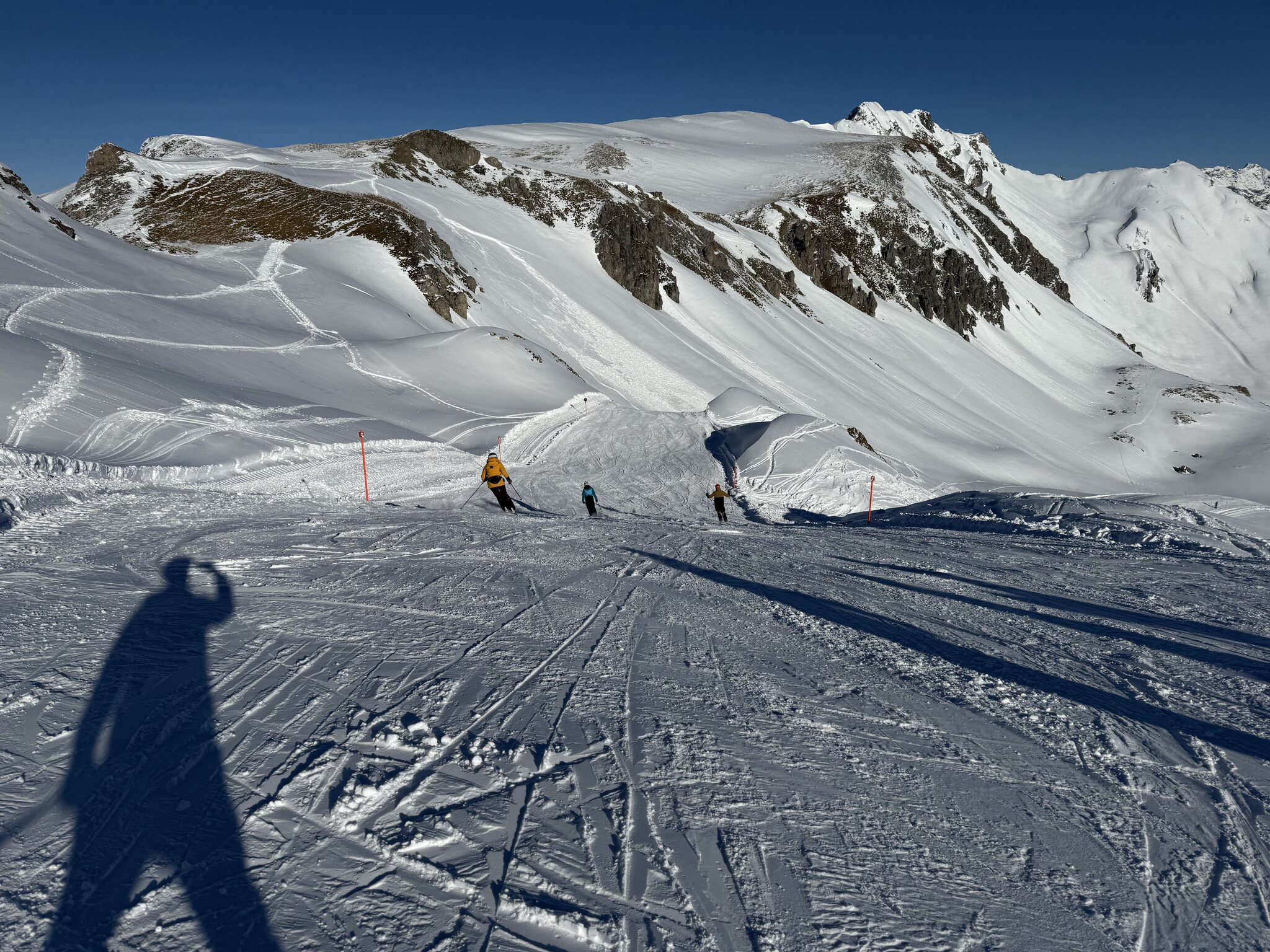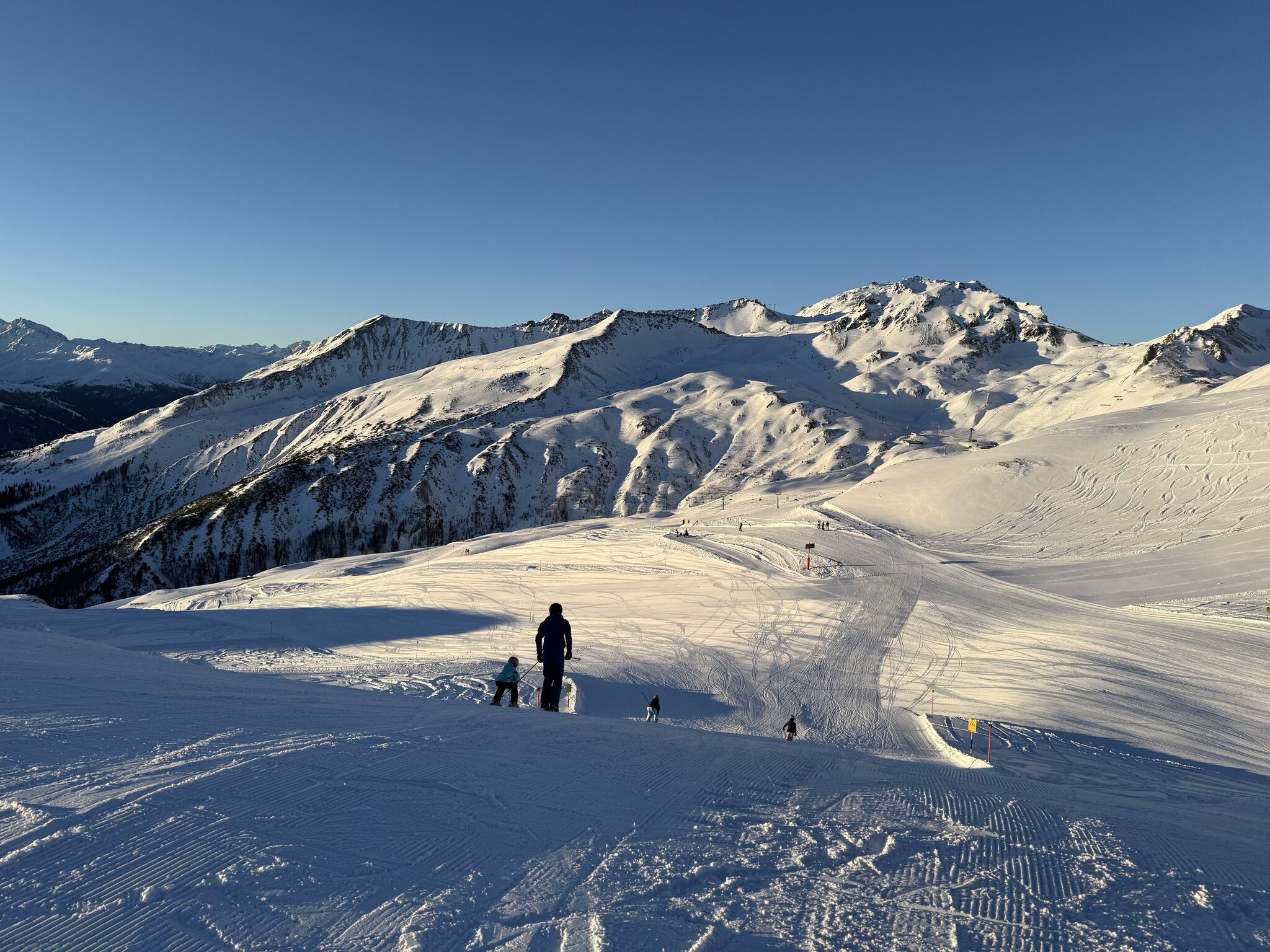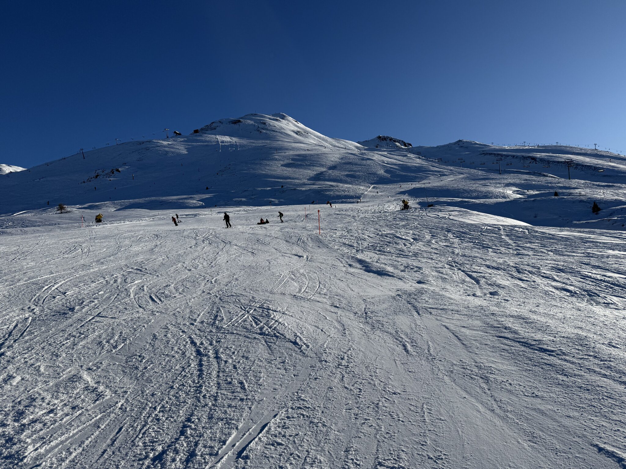Schnee hat es genug auf den Pisten, erstmals die blaue Bärnet gemacht, die oben noch nicht in der ganzen Breite präpariert ist: Auch um 14 Uhr waren die Pisten in gutem Zustand mit wenig Haufenbildung.