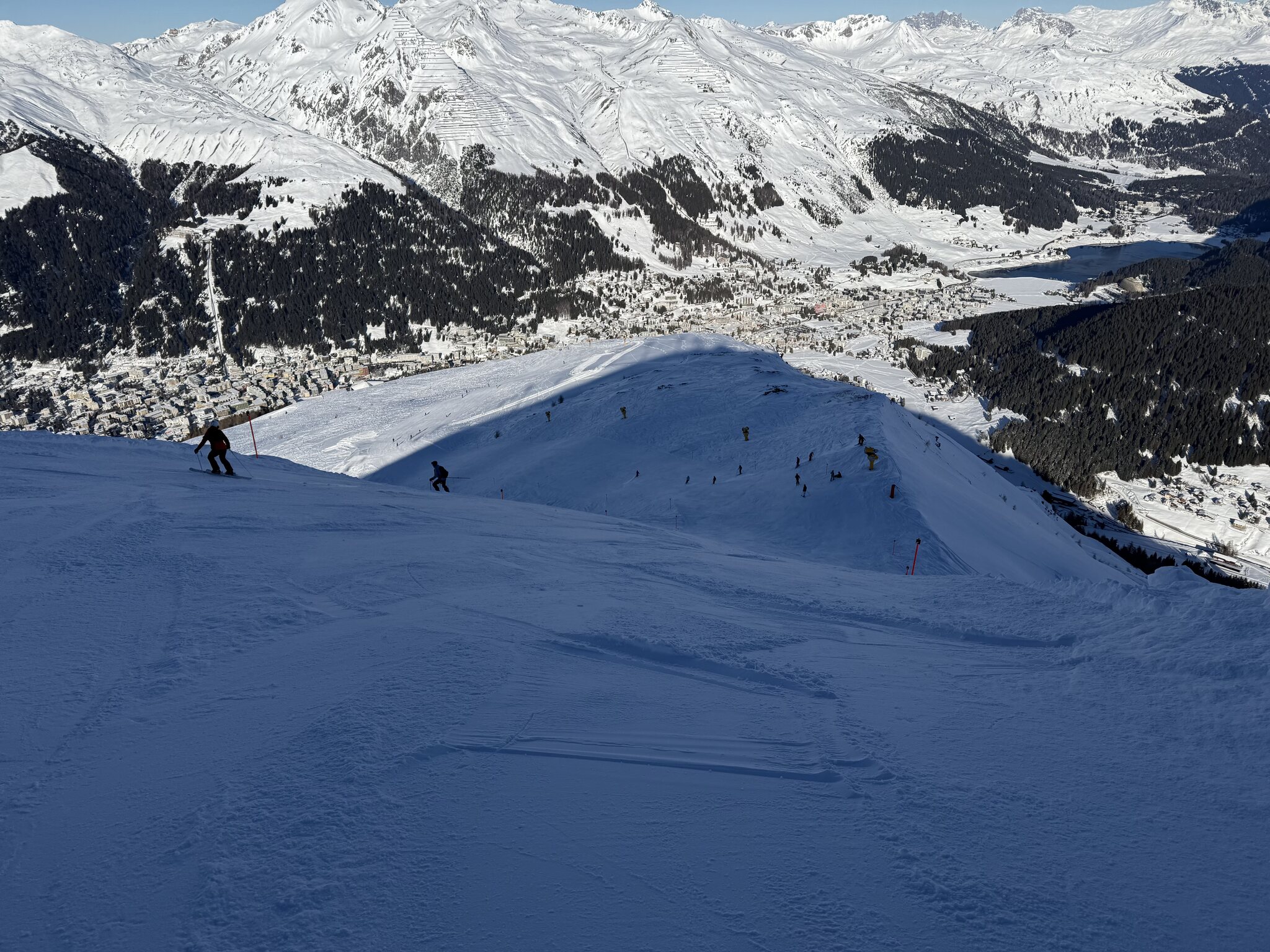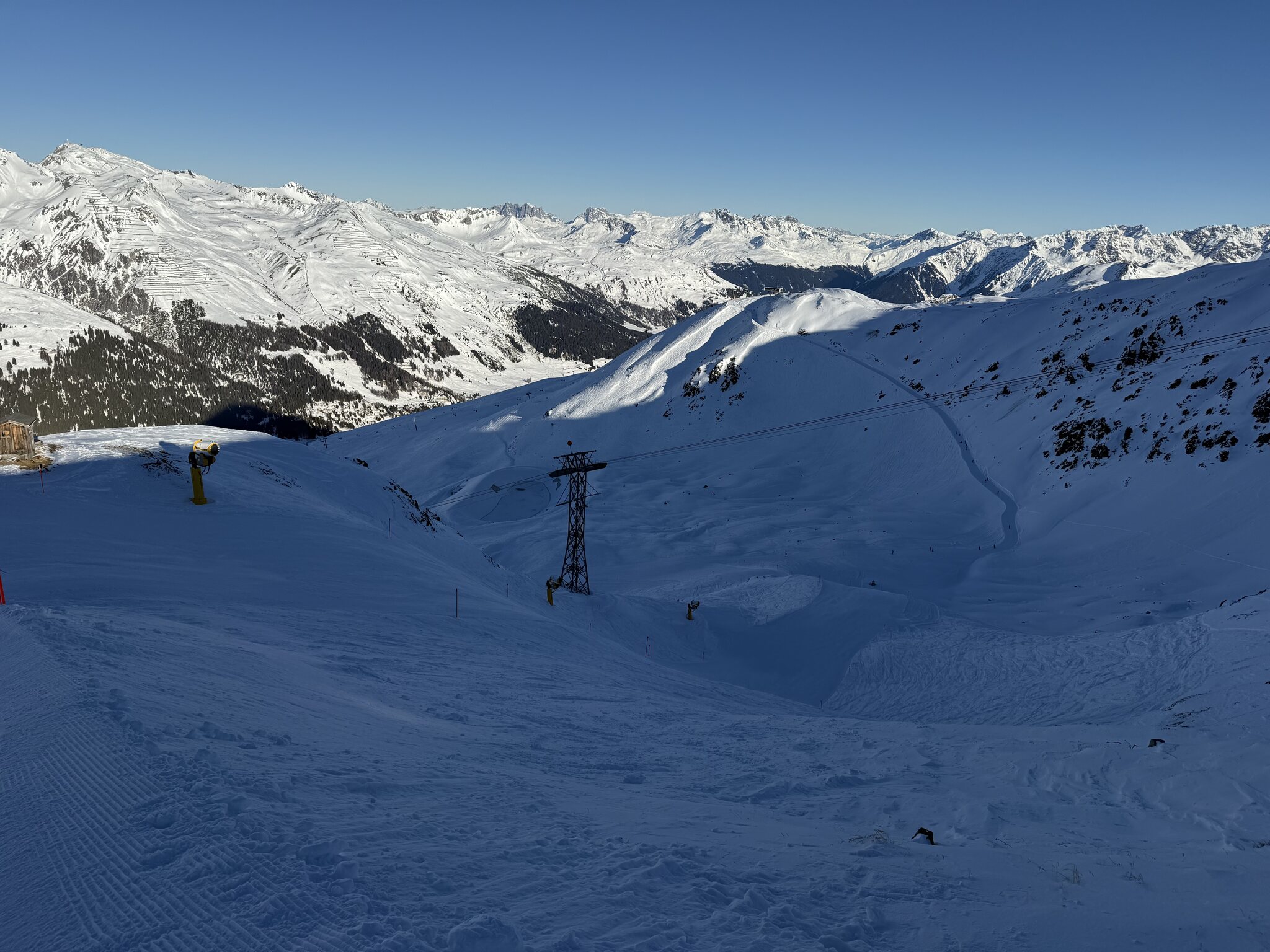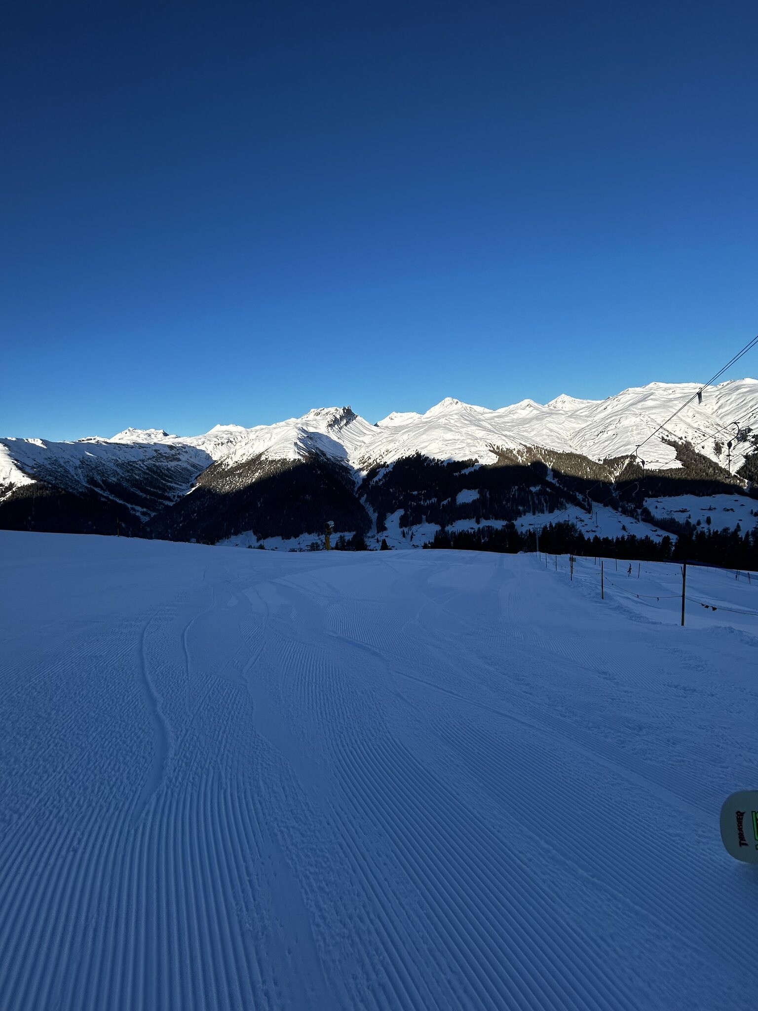 Die Pisten sind ganz gut, überall griffig und bis Mittag keine grosse Hügelbildung. Ich bin halt kein grosser Freund vom Jakobshorn, die schrägen Hauptachsen gefallen mir weniger gut.