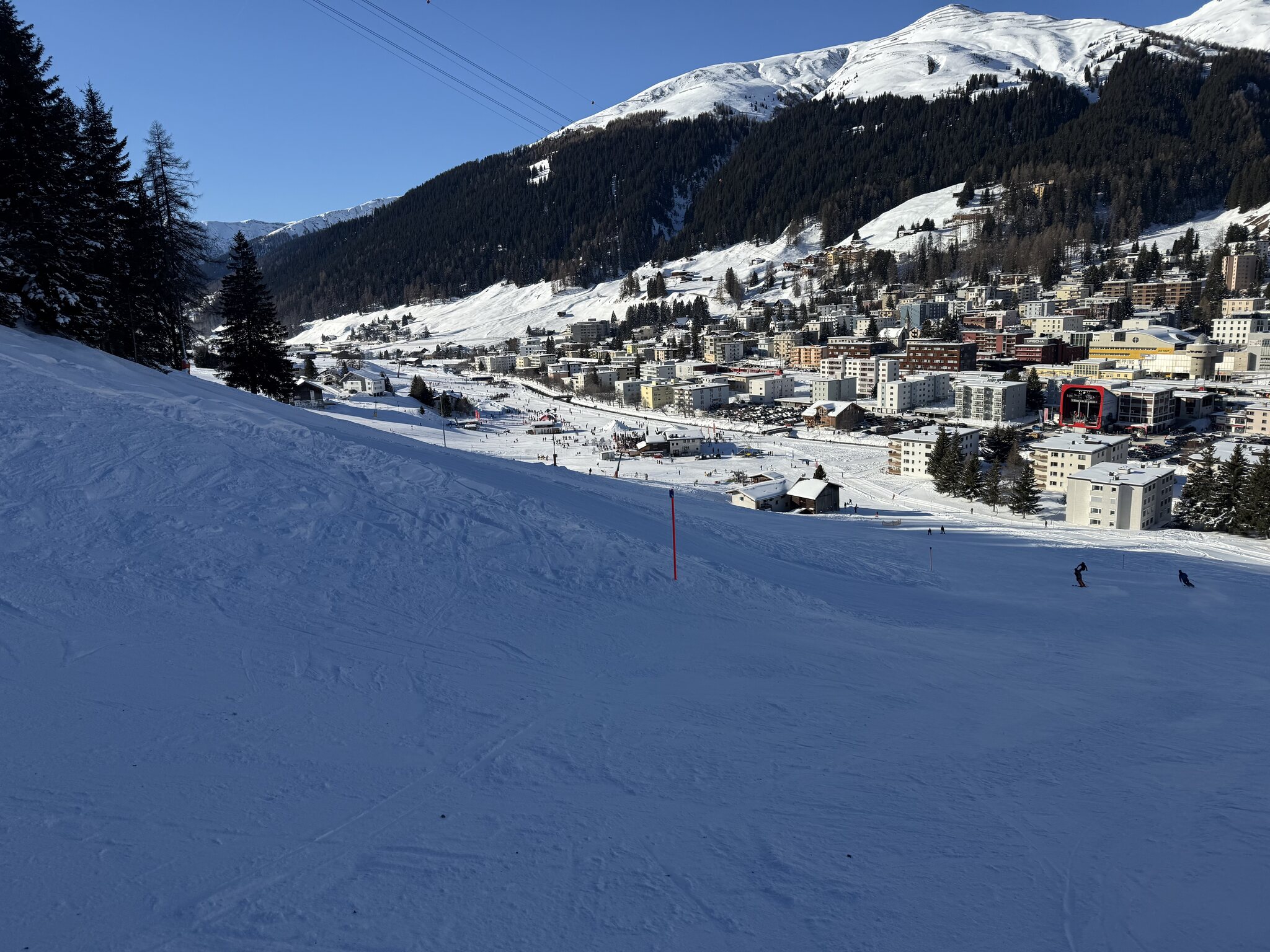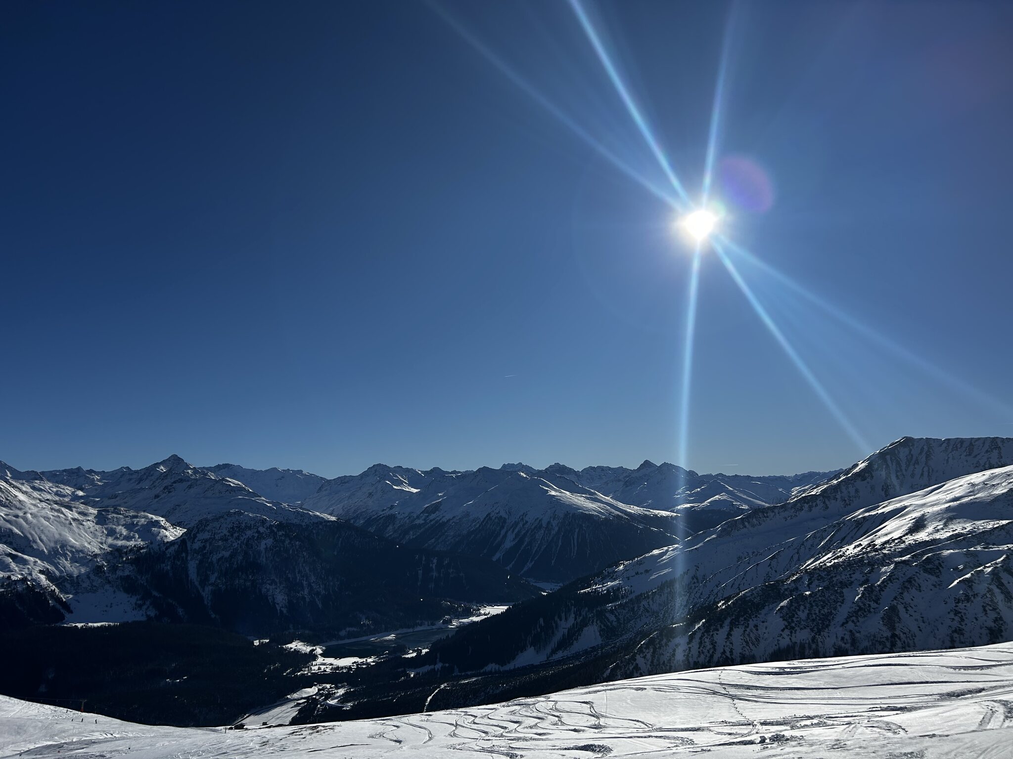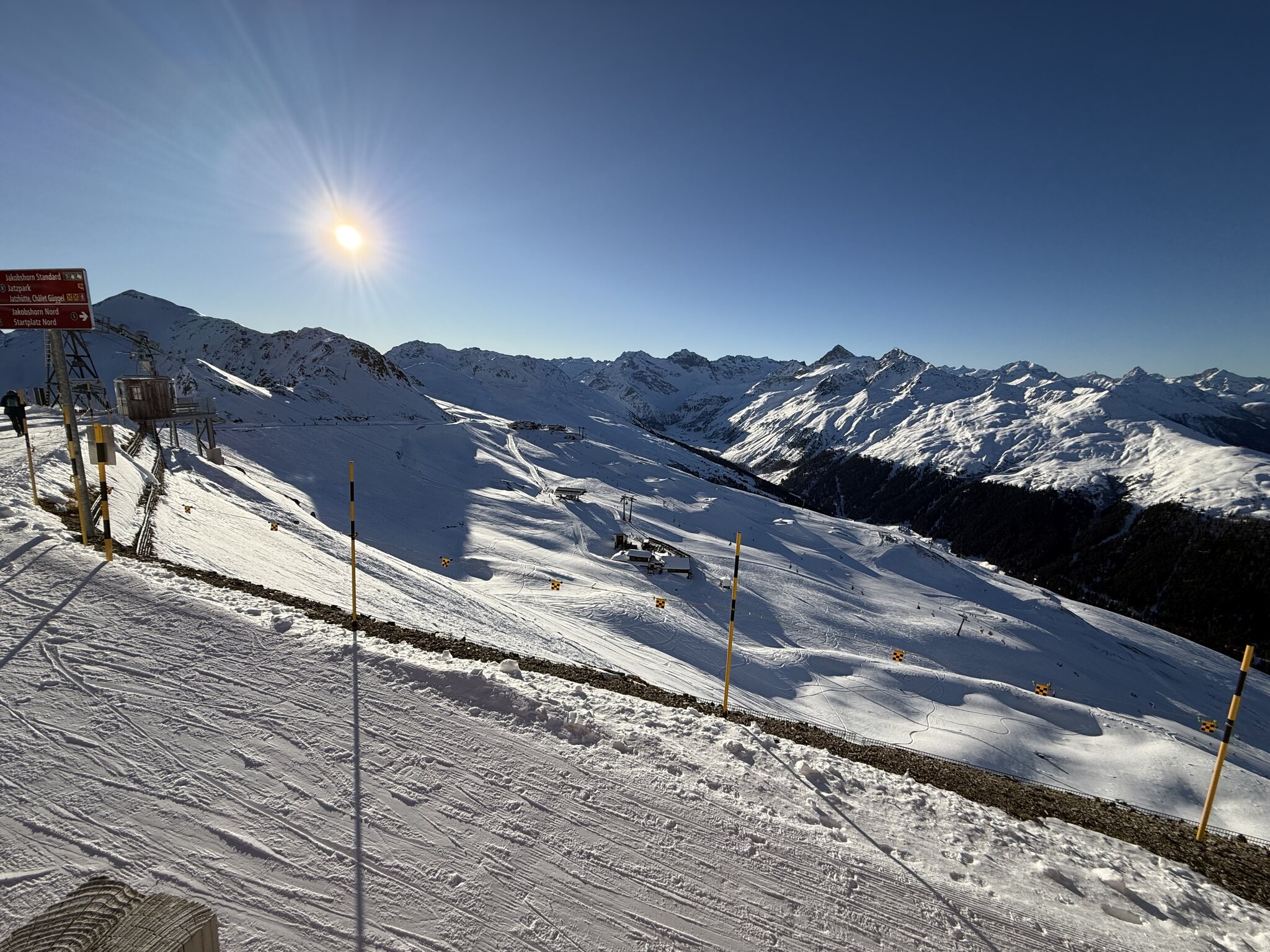 Die Pisten sind ganz gut, überall griffig und bis Mittag keine grosse Hügelbildung. Ich bin halt kein grosser Freund vom Jakobshorn, die schrägen Hauptachsen gefallen mir weniger gut.