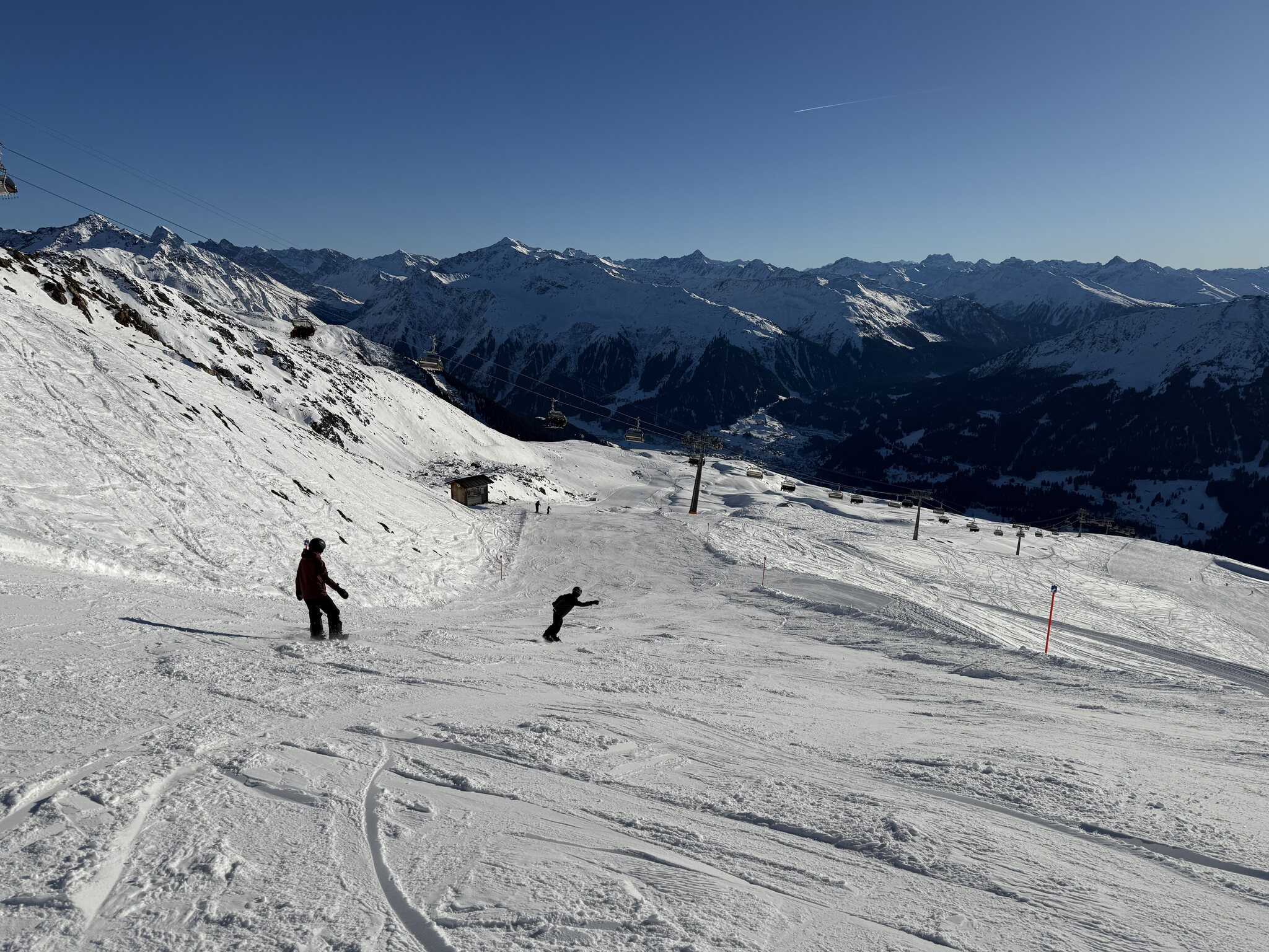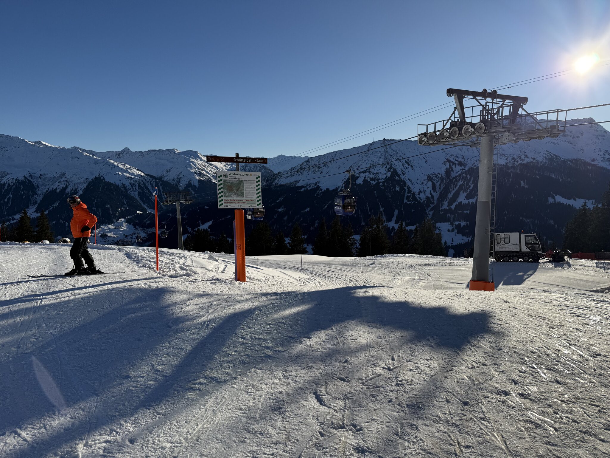 Momentan ist bis auf den Madrisalift und die schwarze FIS alles offen. Den ganzen Tag hatte man keine grossen Wartezeiten oben, das einzige Nadelöhr war wie immer die Talstation.