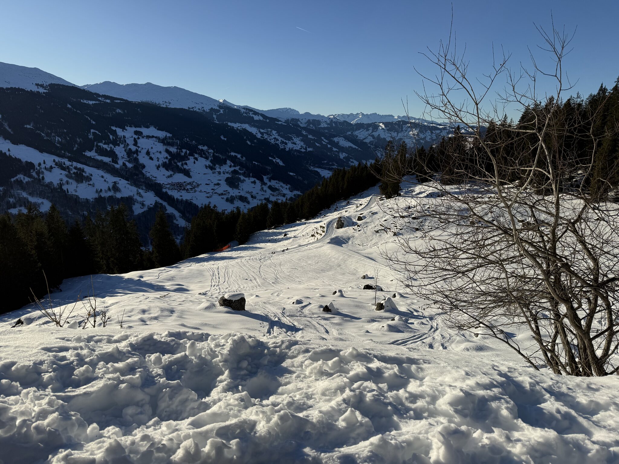 Am Nachmittag noch den Schlittelweg von der Madrisa nach Saas gemacht, oben top, unten ein wenig knapp ganz unten, geht aber noch tip top bis zum Ende des Schlittelwegs.