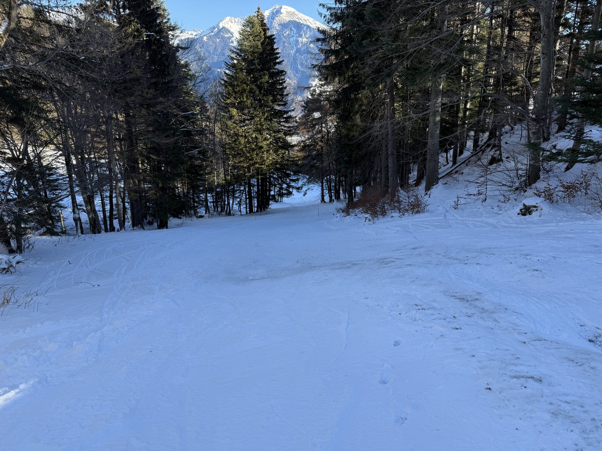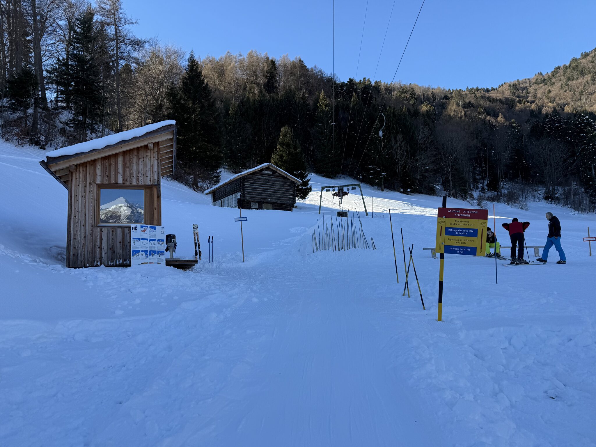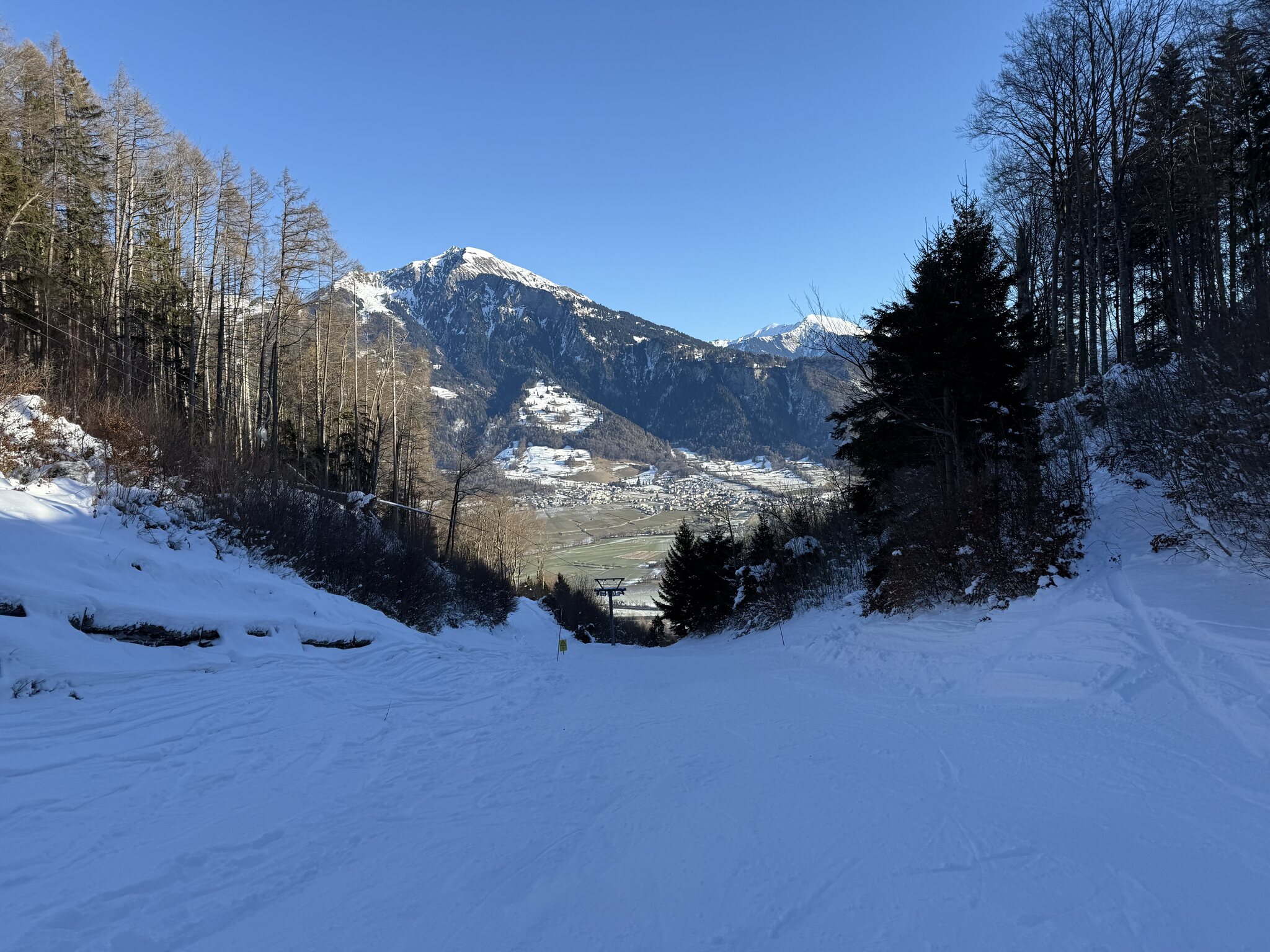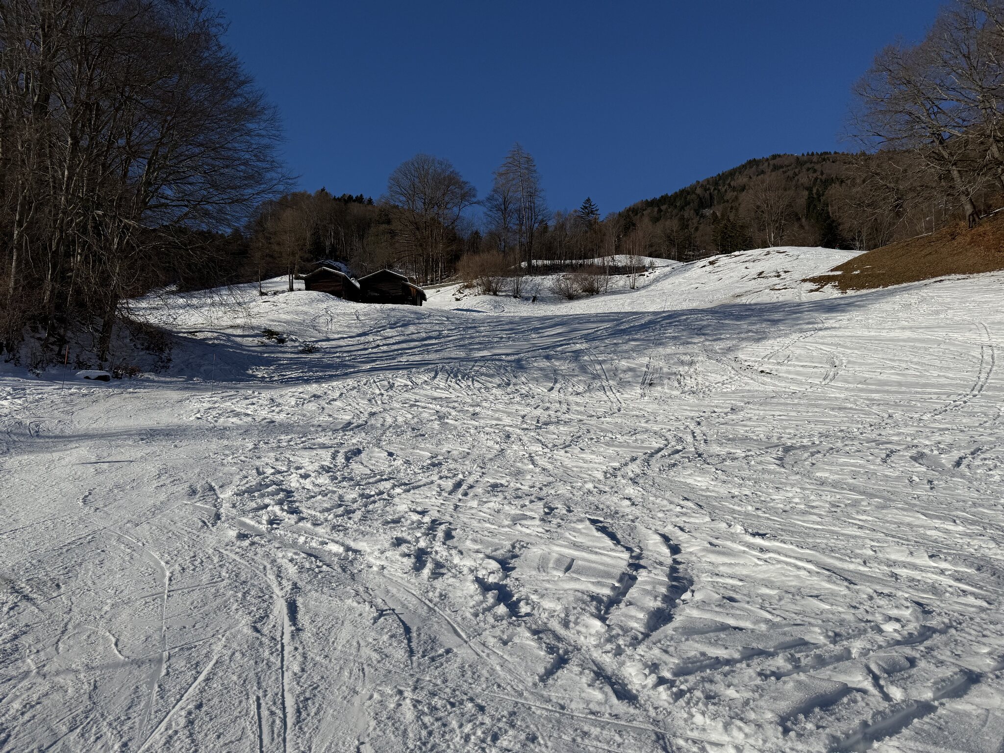 Es gibt eine blaue und eine rote Piste, die zuunterst beim letzten Hang wieder zusammenkommen. Oben ist tip top zu fahren, wobei die rote in einem besseren Zustand ist. Unten ist ein wenig brauner, man kann aber gut durch den Tiefschnee ausweichen.