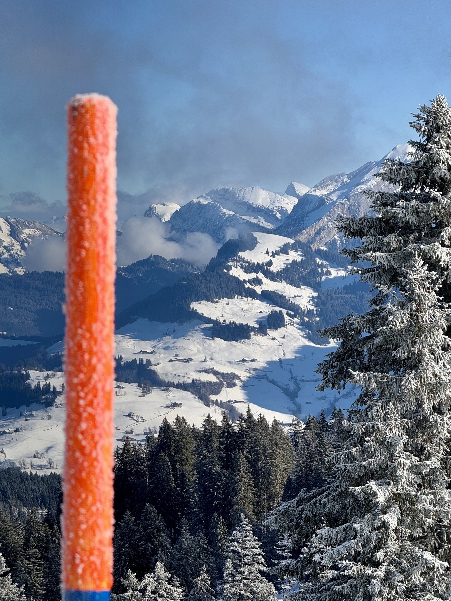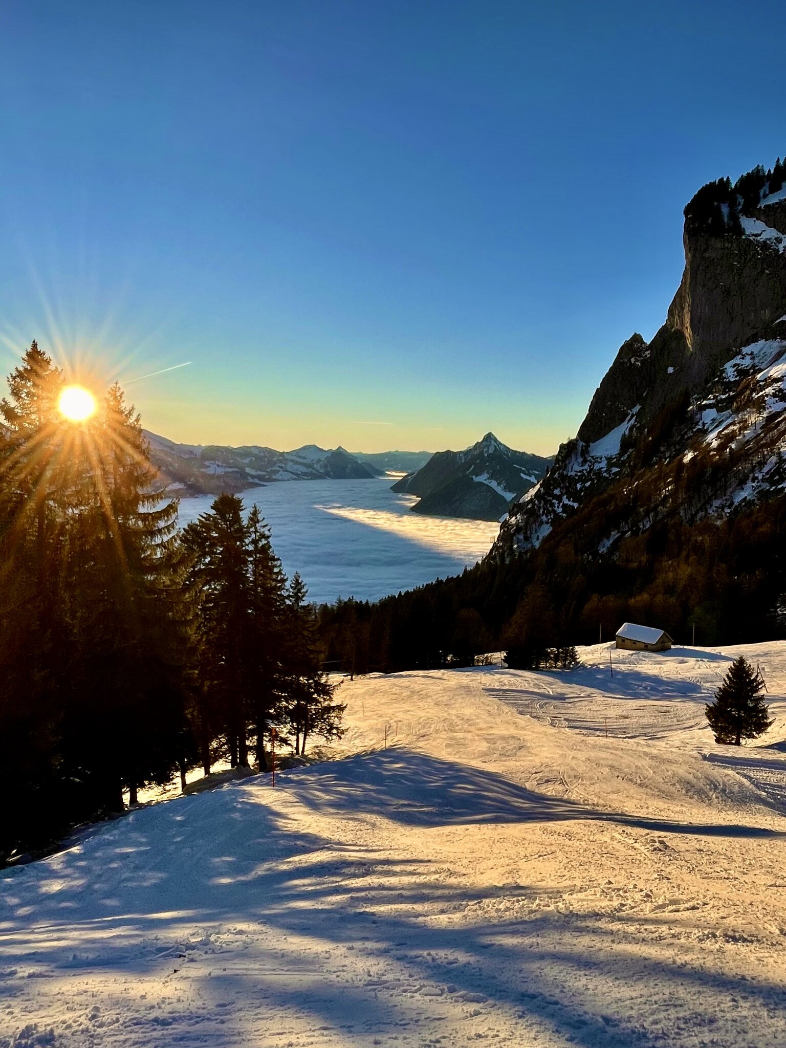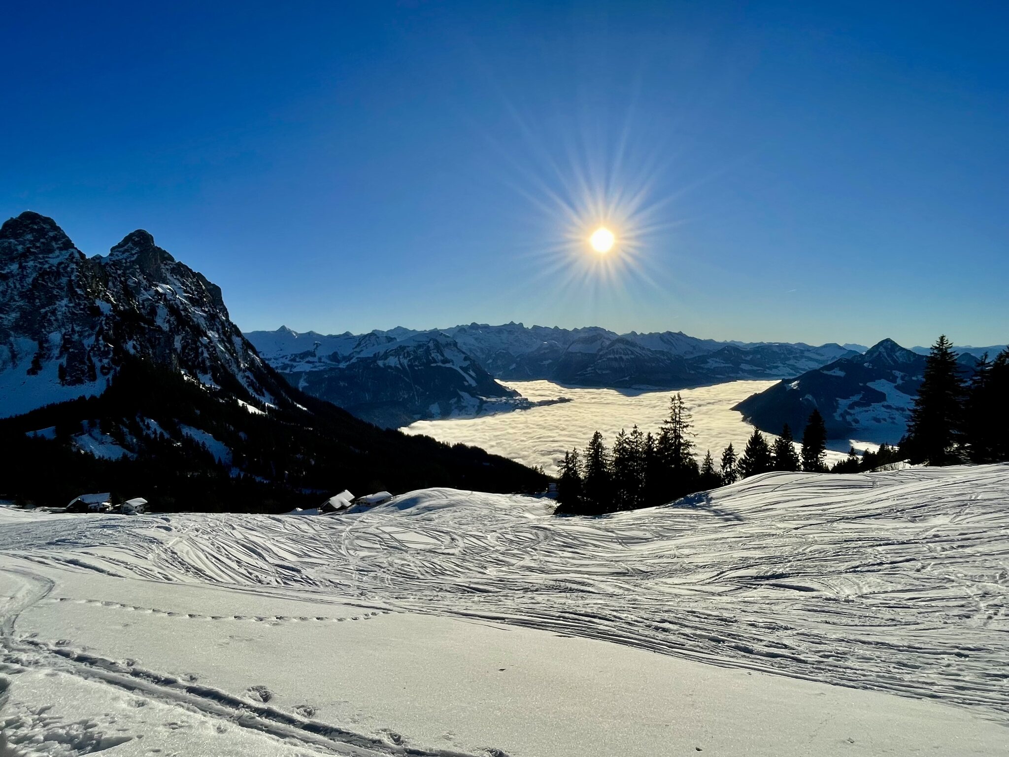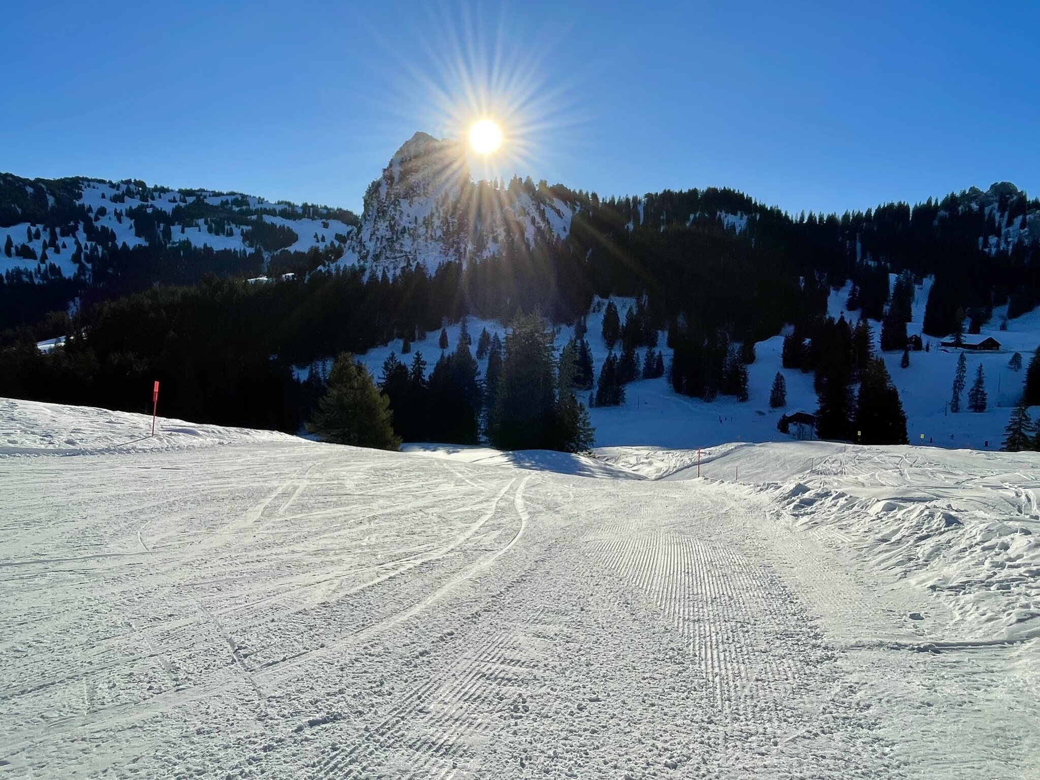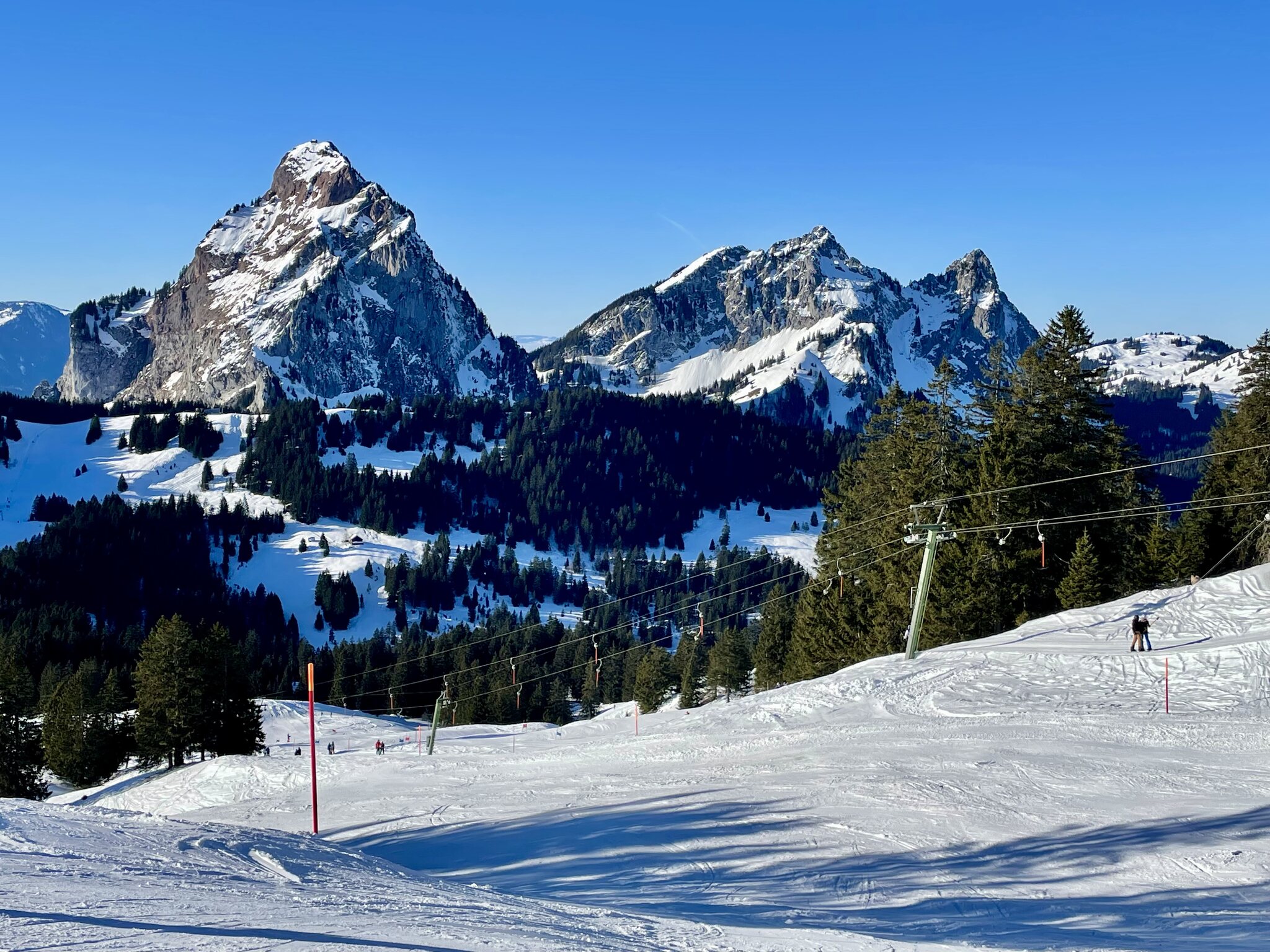 Parkplätze und Busse waren alles sehr voll, im Gebiet verteilt es sich aber super, so gut kann man glaube ich nirgends fahren, hat genug Platz auf der Piste und muss auch kaum anstehen. So um 5min waren die grösseren Wartezeiten. Der Schnee am morgen pulvrig und gut präpariert, nahm dann an den stark besonnten Hängen der Ibergeregg schnell sulzige Ausmasse an. Da keine wirkliche Unterlage vorhanden ist kam so hin und wieder braun hervor, störte aber nur stellenweise. Wetter war bombastisch und Aussichten einfach toll. Nun kurz zu paar Fotos: Fast ein 10 Punkte Tag nur 1 Punkt abzug für die braunen Stellen und Sulz.