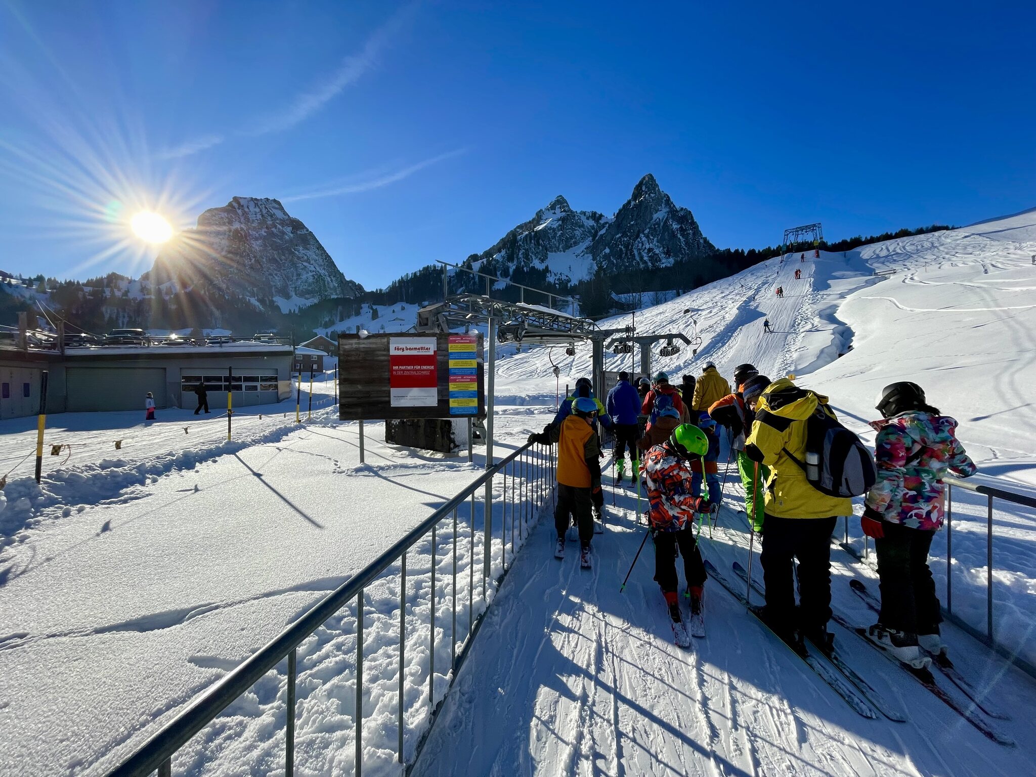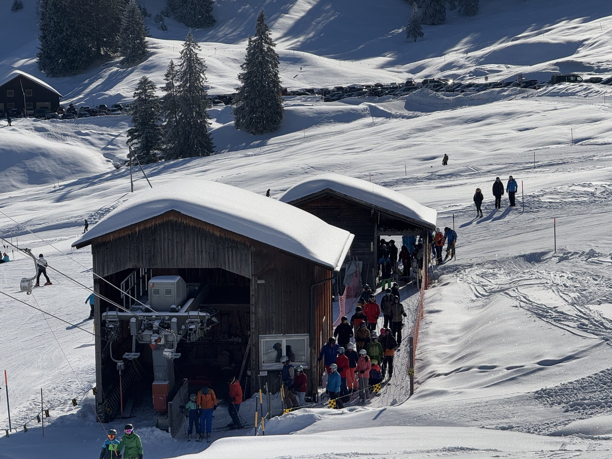 Beim Skilift Handgruobi sah es zuerst wie in den News zu den Vail Skigebieten aus, schlussendlich habe ich aber höchstens 10-15 Min. gewartet. Leider war dann auch bei den nächsten Liften jeweils Warten fast wie in den 80ern angesagt, was bei den relativ kurzen Liften schon etwas ärgerlich ist (insbesondere wenn die Konditionen auf der Piste so gut sind und man am liebsten endlich Ski fahren möchte). Ab ca. 13 Uhr leerte es sich dann aber (es gibt ein Vormittagsticket, das wohl viele "Einheimische" verwenden) und man musste je nach Lift nicht mehr anstehen.