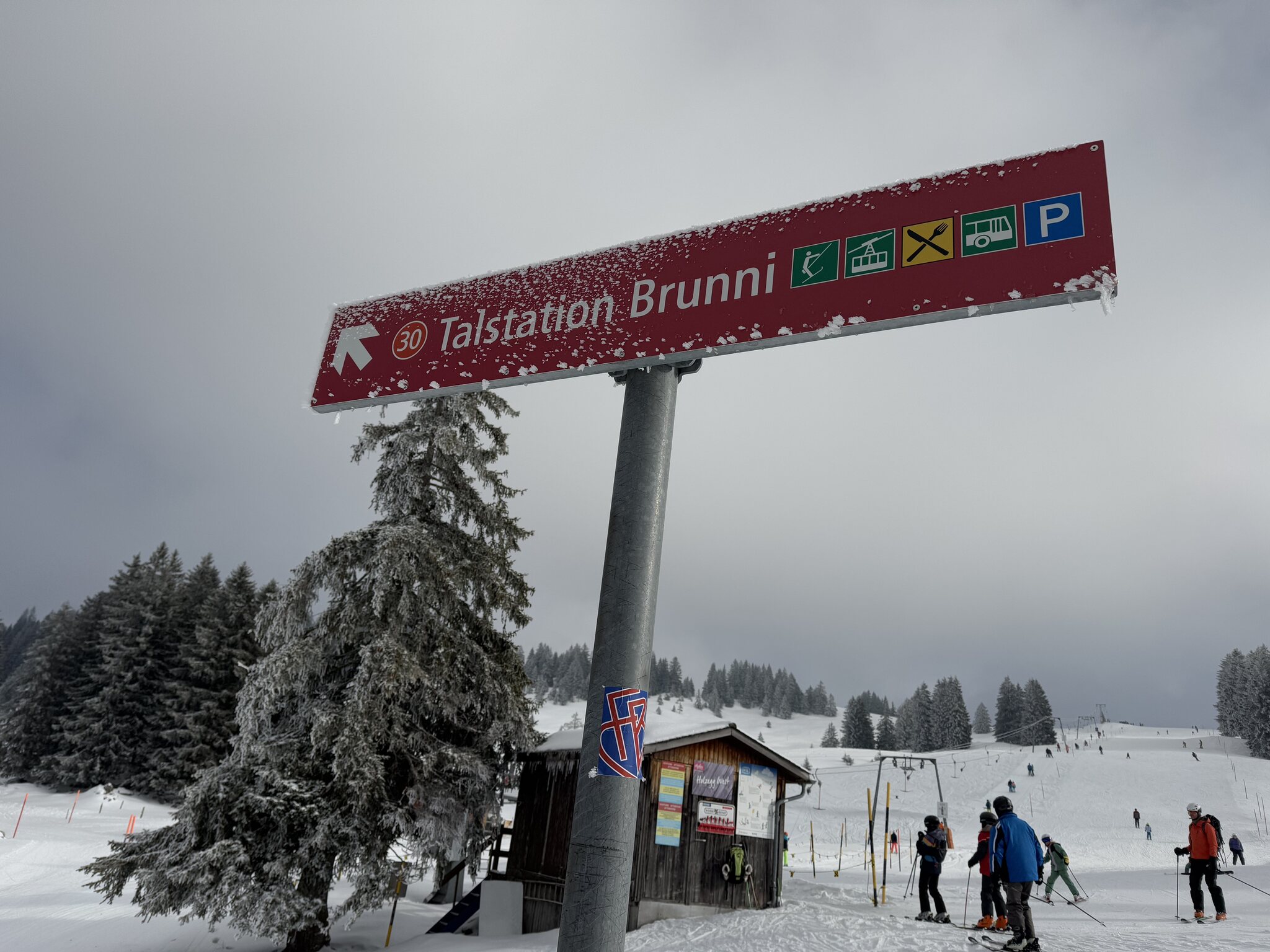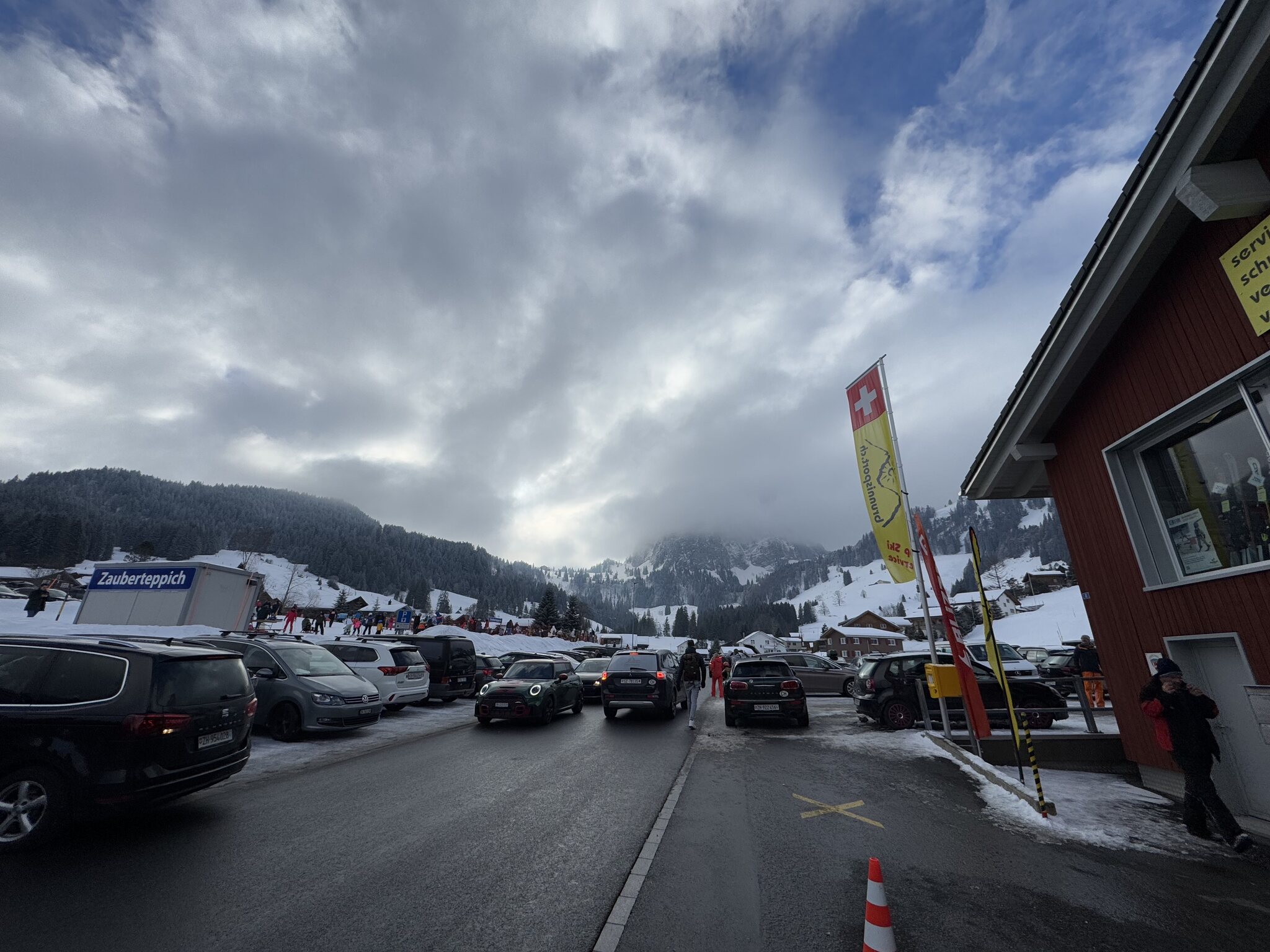 Der Schnee war grösstenteils pulvrig-gut, ausser auf den Abschnitten in der Gegend von Schneelanzen (die liefen nonstop) eisig. Es hatte genügend Schnee bis zum Parkplatz resp. auch bis Brunni, wo ich mir ebenfalls das Gebiet ansehen wollte. Die Abfahrt bis Brunni war ganz gut, und wohl die Längste an diesem Tag für mich. Brunni selbst kam mir wie ein riesiger Parkplatz vor, das Dorf war an diesem Tag komplett voll und roch nach Wurstständen.
