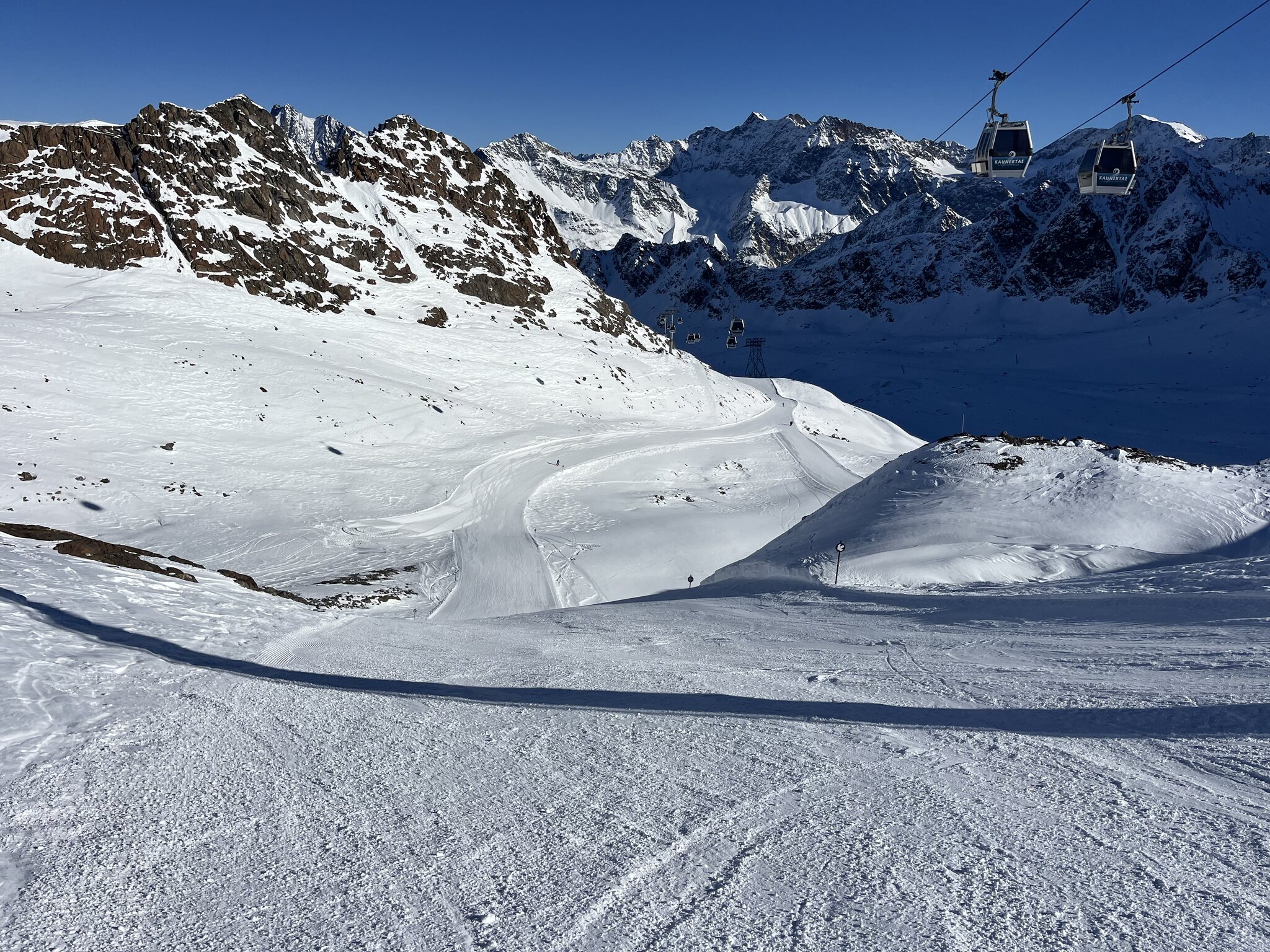 Die Fahrt ist ja schon mühsam. Ich denke es jedes Mal. Und trotzdem geniesst der Kaunertaler Gletscher bei mir einen sehr hohen Goodwill. Zwar klein, aber mittlerweile gute Lifte, immer top präpariert und sehr freundlich. Momentan das Hauptproblem für meine Männer: der Schatten. Die Sonne geht hier, ähnlich wie bei Snow Wally in Åre erst um 10 Uhr auf