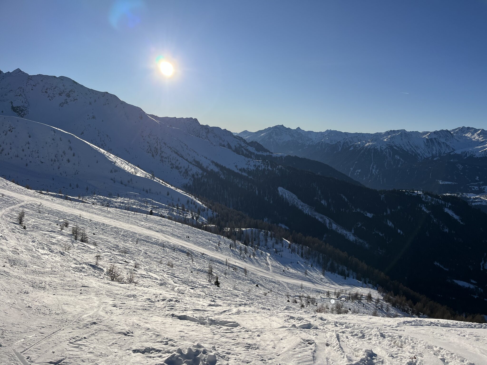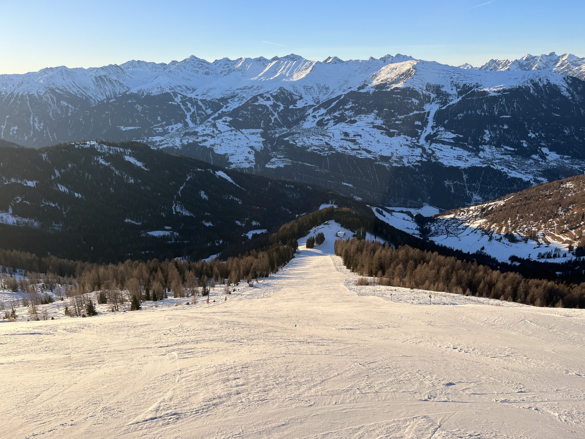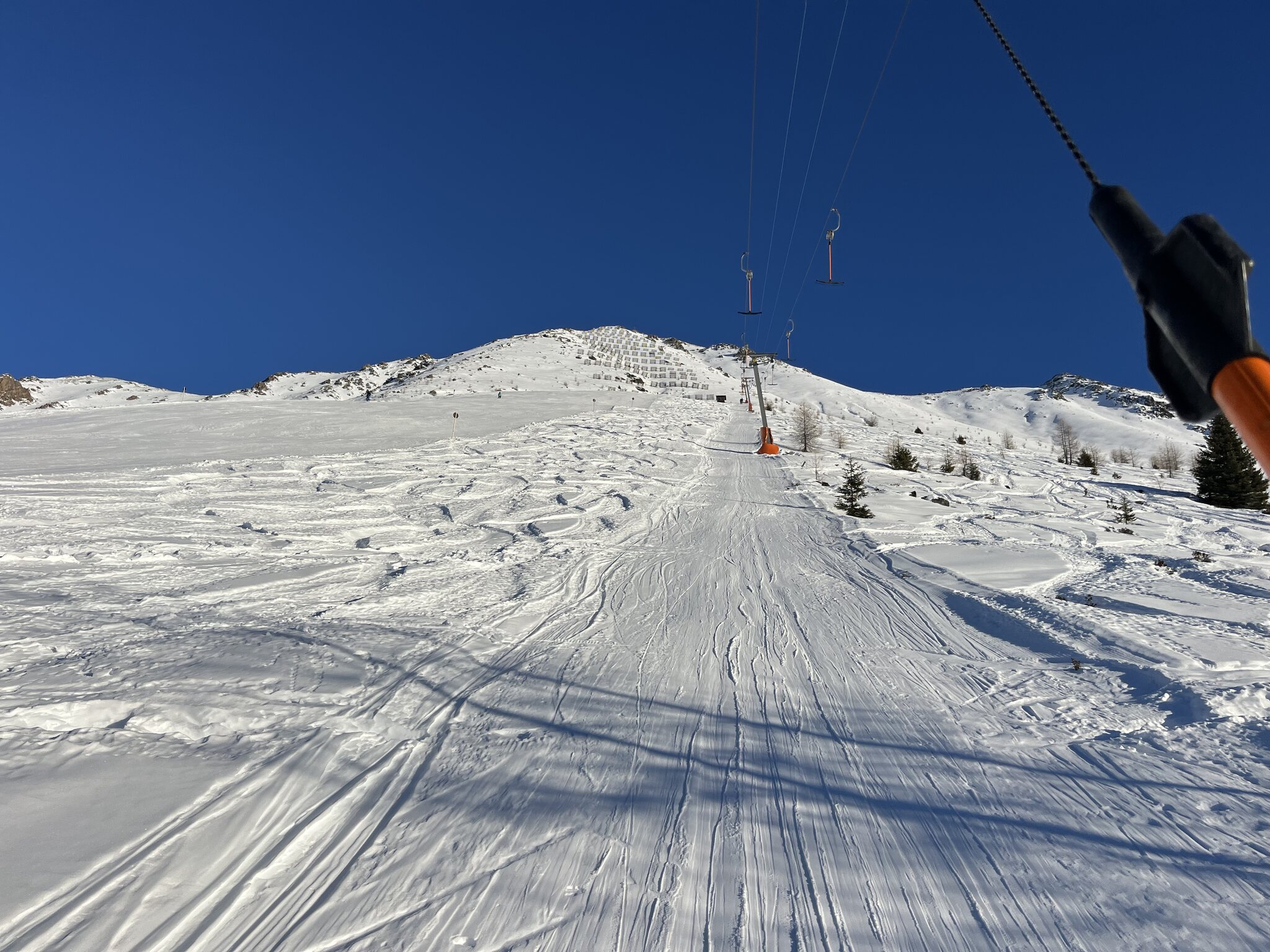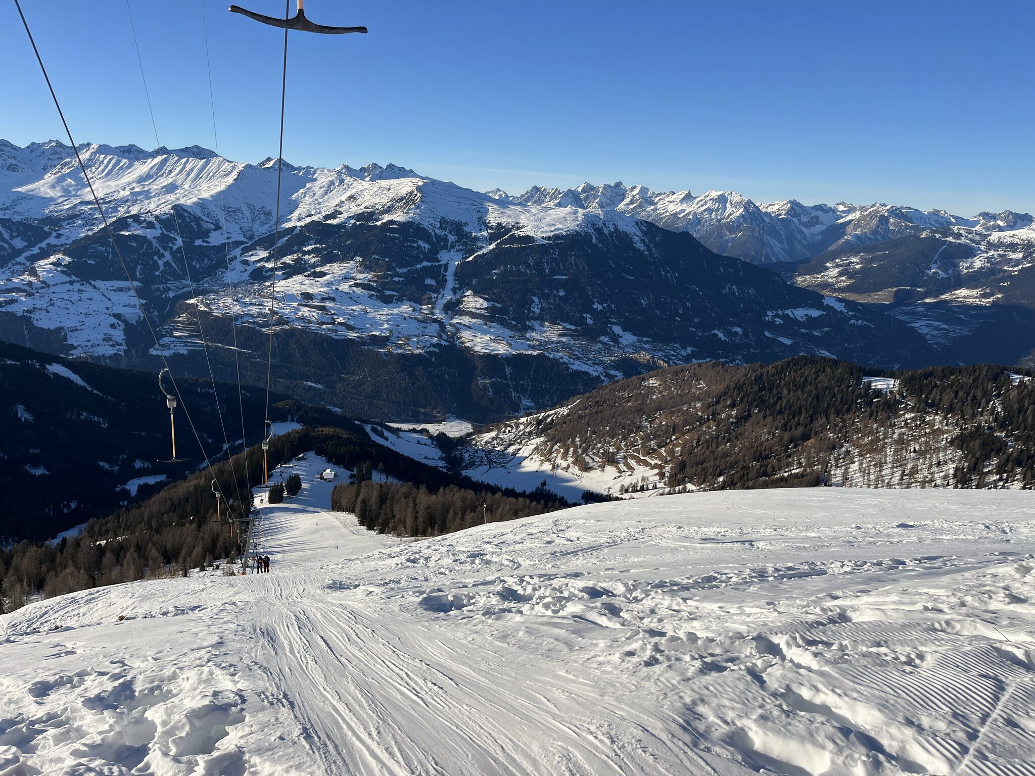 Gut haben wir nicht früher gewechselt. Fendels überzeugt überhaupt nicht. Die schrottigen Lifte wären uns ja noch egal, aber dass wir alle drei die Skier zerkratzt haben, nicht. Es hat sehr viele Steine. Selbst dort, wo beschneit wäre. Und auf der roten Talabfahrt hat es viele Eisplatten. Die beste Piste ist die am Übungs-SL, den wir nehmen, um nicht zur KSB-Station hochlaufen zu müssen. Die Piste am steilen SL wäre genial, die Aussicht sowieso. Aber so macht es keinen Spass. Man hat ständig Angst um die Skis. Hier gibt es nur 5 Punkte.