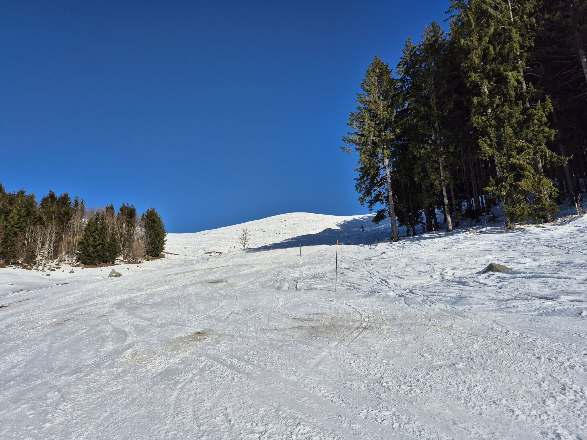Der Lift war heute ebenfalls geöffnet. Die beiden geöffneten Pisten waren noch gut fahrbar, hatten jedoch einige braune Stellen, die aber problemlos umfahren werden konnten. Angesichts der sonnigen Ausrichtung hält der Lift bisher erstaunlich gut durch, und die Präparation war nahezu perfekt. Auch hier war es total entspannt und nur sehr wenig los.