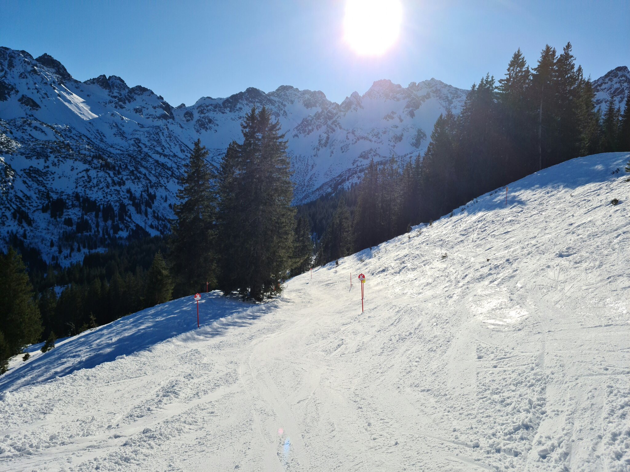 #10- Doch erstmal ging es über die Talabfahrt zur Kanzelwandbahn. Sie war leider bereits relativ eisig und auch, weil wohl viele Leute ihren Skitag bereits beendeten, an den schmalen Bereichen relativ voll, während es sich an den breiten Stücken gut verteilte.