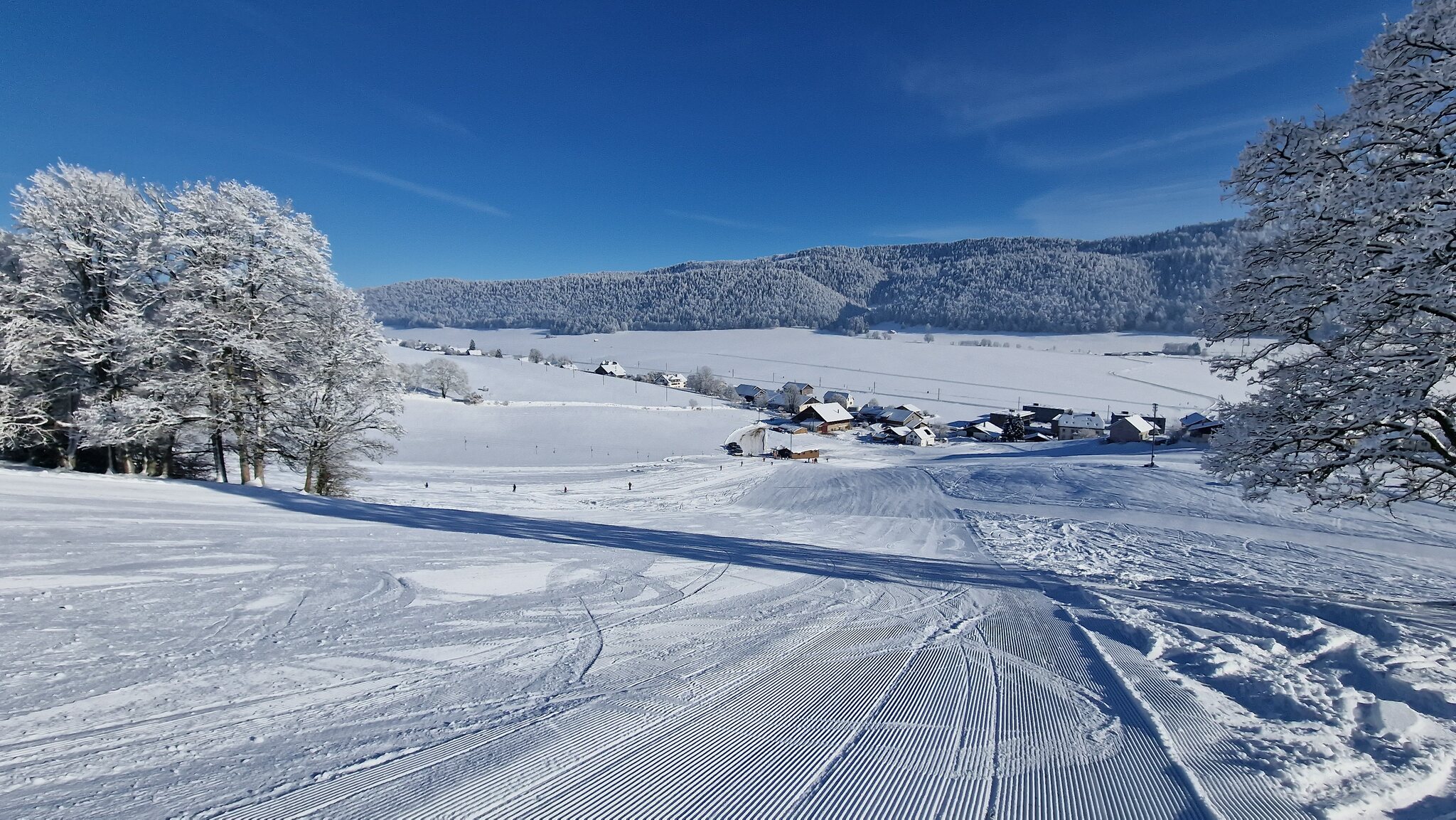 Die kleine Anlage aus dem Hause Baco steht hinter dem Dorf und erschliesst einen sanften Wiesenhang. Mit einer Länge von 440 Metern und 100 Höhenmetern ist der Lift überschaubar, bietet aber dennoch zwei gemütliche Abfahrten, die tadellos und mit viel Hingabe präpariert werden. Gerade einmal drei Stützen genügen, um das Seil mit seinen blauen Tellergehängen in Position zu halten. Der Lift wird vom örtlichen Skiclub betrieben, und vieles läuft hier auf Vertrauensbasis – Drehkreuze und elektronische Tickets sucht man vergeblich.