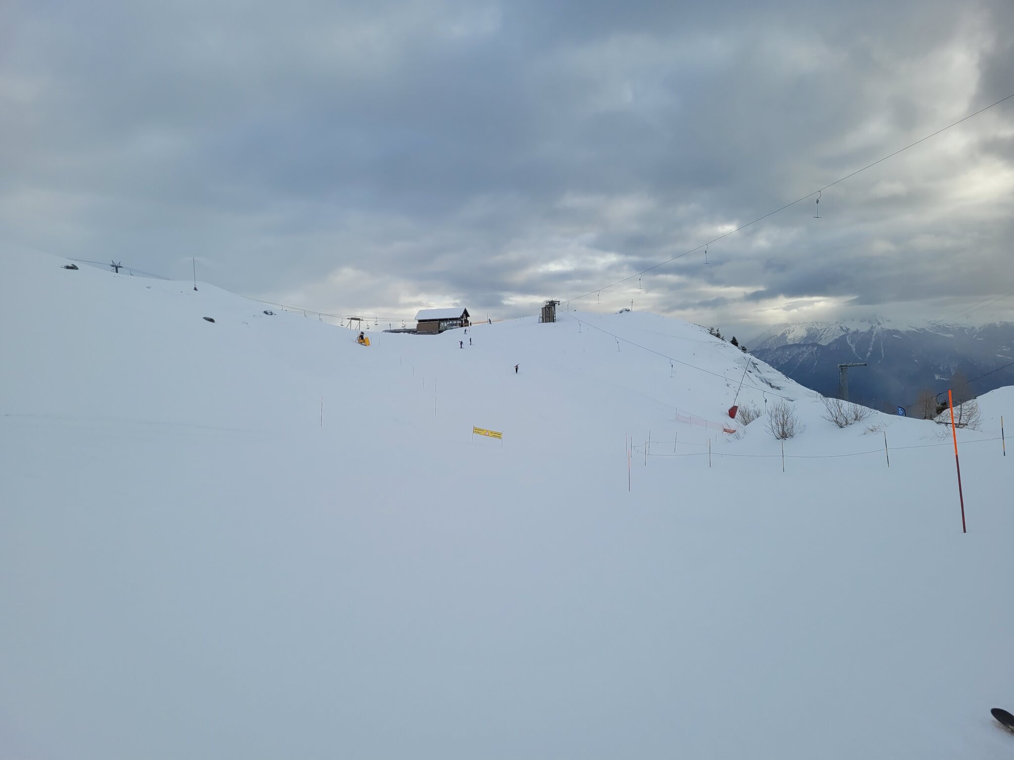 Hier oben kommt plötzlich ein starker Wind auf. An der Kasse wurde ich gefragt, ob ich eine Versicherung abschließen will, weil eventuell am Nachmittag die Lifte schließen. Das habe ich abgelehnt, da man den Skipass bis 12:30 Uhr zurückgeben kann, und dann nur den halbtagespass bezahlen muss. Hoffen wir, dass es bis dahin zumindest durchhält.