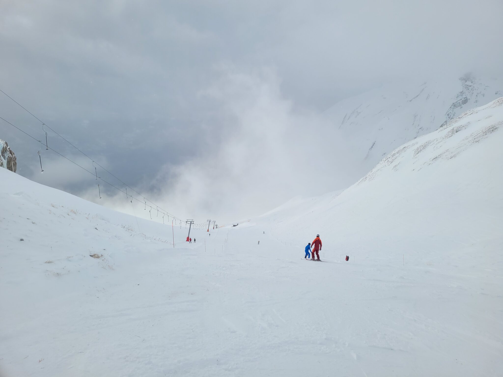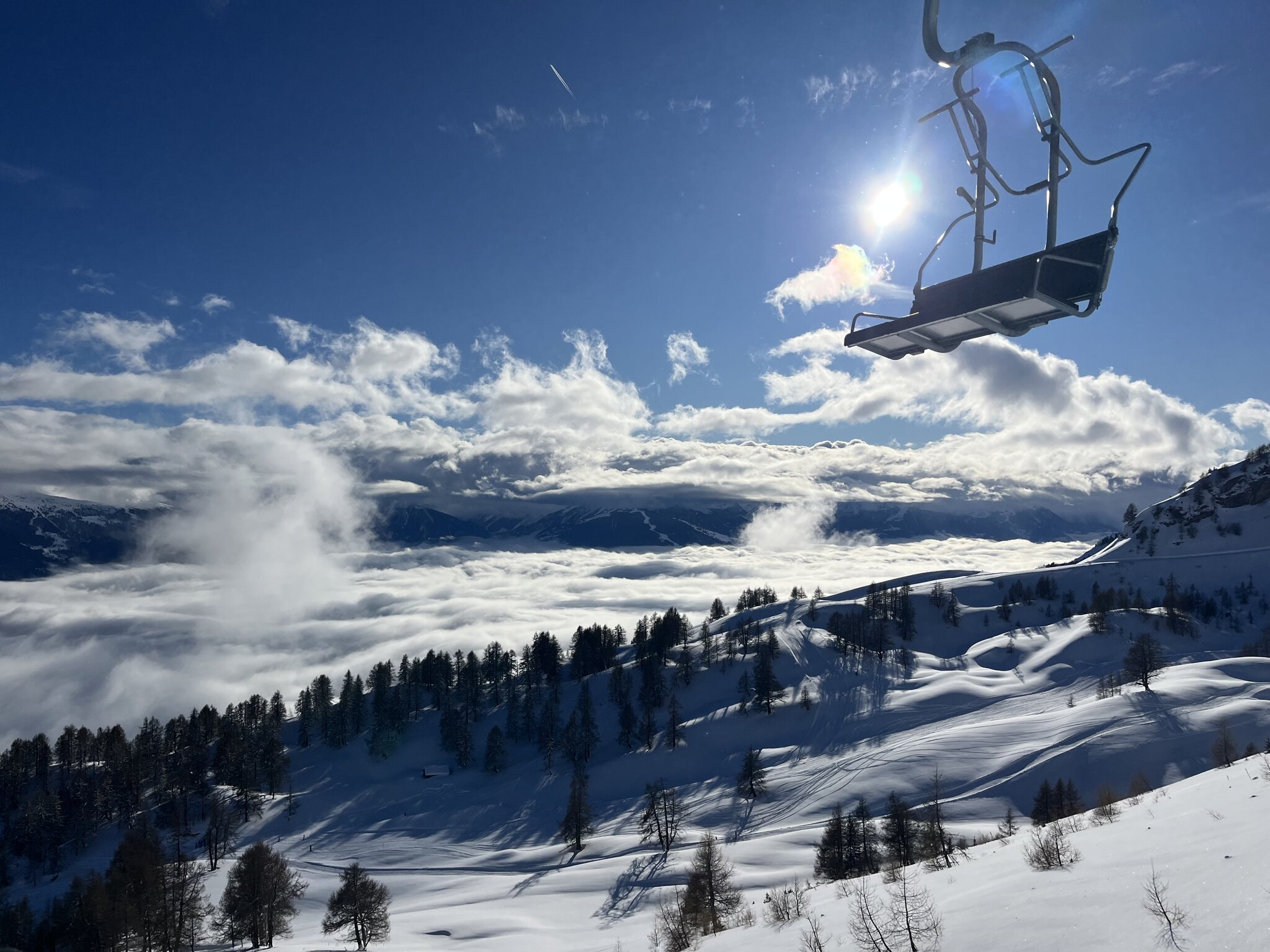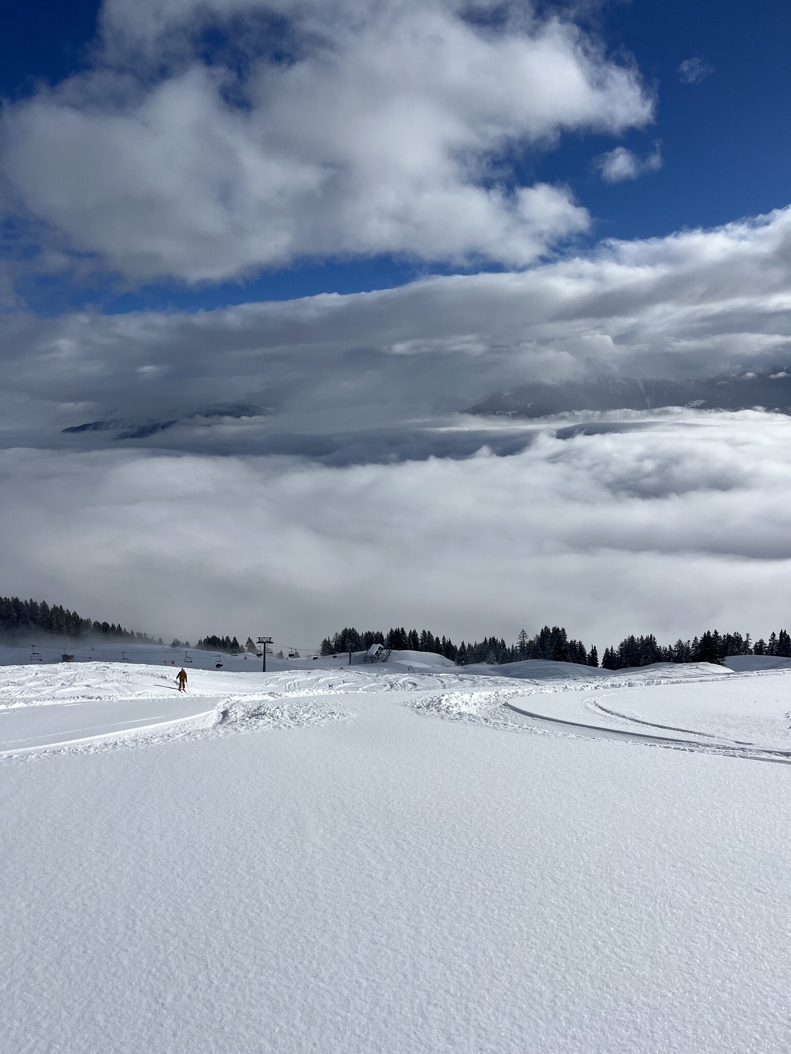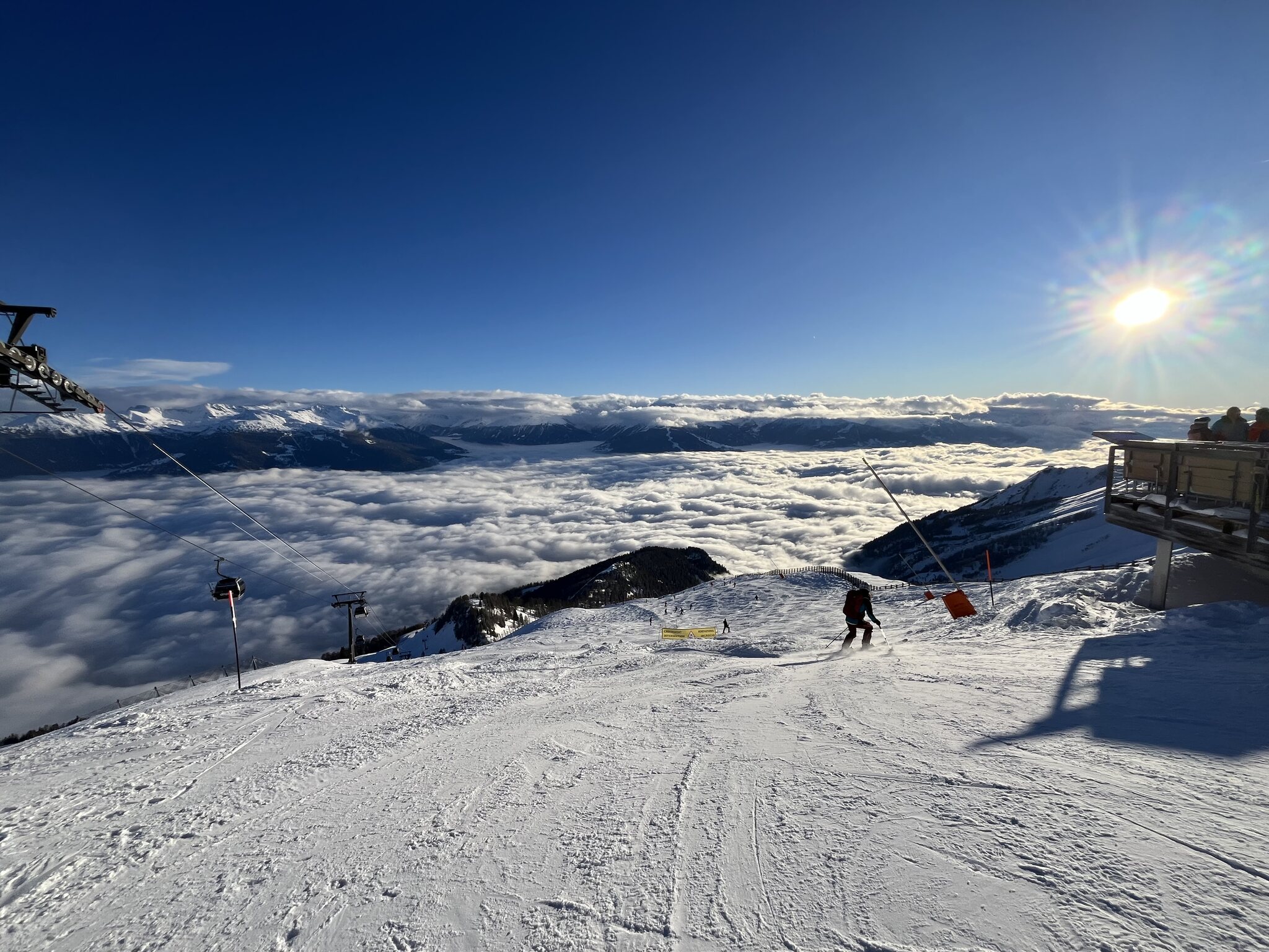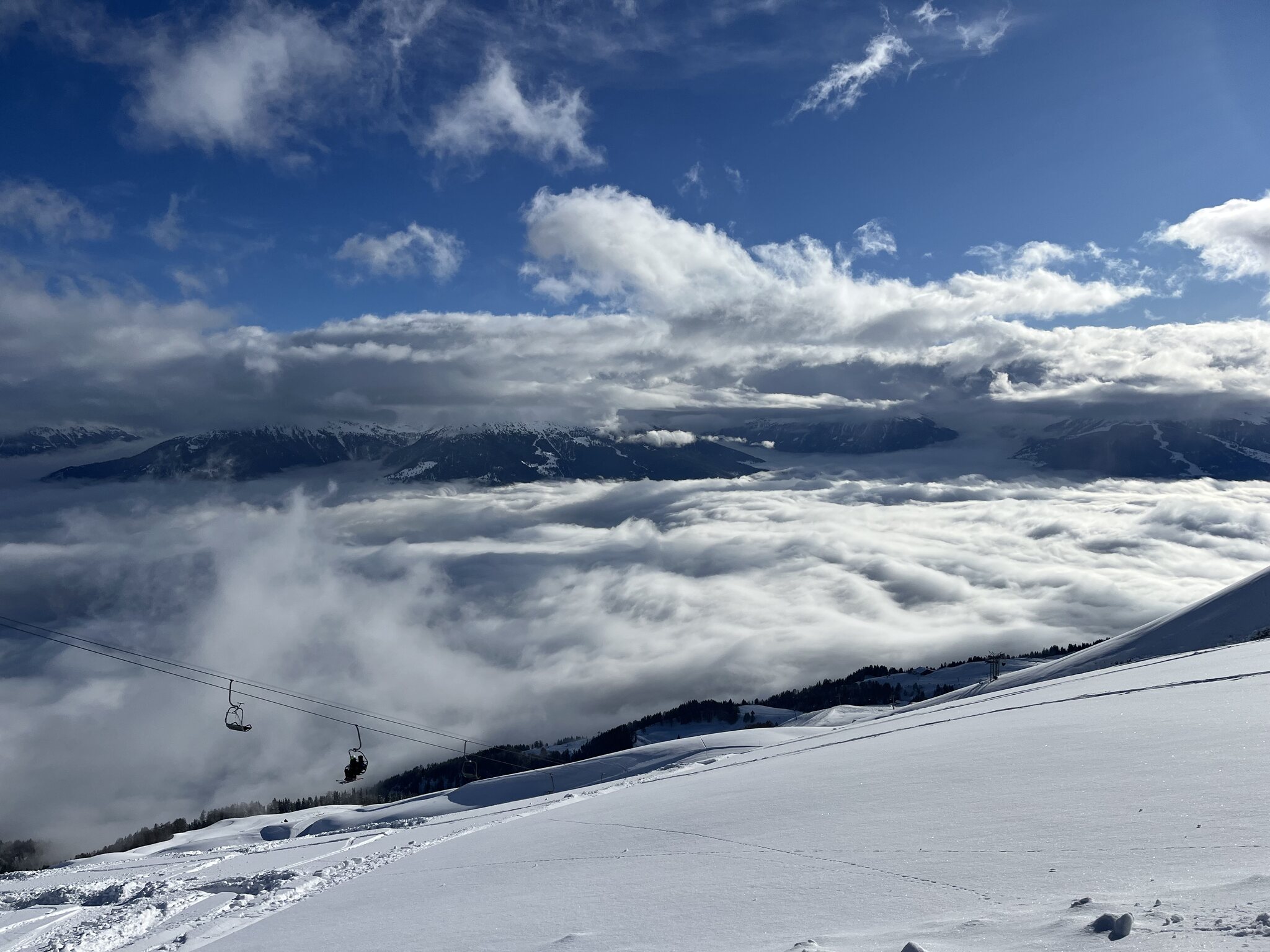 Am Turinschlepper hingen vormittags Wolken. Die blaue Piste war gut, hat aber auch noch Luft nach oben.