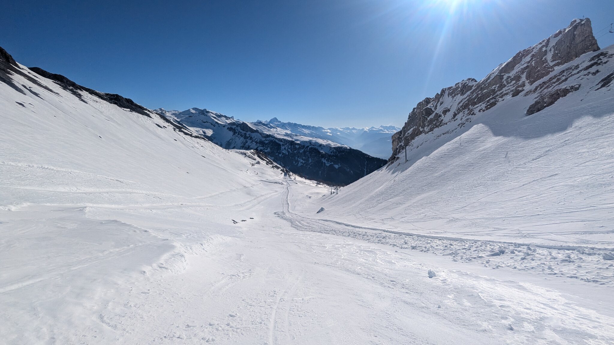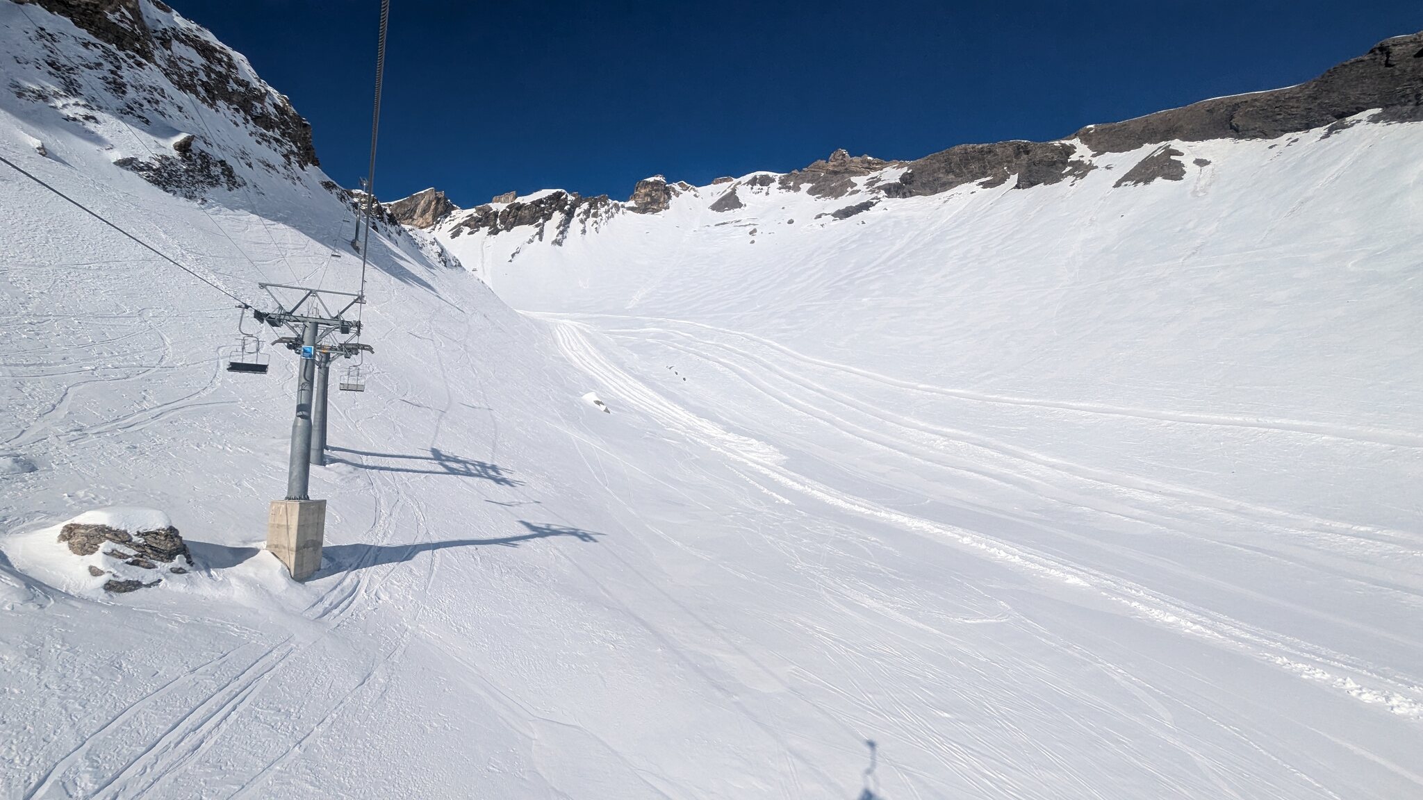 Aus dem Luys Sessel. Die 2 geöffneten Pisten hier scheinen heute die besten zu sein