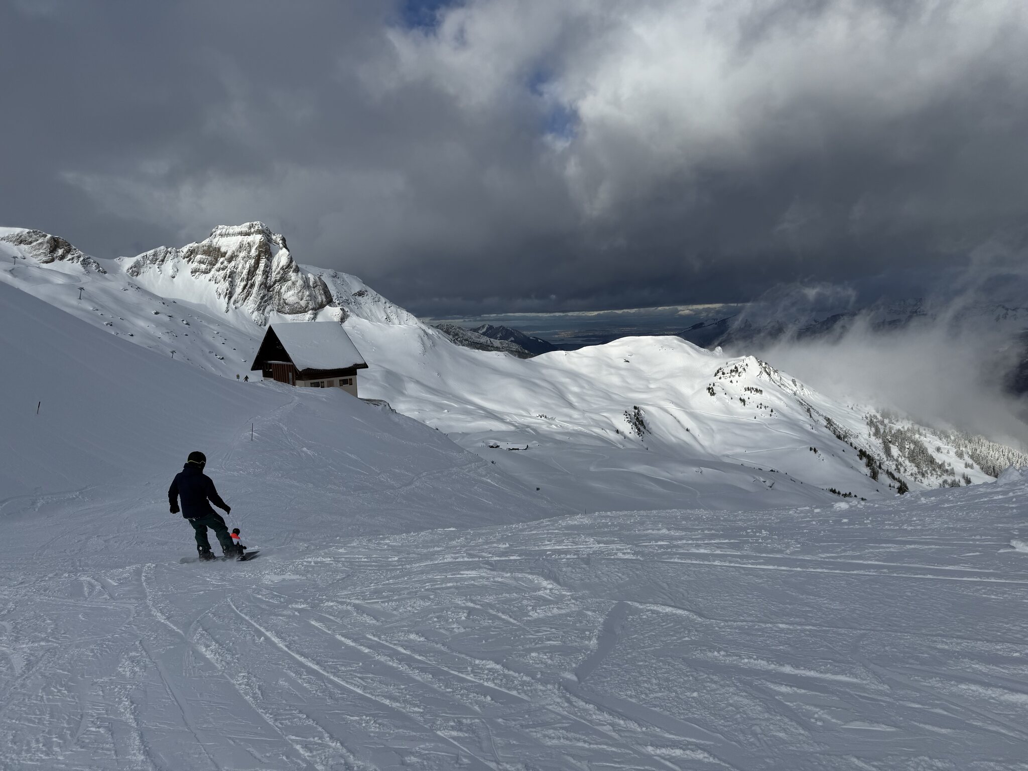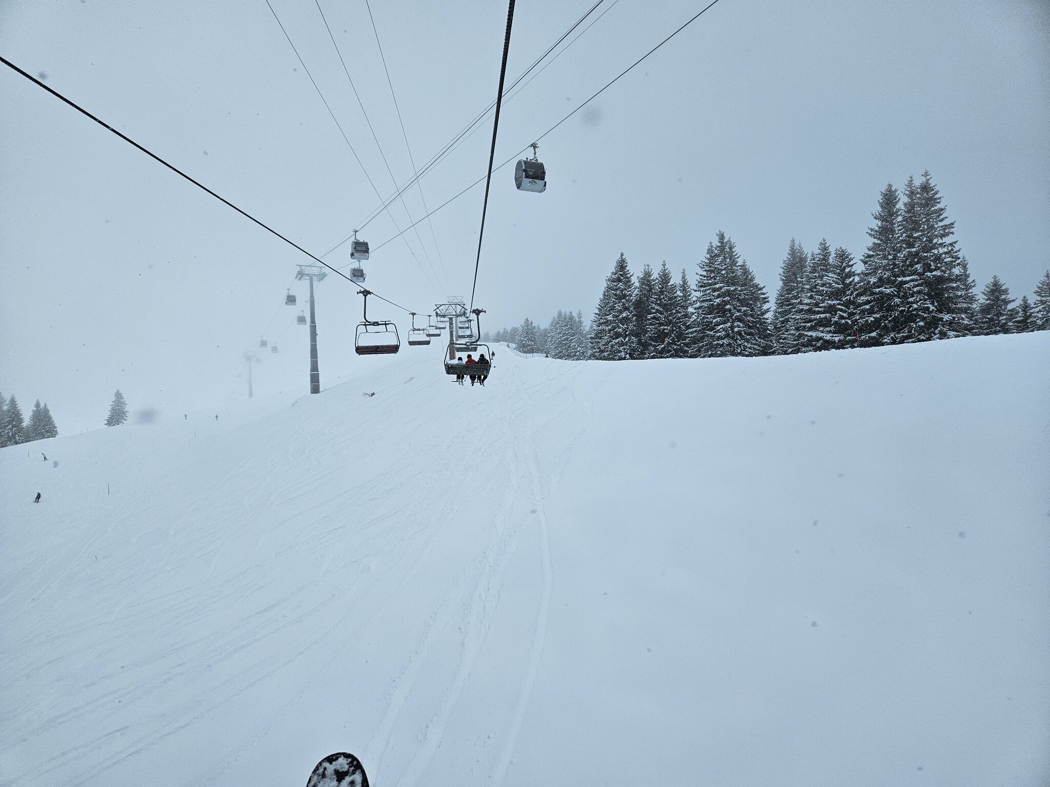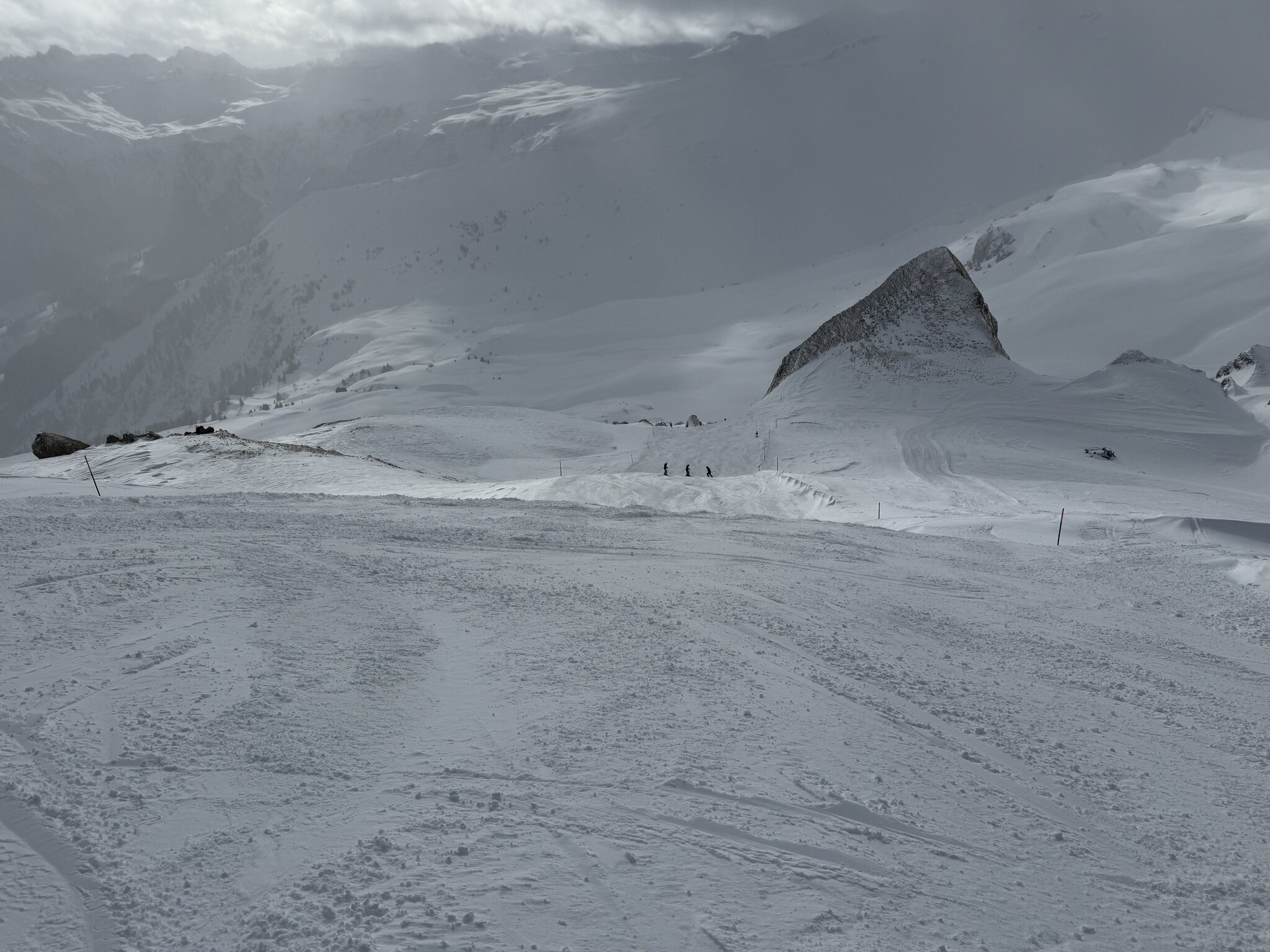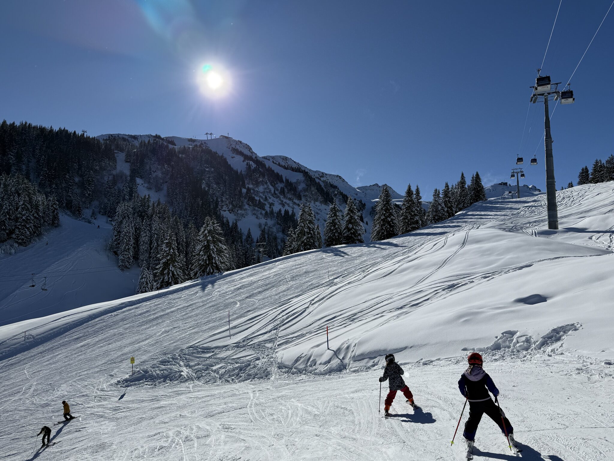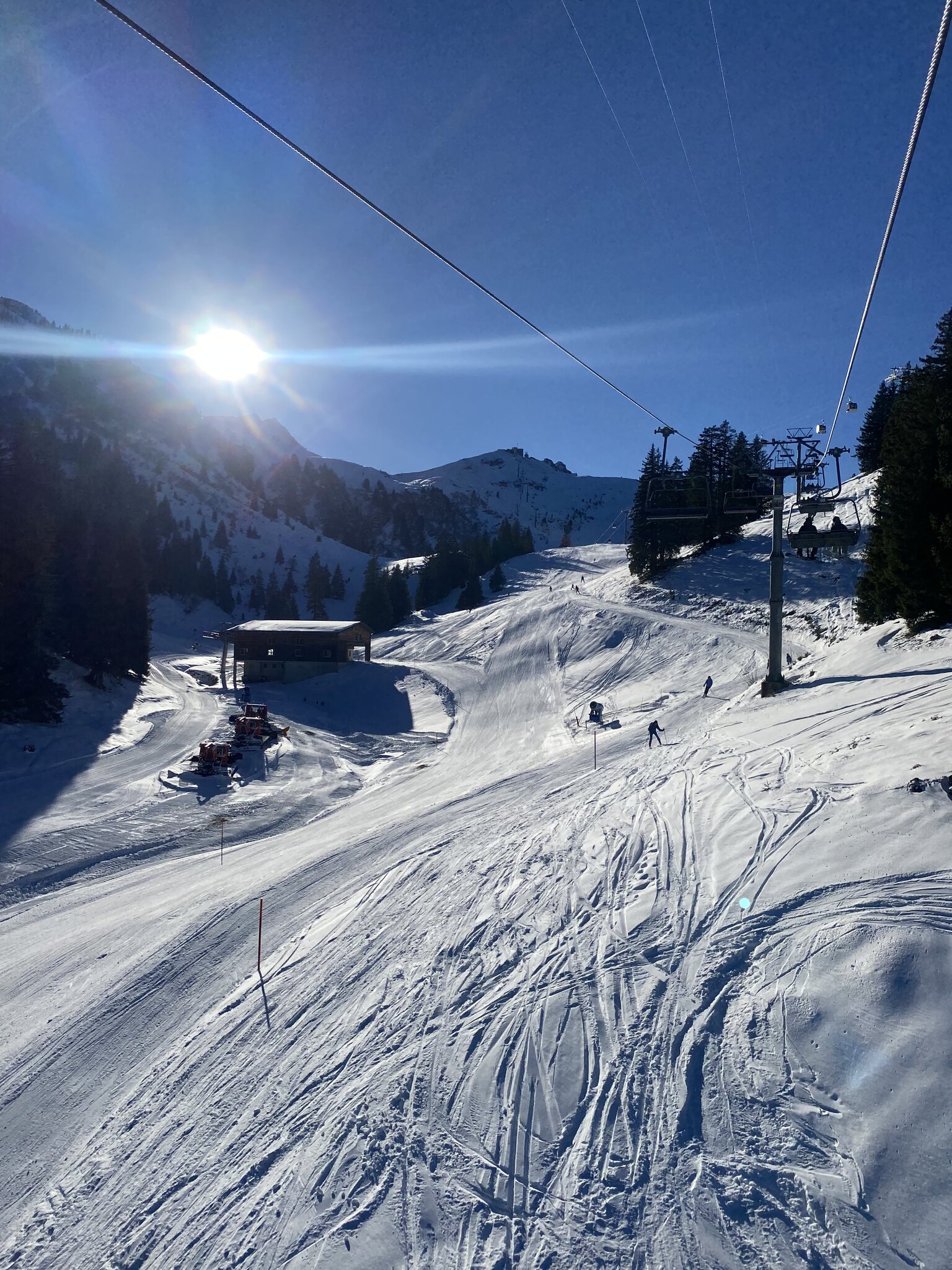 Die Pisten waren wurden an Morgen noch nachpräpariert, anders als wir es von anderen Orten kennen. Trotz Neuschnee erstaunlich gut zu fahren und auch am Nachmittag auf den flächeren Pisten keine Haufenbildung. Off Piste 30-40 cm Pulverschnee, es war grossartig heute!