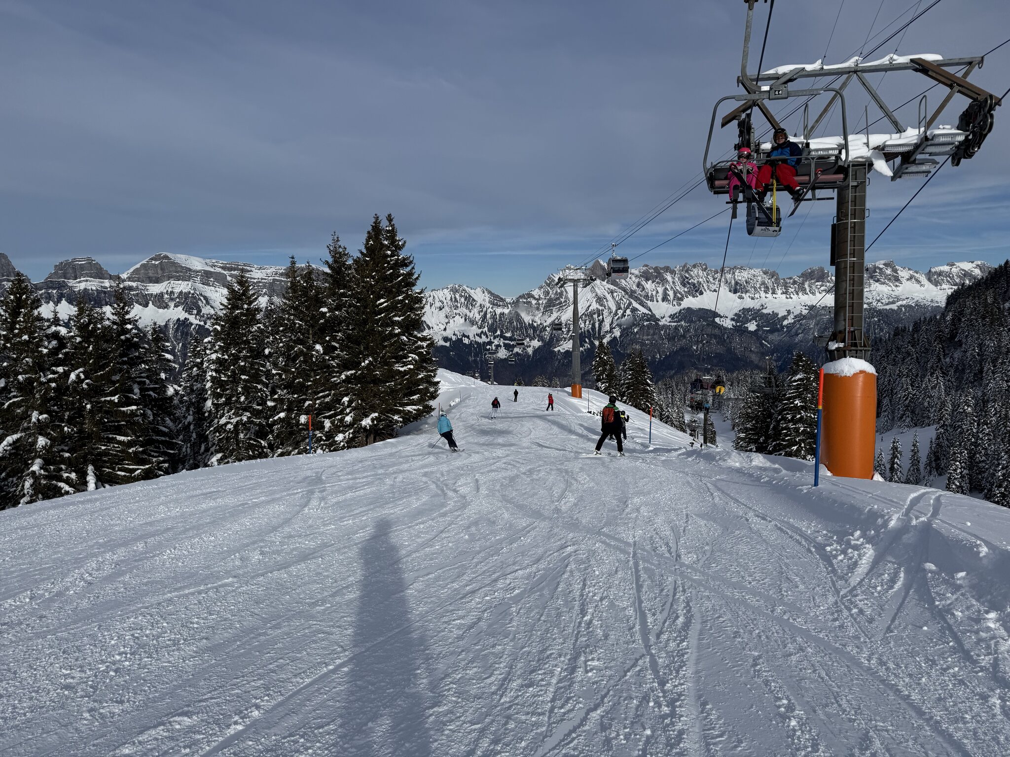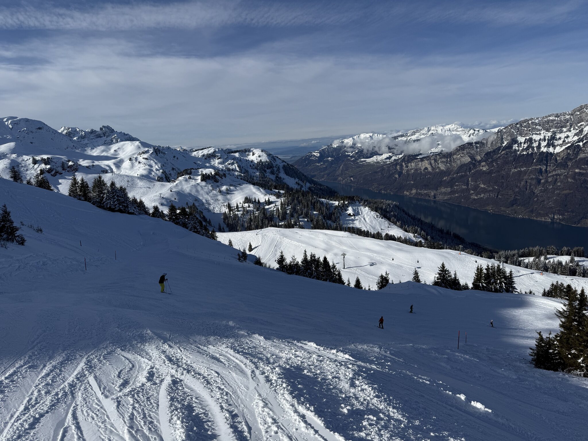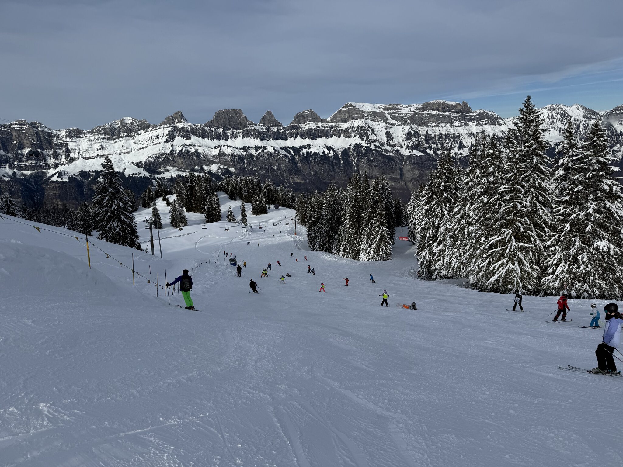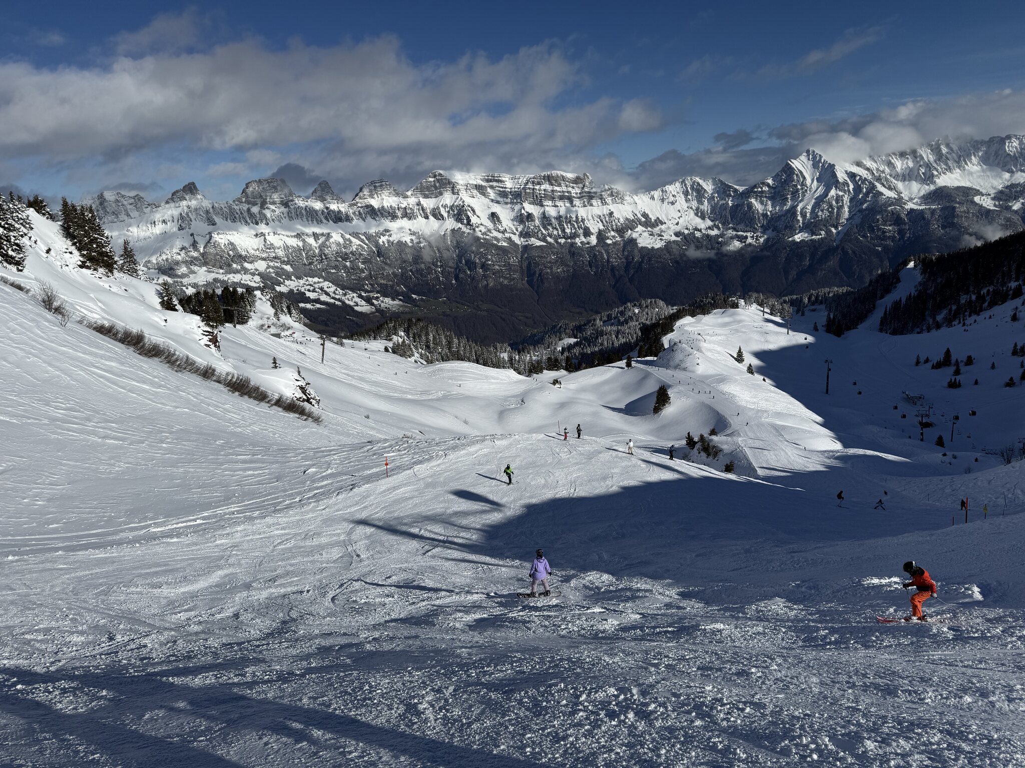 Dank kürzlichem Schneefall ist schon vieles offen, und die Pisten waren heute grösstenteils gut, zum Teil etwas weich.